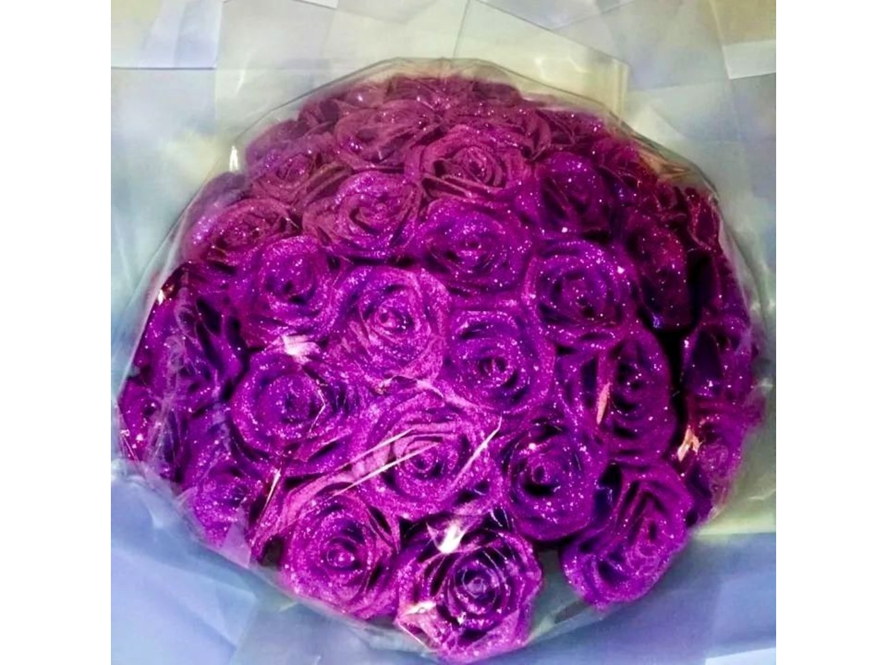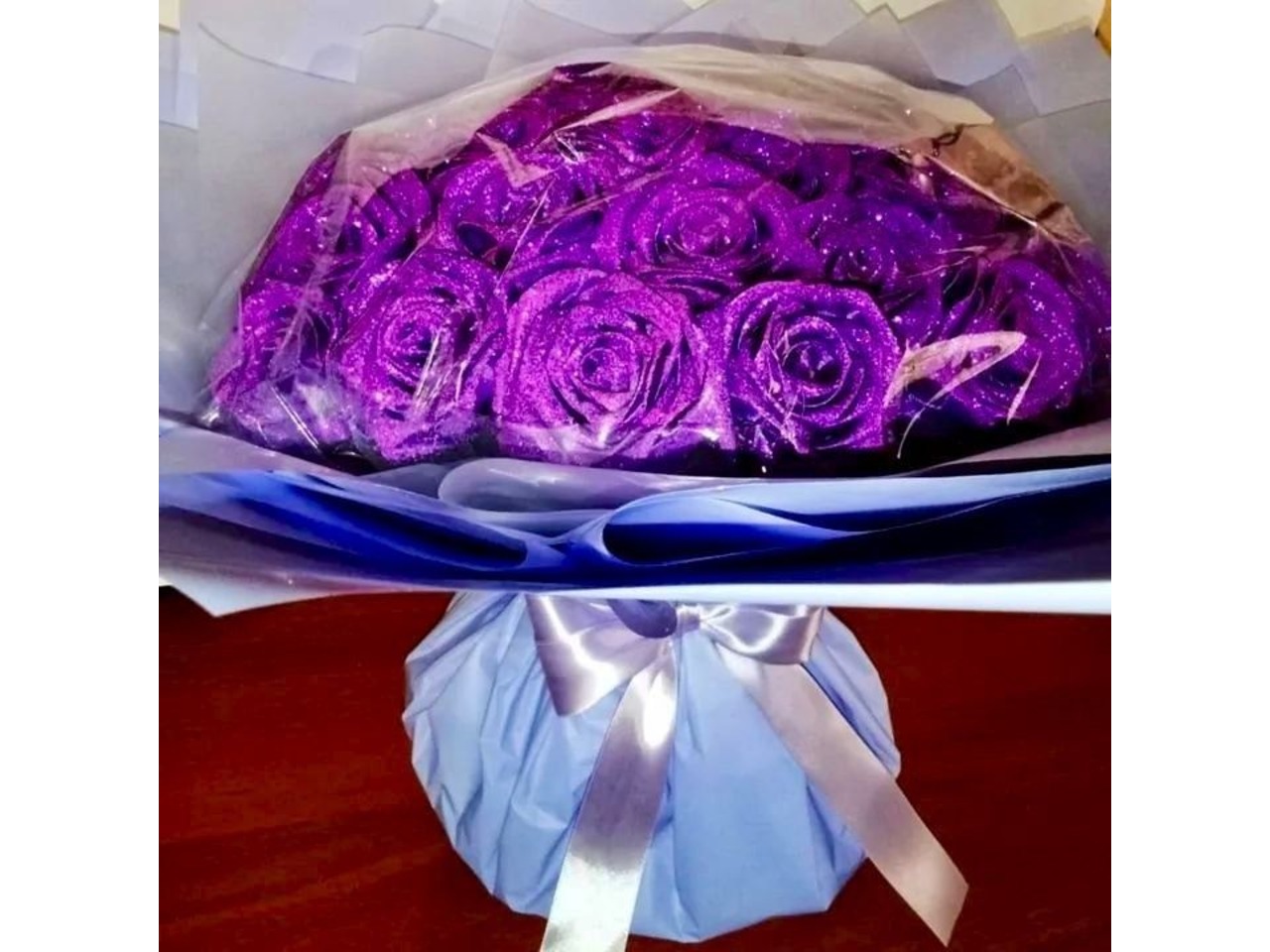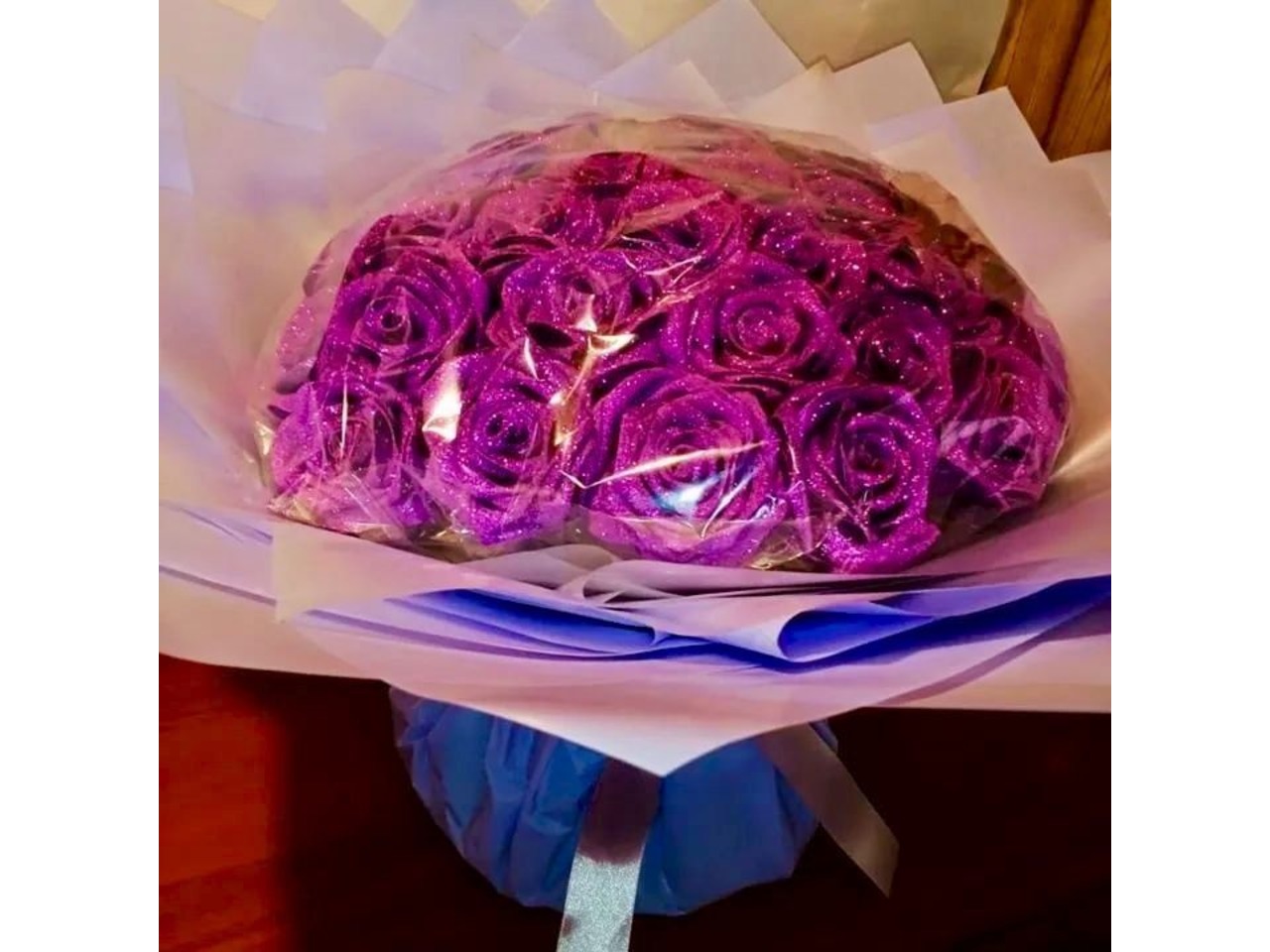 Стильний букет із 19 троянд з атласної стрічки — поєднання класики і блиску. Добре підходить для подарунка.
