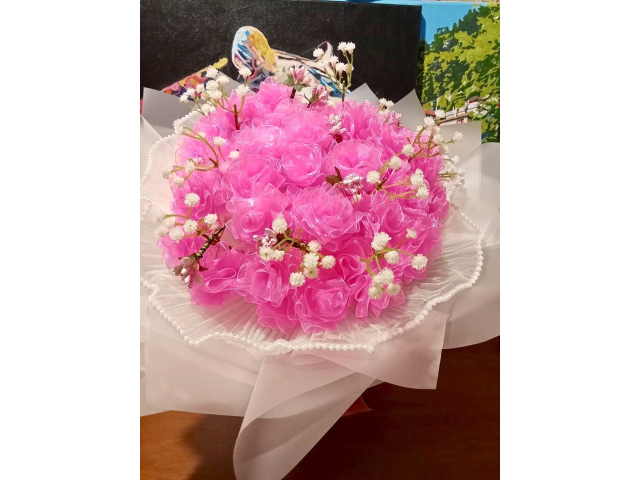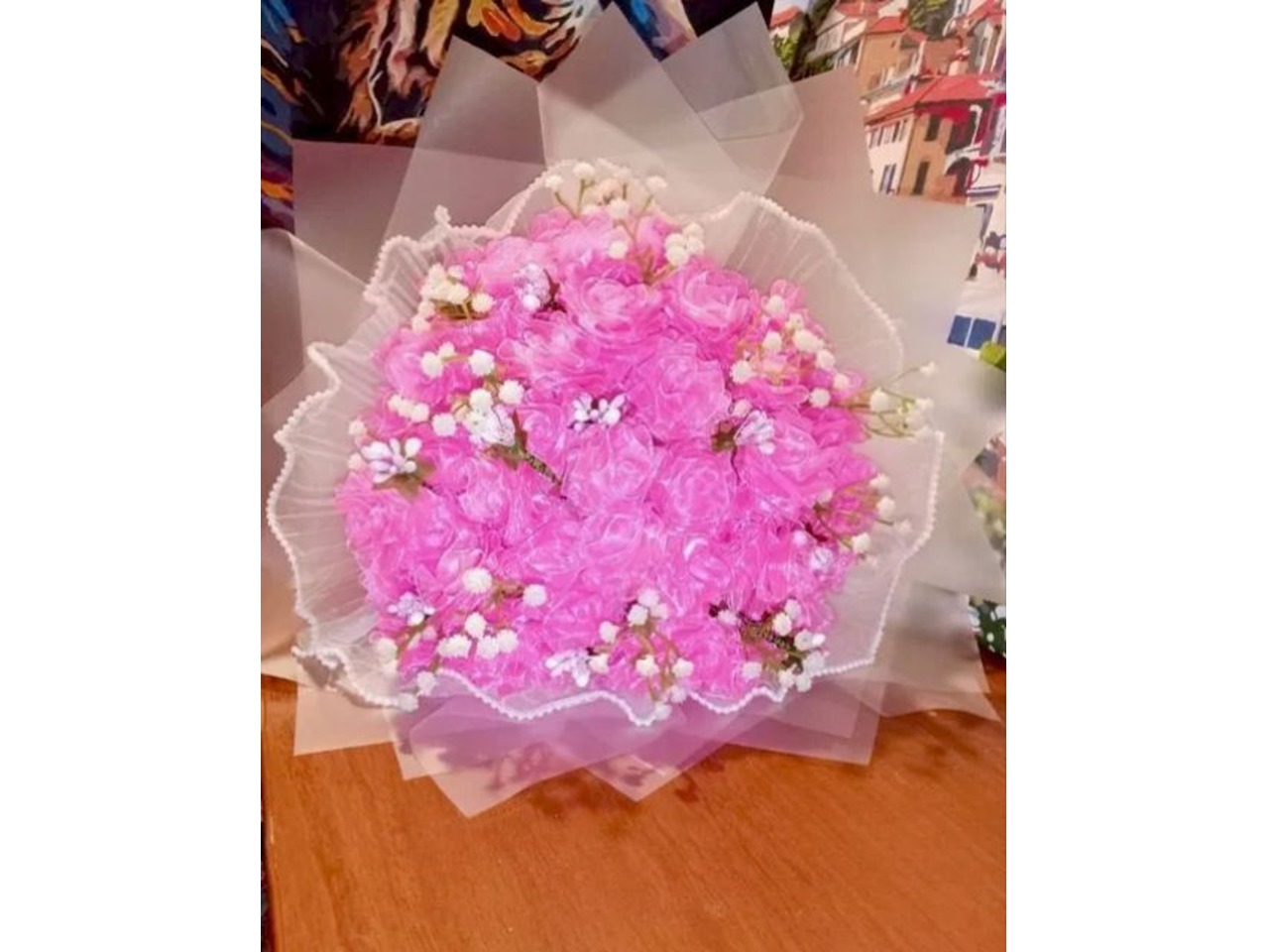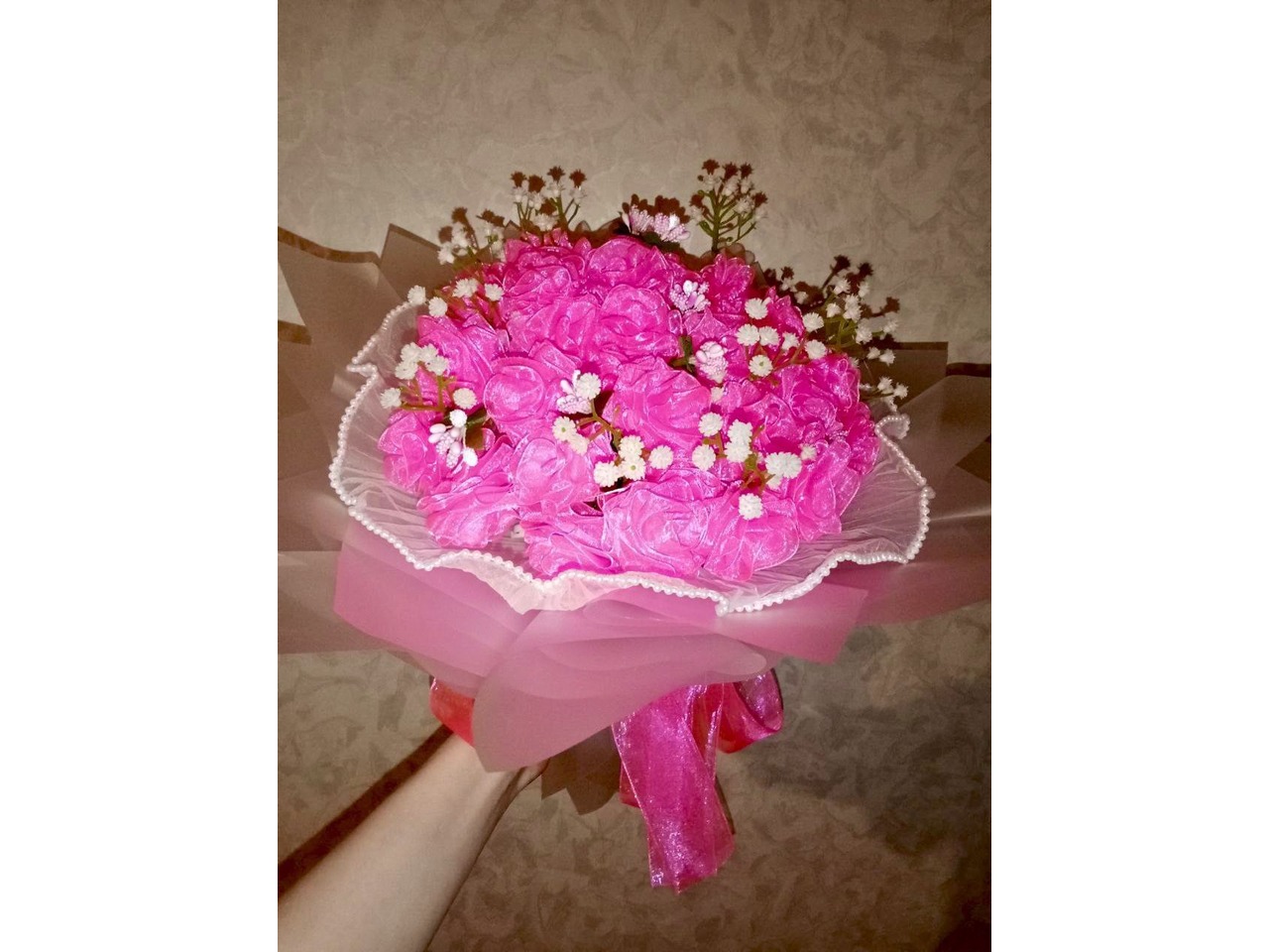 Букет з 51 троянди з органзи у ніжному рожевому відтінку.