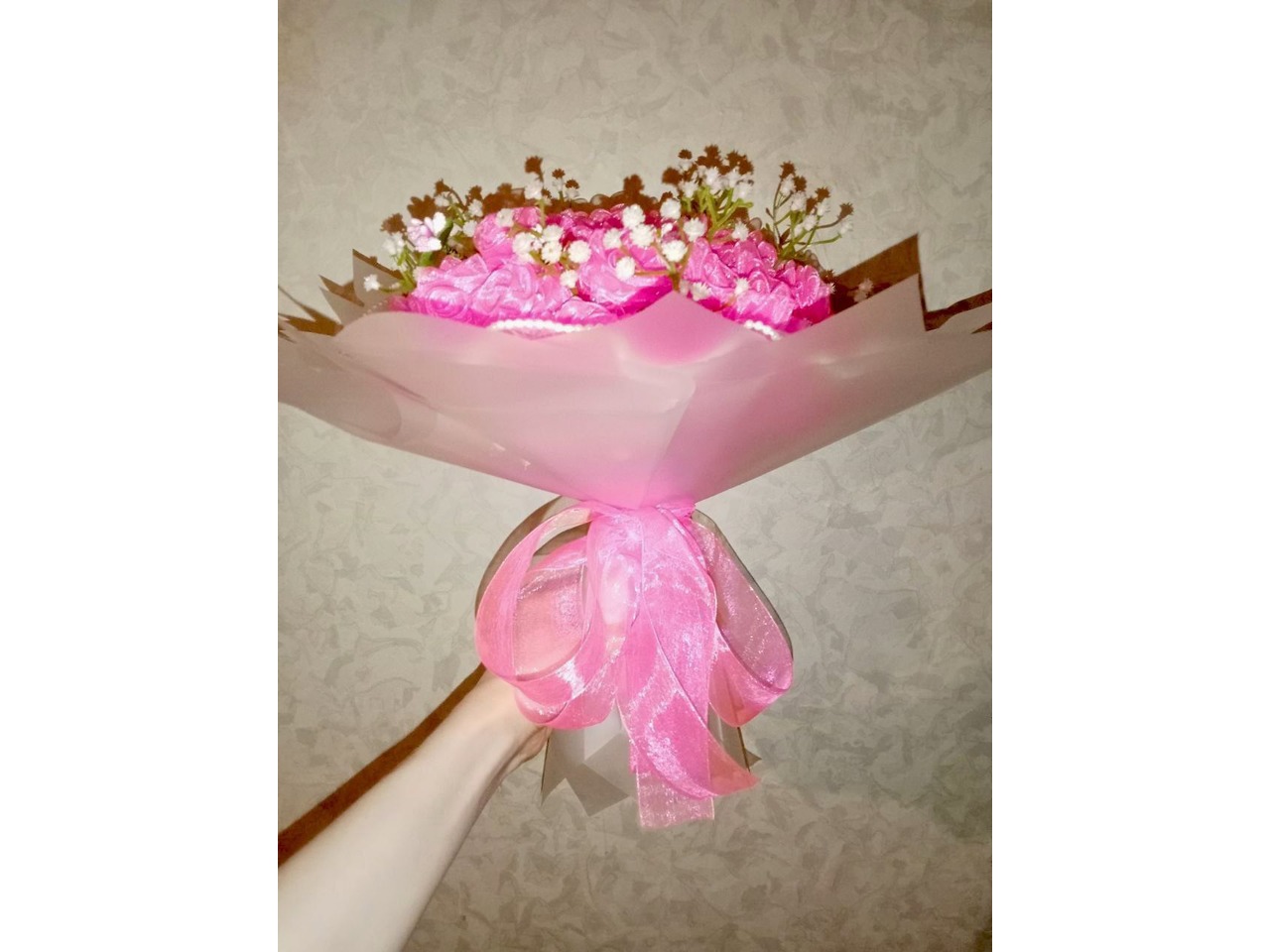 Стильний букет із 19 троянд з атласної стрічки — поєднання класики і блиску. Добре підходить для подарунка.