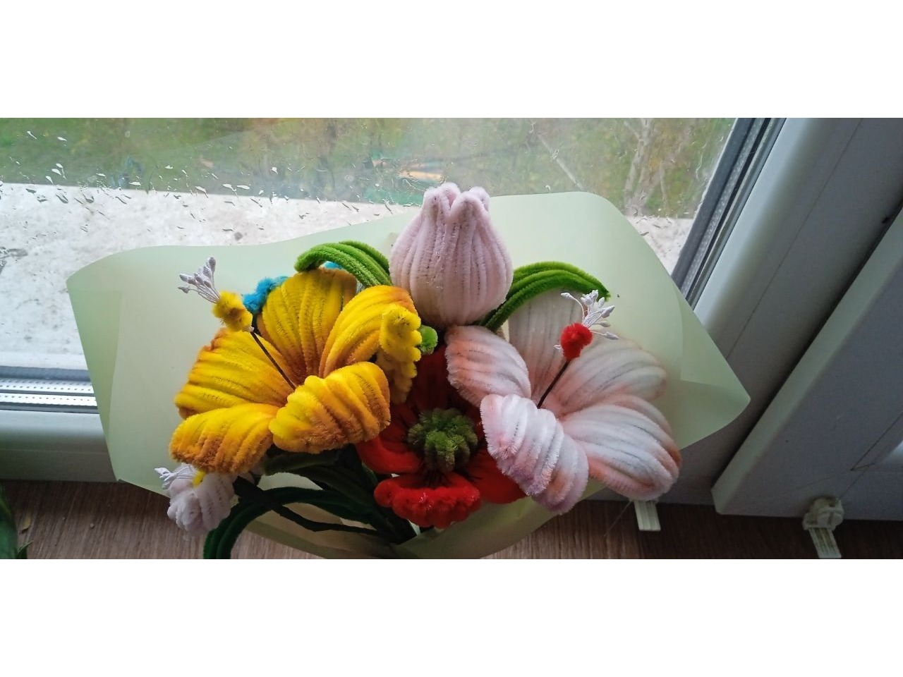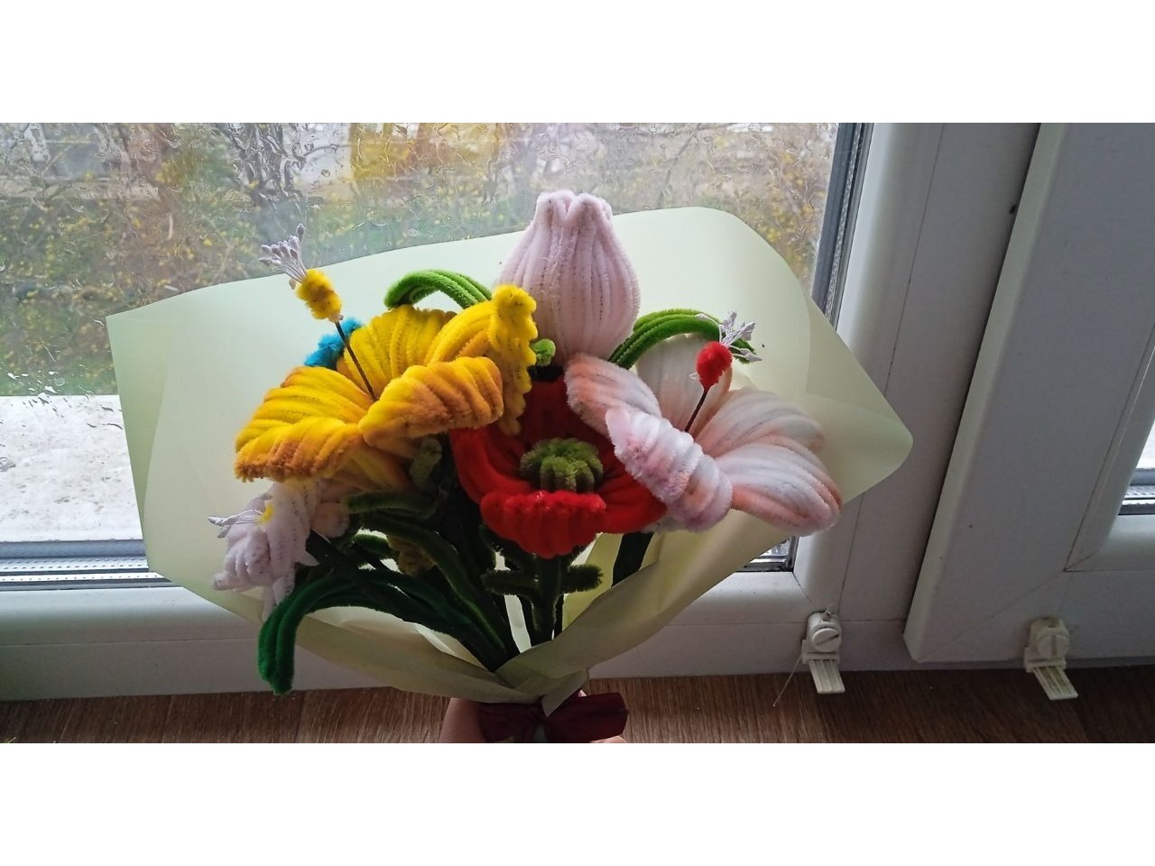букет с синельного дроту який ніколи не зав'яне.зроблен з душою можно щось змінити або добавити