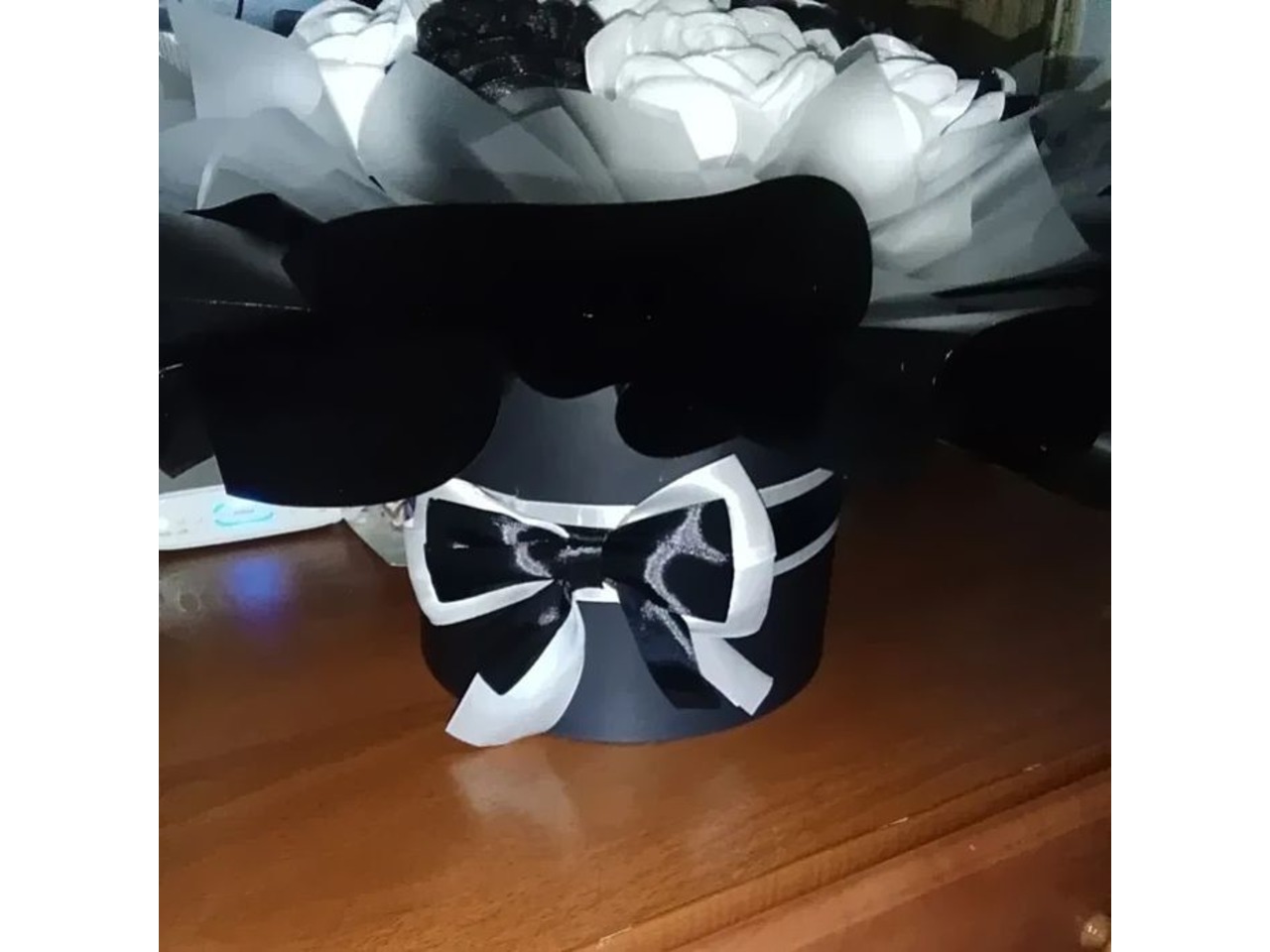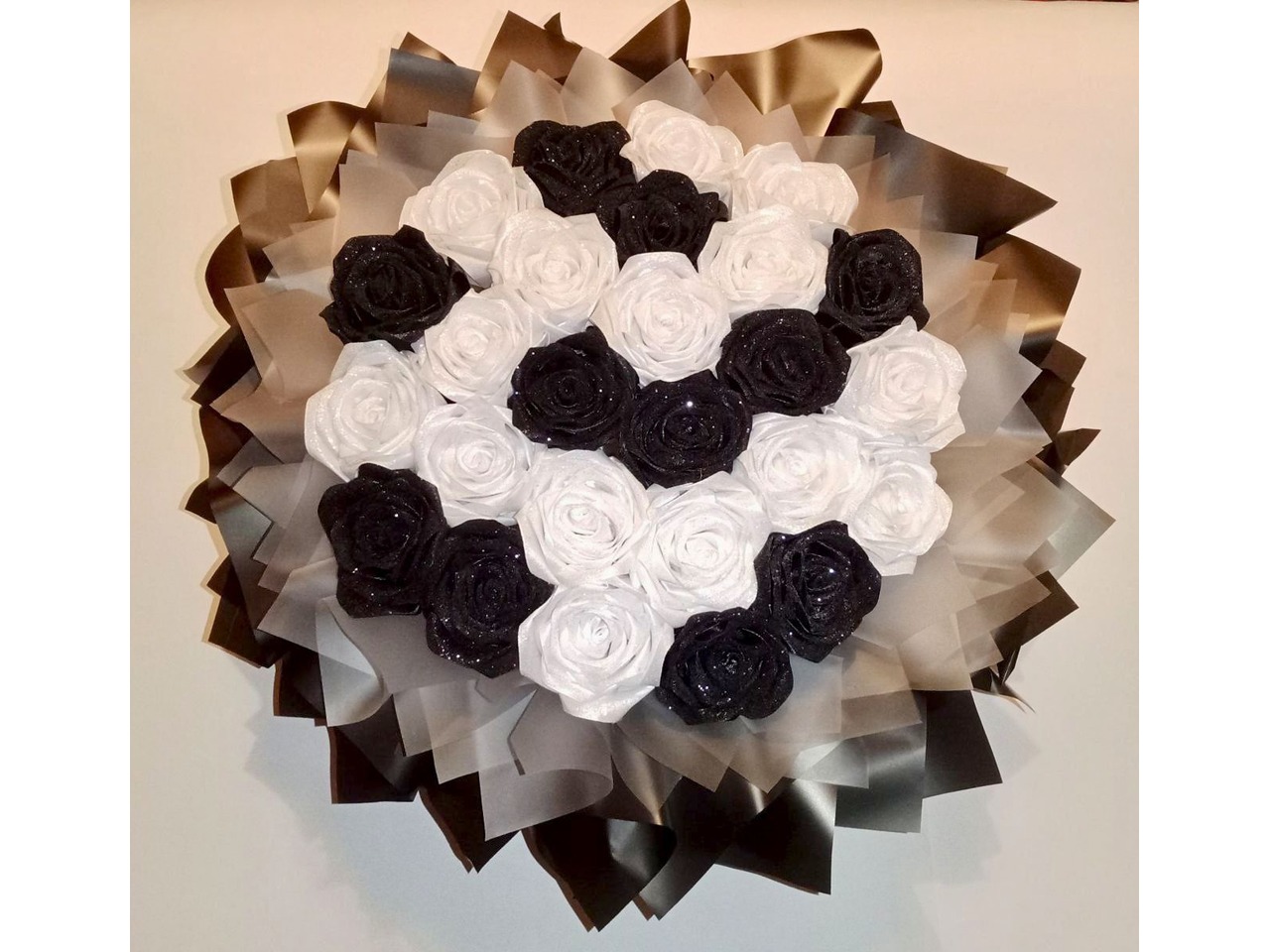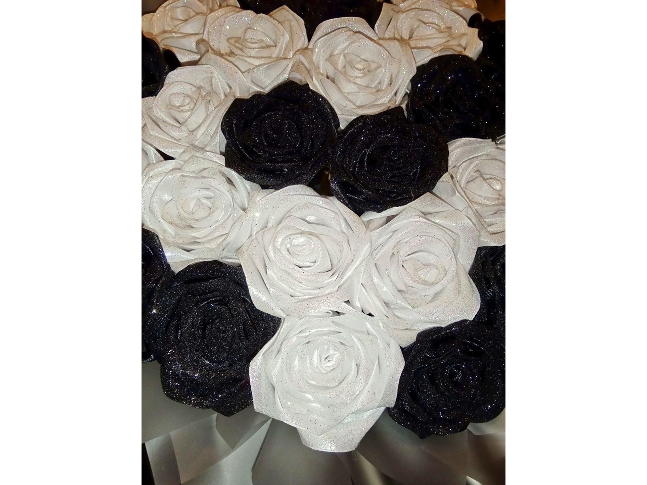 Композиція з 26 чорно-білих троянд ручної роботи з атласної стрічки, прикрашені блискітками.