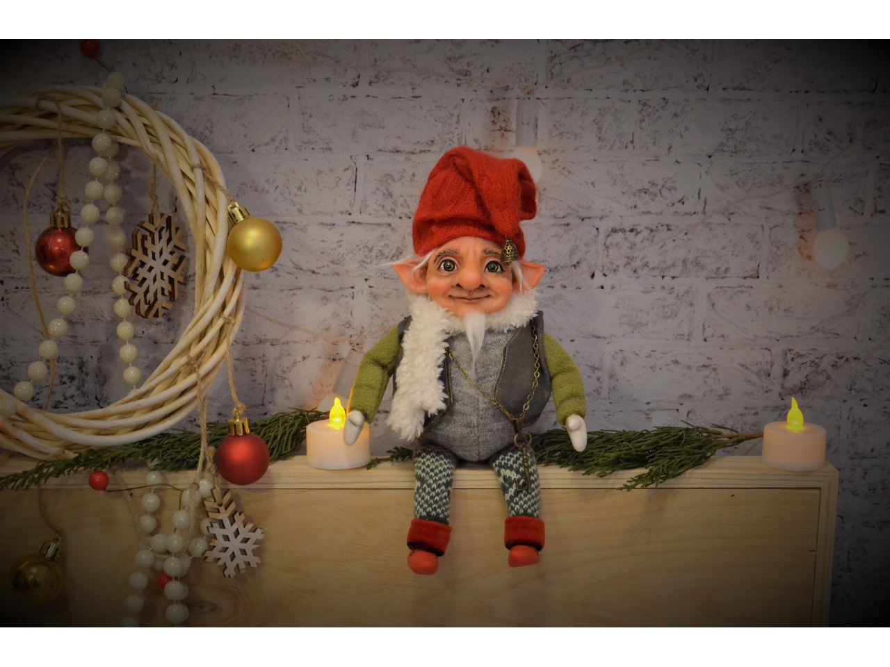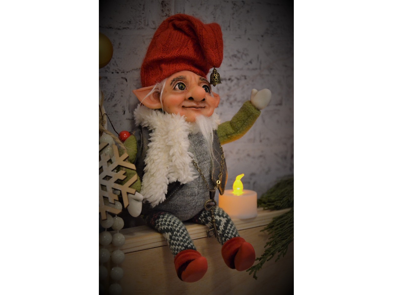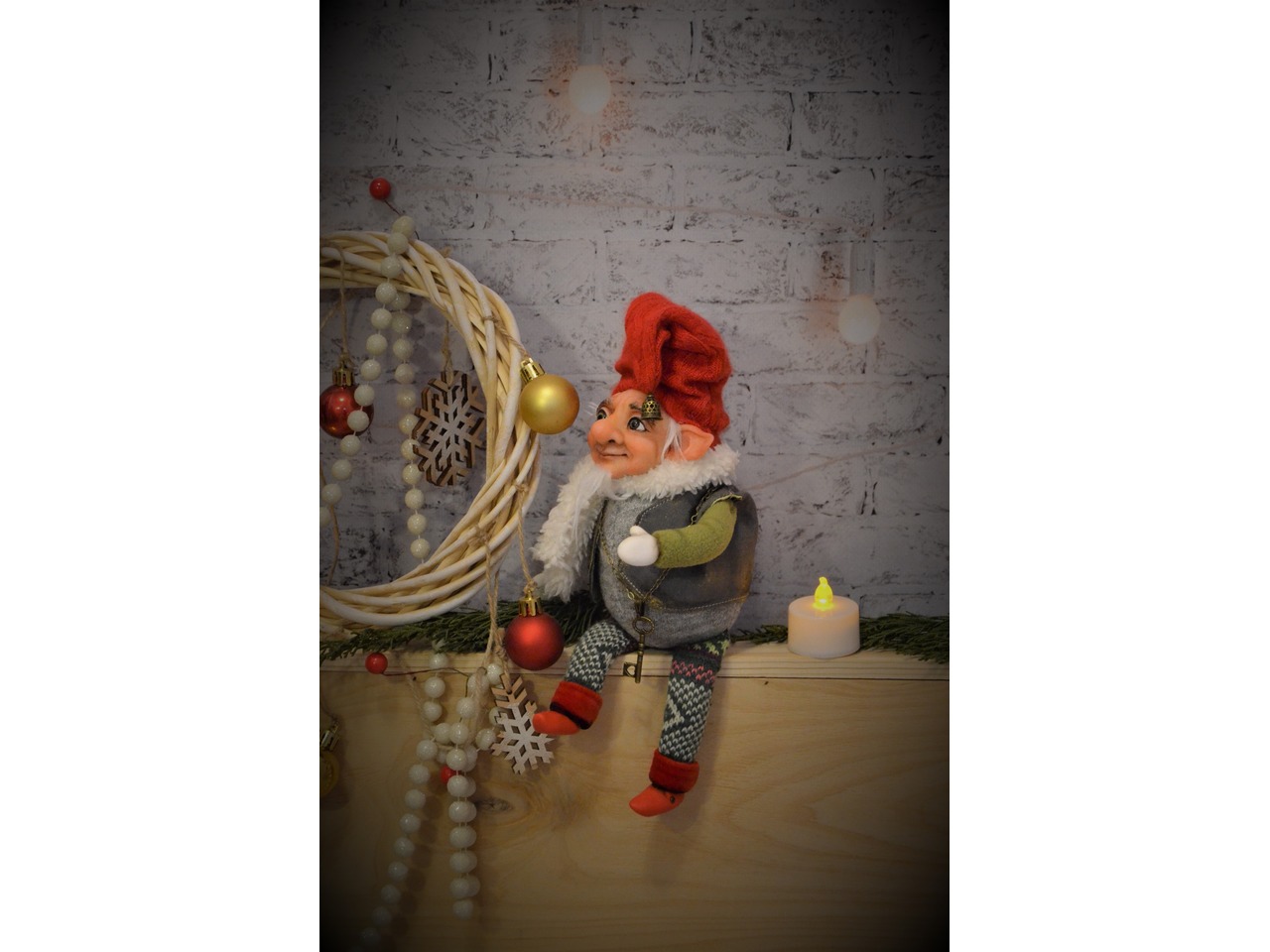 Этот рождественский гном — уникальная интерьерная кукла, созданная вручную в единственном экземпляре.Его образ продуман до мелочей: красная шапочка, зелёная курточка, серый жилет, клетчатые штаны и уютный белый шарф. Доброе лицо с румяными щёчками, выразительными глазами и мягкой улыбкой придаёт кукле живость и характер.Каждая деталь — от одежды до обуви — выполнена вручную с особым вниманием к текстурам и сочетанию цветов.Эта кукла не предназначена для игры — она является художественным объектом, который украсит ваш дом в зимние праздники, станет душевным подарком или частью коллекции авторских работ.