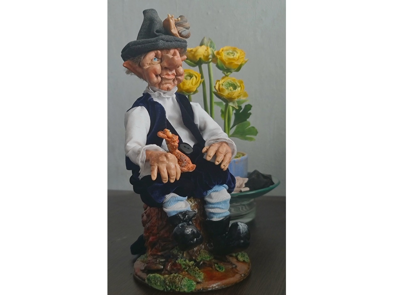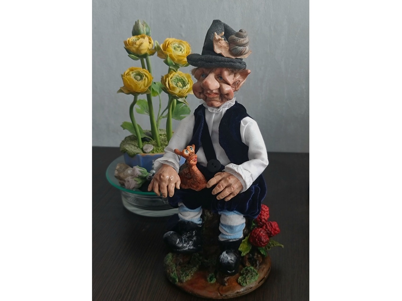 Высота 25 см.использовано разные виды глины:запекаемая,сохнущяя на воздухе и воздушная.кукла сидит на подставке"пенек" сделан из глины.одежда текстильная.куклау можно сгибать