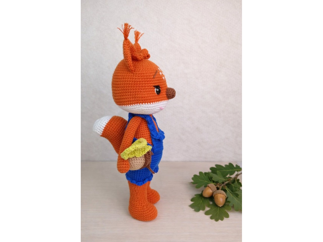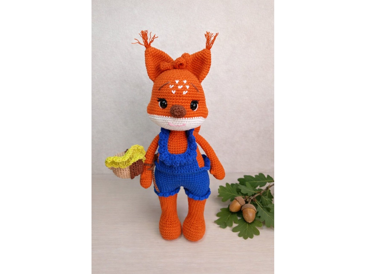 Білочка ручної роботи. Зріст 30 см. Очі на безпечному кріпленні. Одяг не знімається. Жолудь можна знімати і знову кріпити до лапки. В шиї встановлений каркас, завдяки чому білочка може злегка нахиляти голову. Самостійно іграшка стояти не вміє. Наповнювач - холлофайбер.Відправляю у прозорому подарунковому пакеті і поштовій картонній коробці.