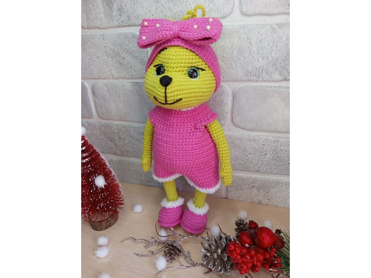 Грінч дівчинка м'яка іграшка, ручна робота. Зріст - 27 см. Очі на безпечному кріпленні. Пов'язочка і комбінезончик знімаються.У дівчинки є друг-хлопчик Грінч у червоному вбранні.
