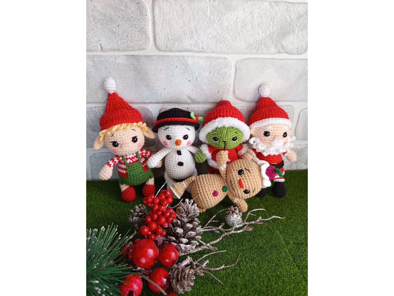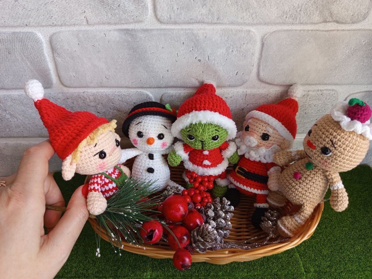 Наборчик маленьких іграшок до Нового року. Зріст кожної біля 13 см. очі на безпечному кріпленні. У сніговичка та Грінча шапочки знімаються. Можна використовувати іграшки в якості іграшок на ялинку (за бажанням прикріплю стрічку).Ціна вказана за 5 іграшок. Можливо замовити по одній іграшці (ціна буде 150 грн).