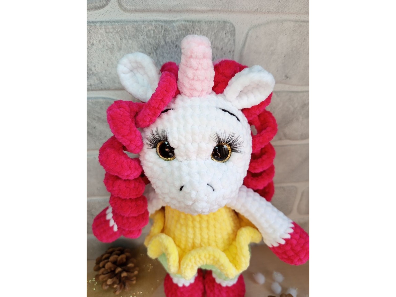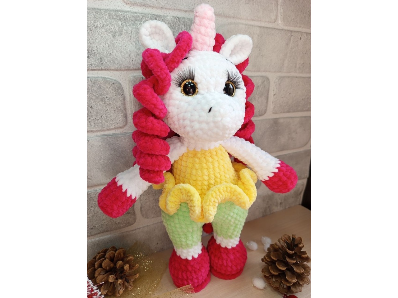 Єдиноріжка з плюшу. Зріст 30-31 см. Дуже приємна на дотик, м'якенька. Очі на безпечному кріпленні. Самостійно не вміє стояти, тільки з опорою.