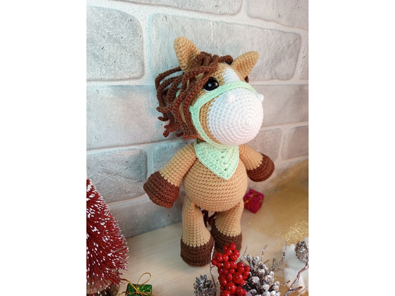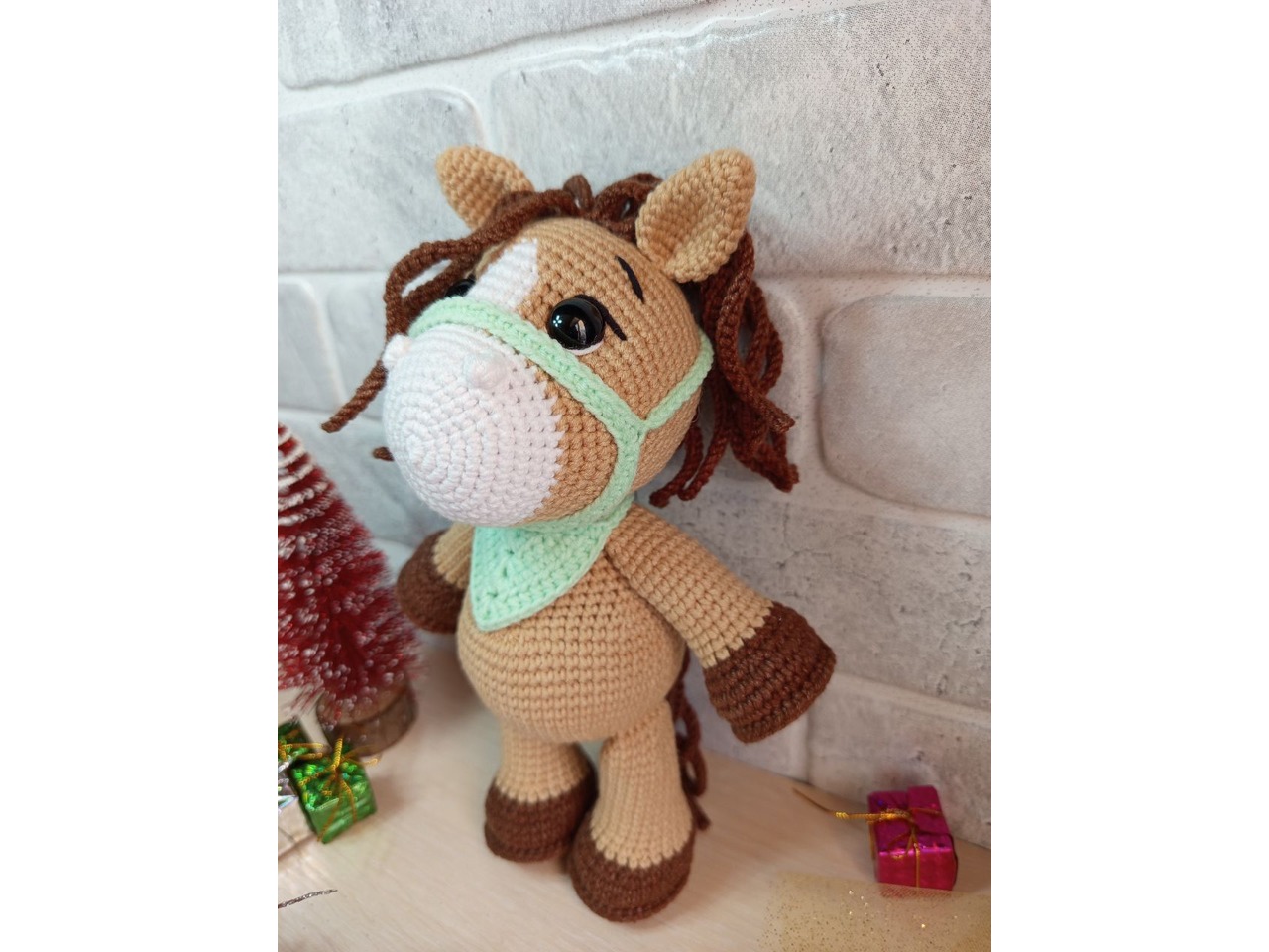 Конячка ручної роботи. Зріст 23 см. Очі на безпечному кріпленні, матеріали - гіпоалергенні, наповнювач - холофайбер. Хустка та вуздечка знімаються. За Вашим бажанням можна змінити колір хусточки.Відправляю в подарунковому пакеті та картонній коробці.