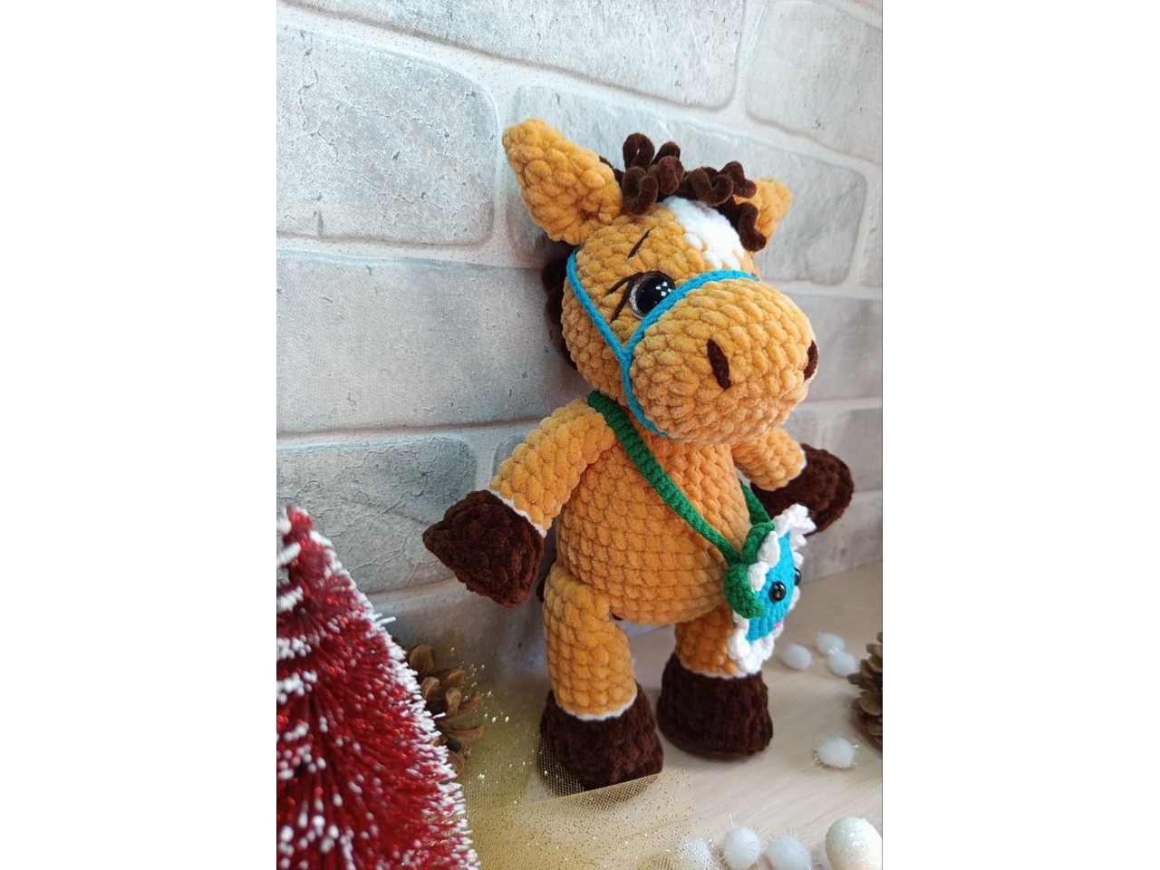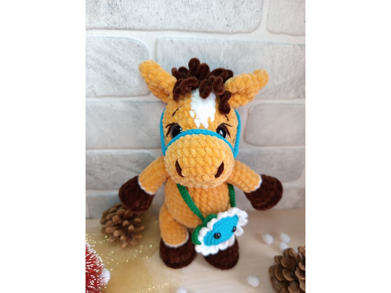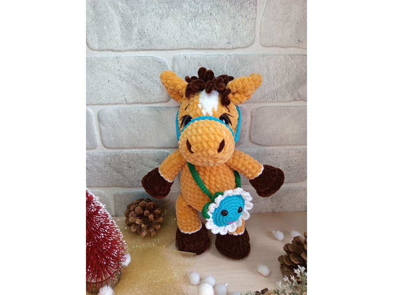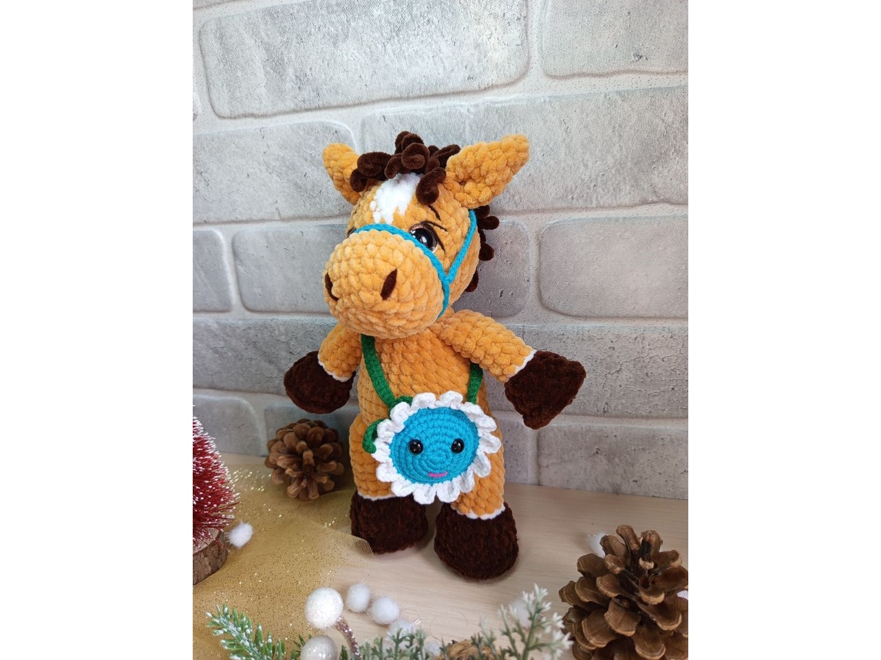 Конячка плюшева, зріст 25 см. Очі на безпечному кріпленні. Сумочка-ромашка знімається. Самостійно стояти не вміє. Наповнювач - холофайбер.