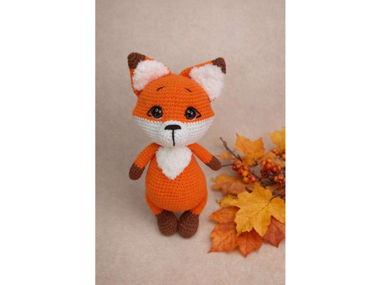 Лисичка ручної роботи. Зріст 22 см. Очі на безпечному кріпленні. Самостійно стояти не вміє. Наповнювач - холлофайбер.