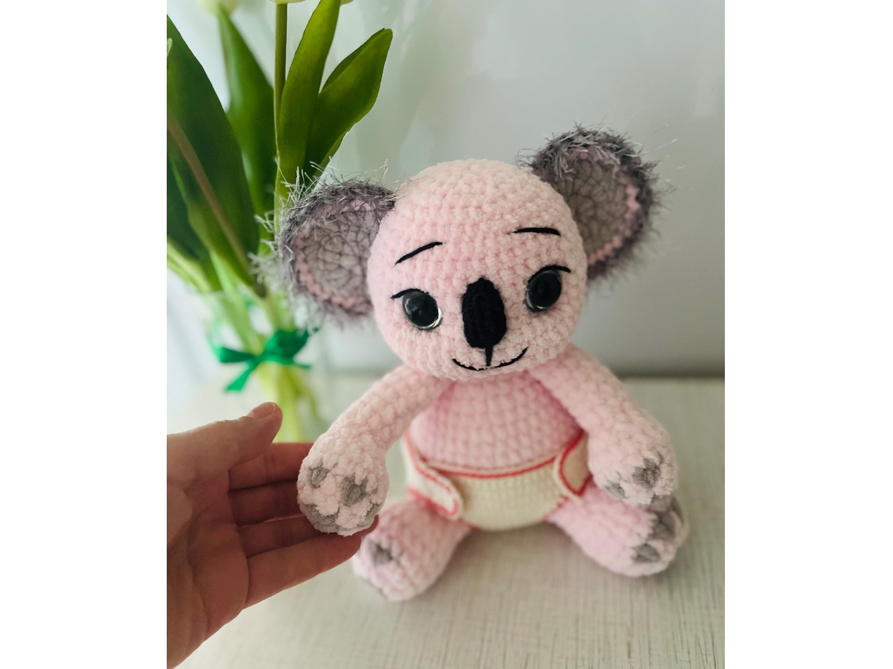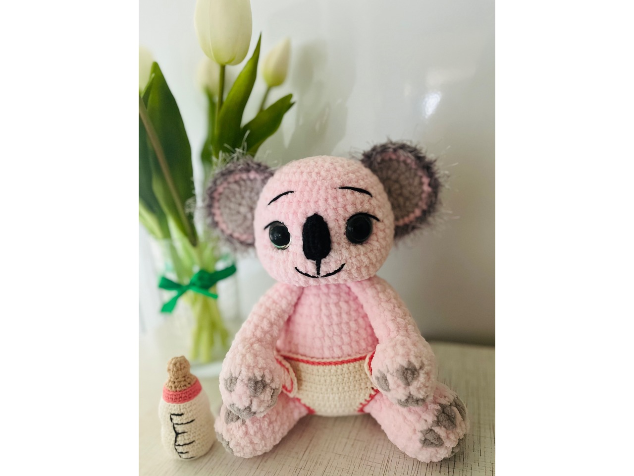 Мʼяка іграшка з плюшевої пряжі, наповнювач холофайбер, трусики знімаються, у комплекті пляшечка