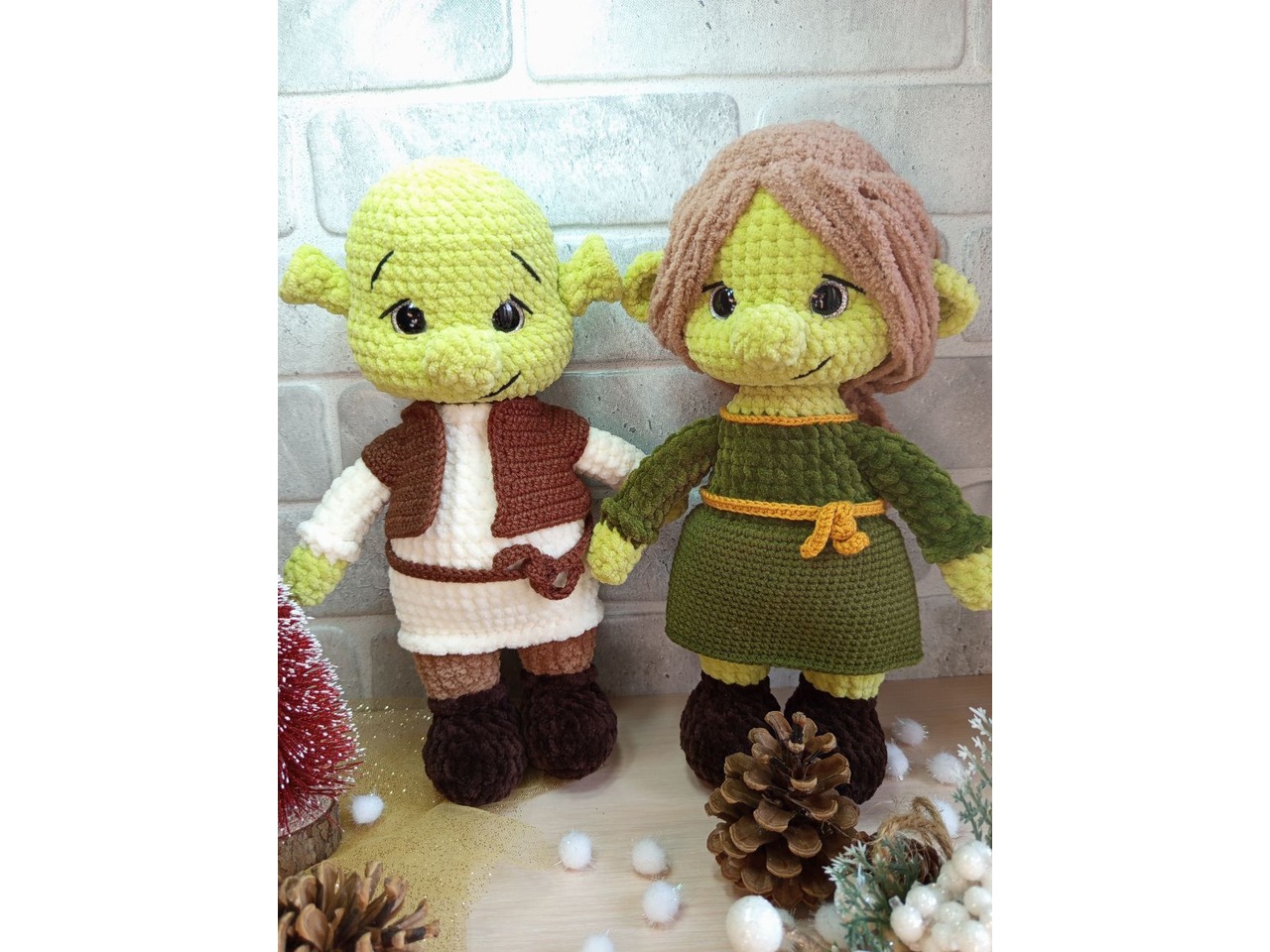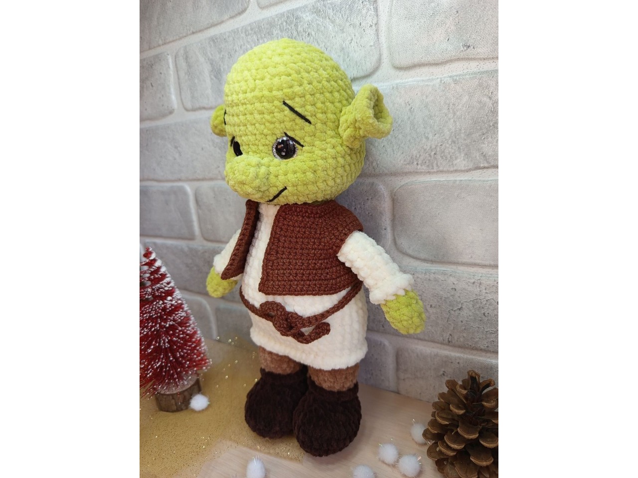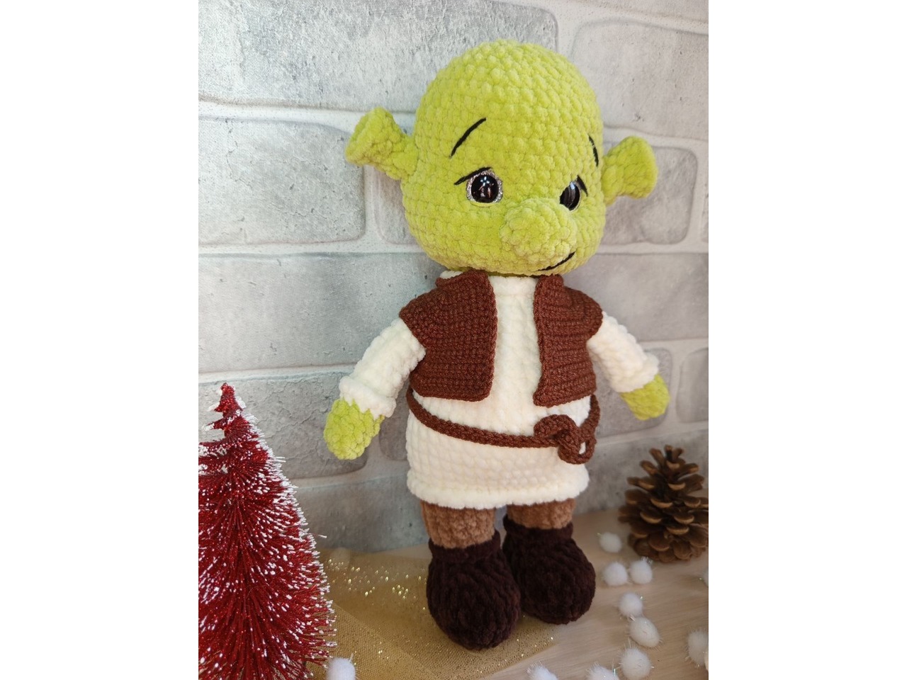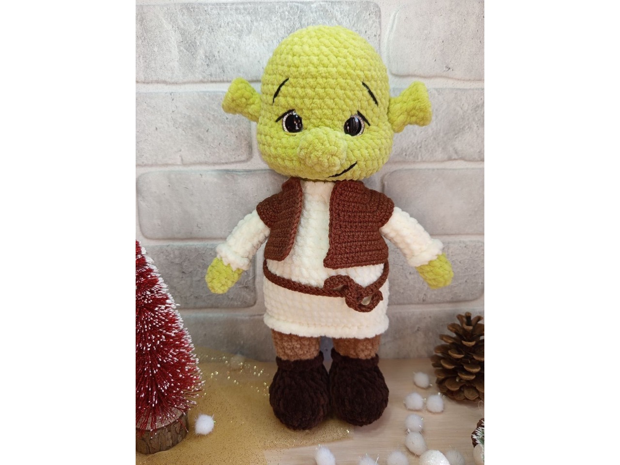 Шрек плюшевий, зріст 29 см. Очі на безпечному кріпленні. Кофтинка знімається. Самостійно стояти/сидіти не вміє. У Шрека є подружка Фіона і товариш кіт у чоботях.Відправляю у подарунковому пакеті та картонній коробці.