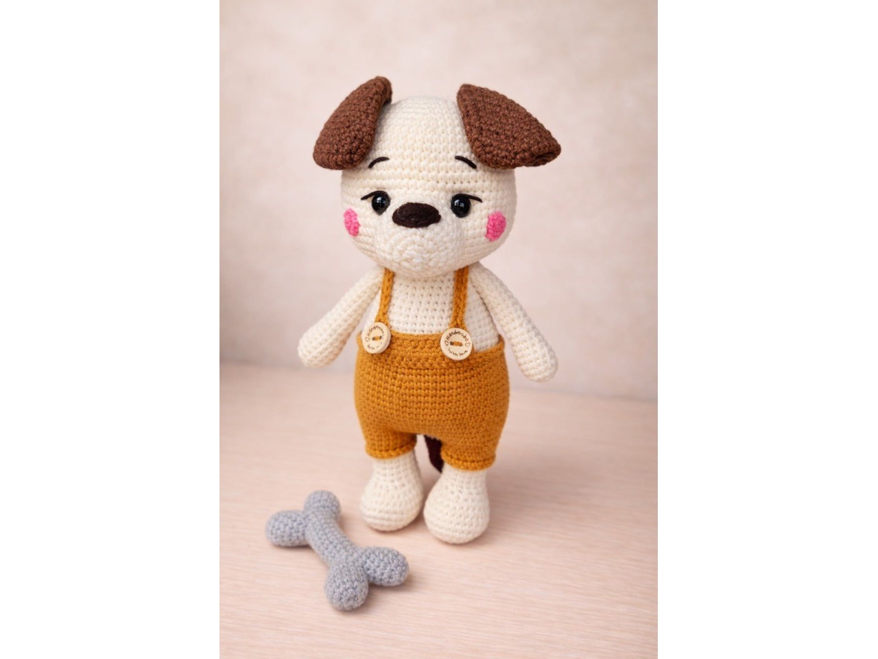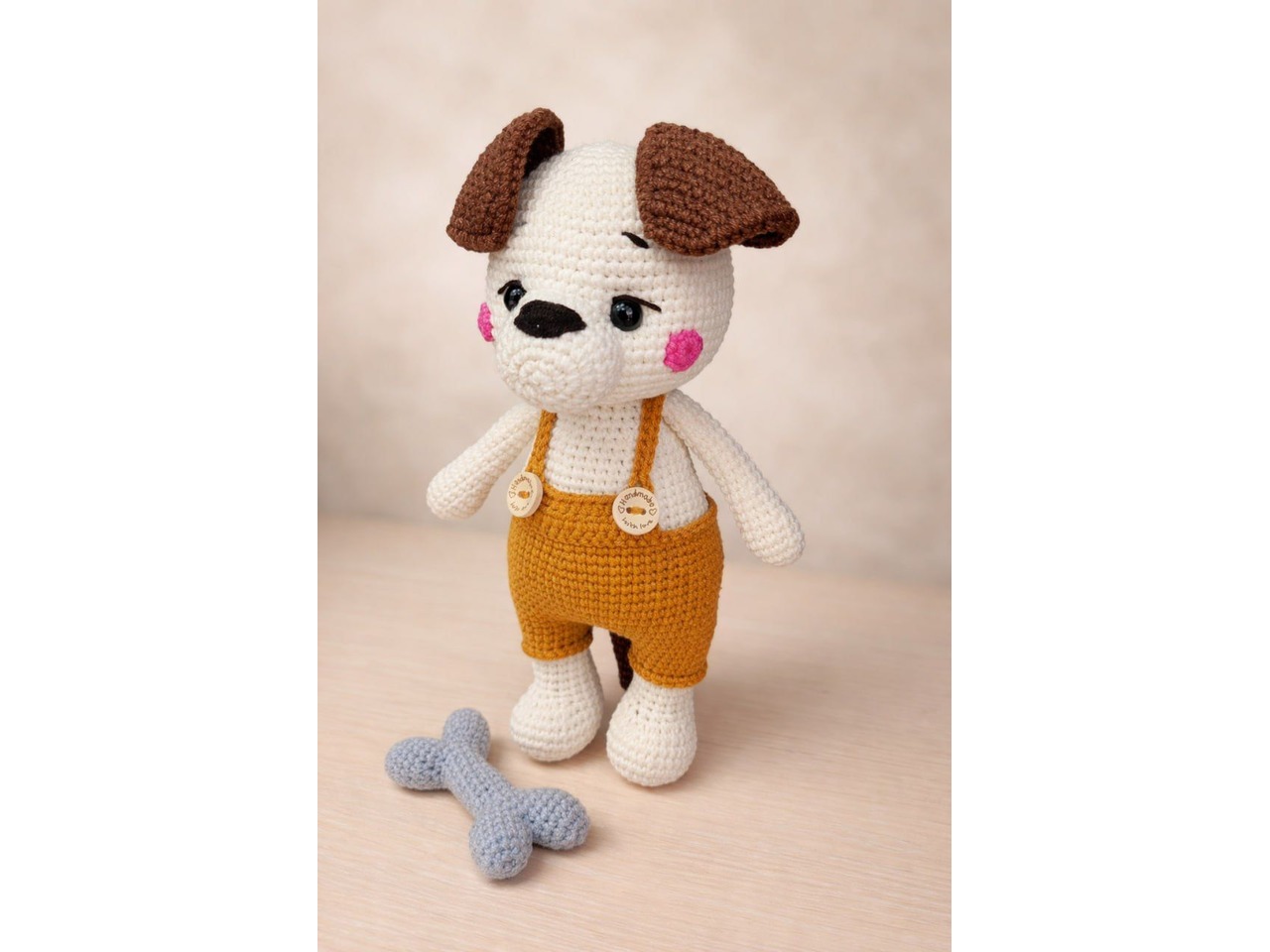 Собачка ручної роботи. Зріст 23 см, розмір кісточки - 8 см. Очі на безпечному кріпленні. Наповнювач - холлофайбер. Штанці не знімаються. Колір тіла собачки - молочний. Кісточка в комплекті.Відправляю у прозорому подарунковому пакеті та картонній поштовій коробці.