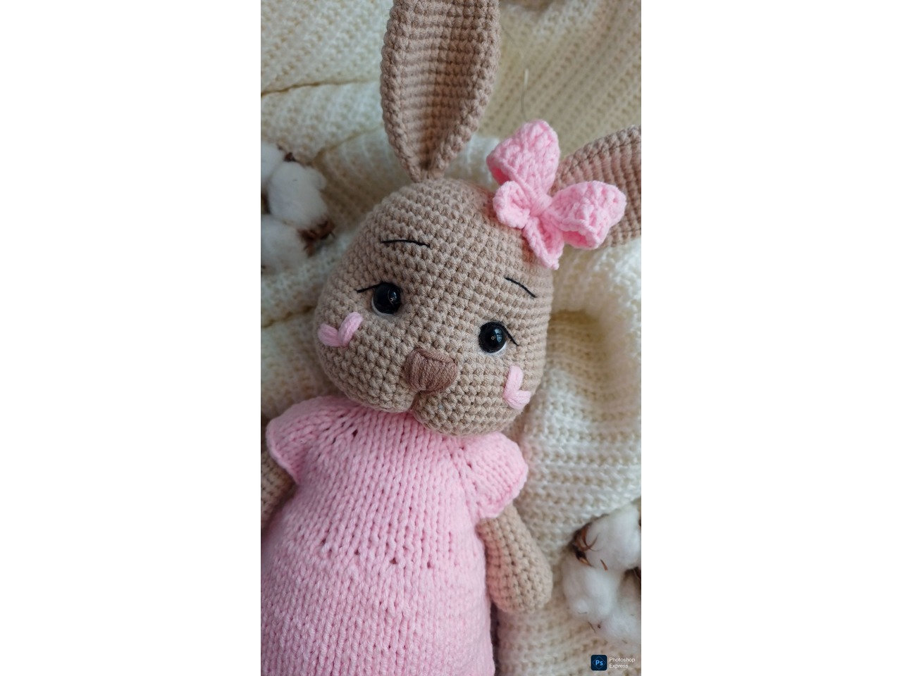 Зайка одягнена у знімну в′язану сукню ніжно-рожевого кольору.