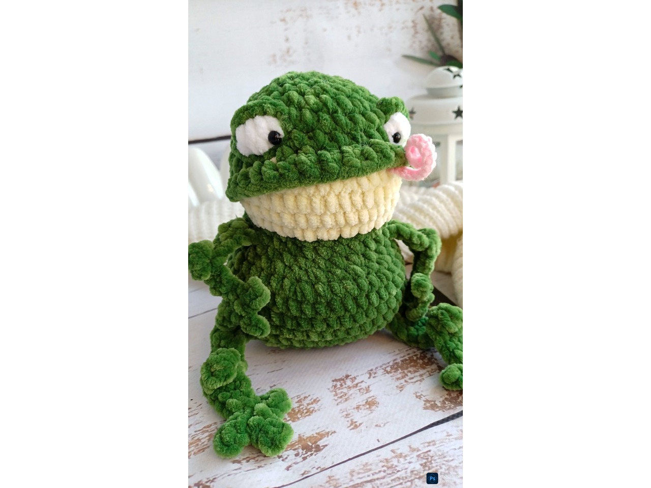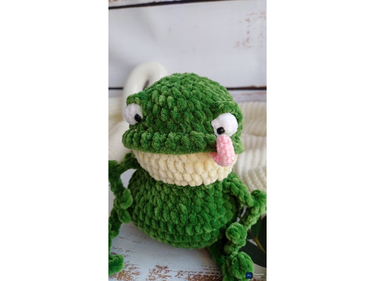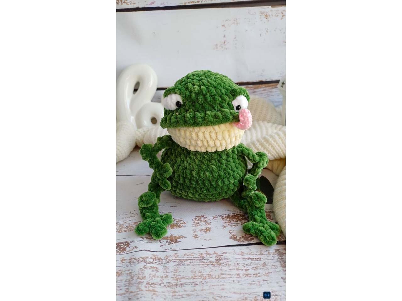 Мила та харизматична жабка, створена вручну з ніжної плюшевої пряжі. Дуже м’яка, приємна на дотик і безпечна для дітей.Розмір: ~ 16 см