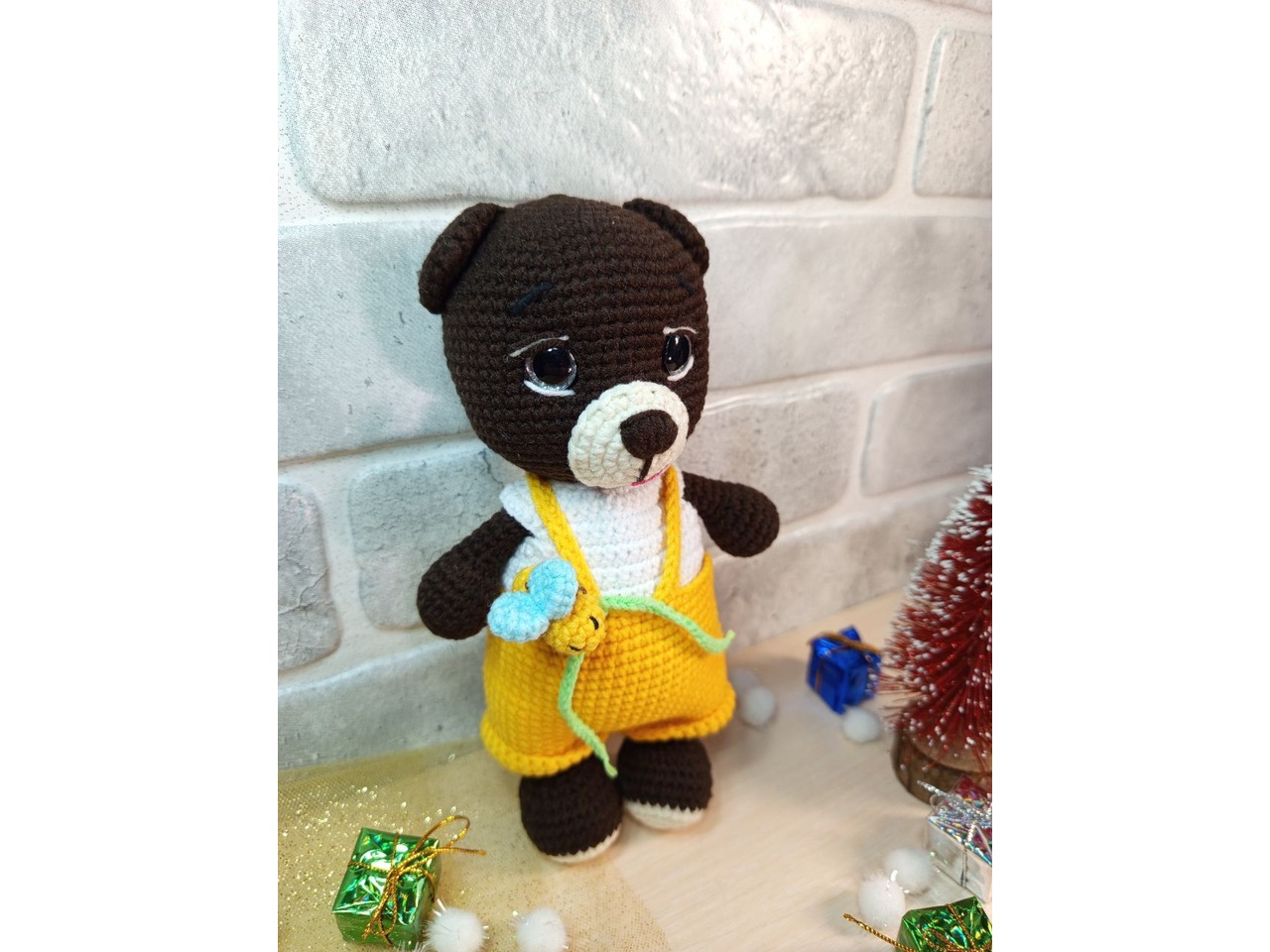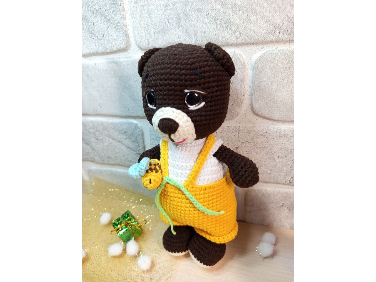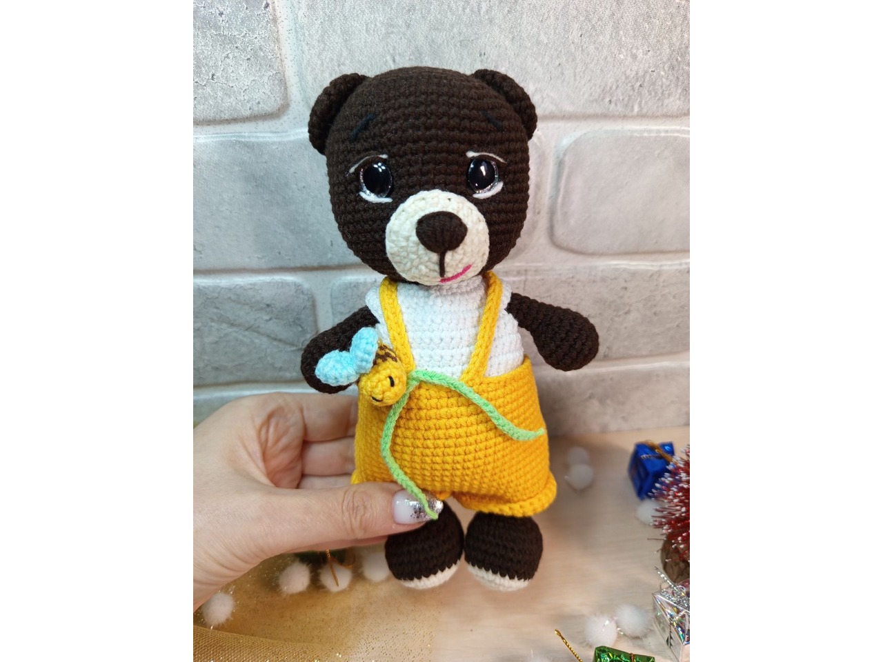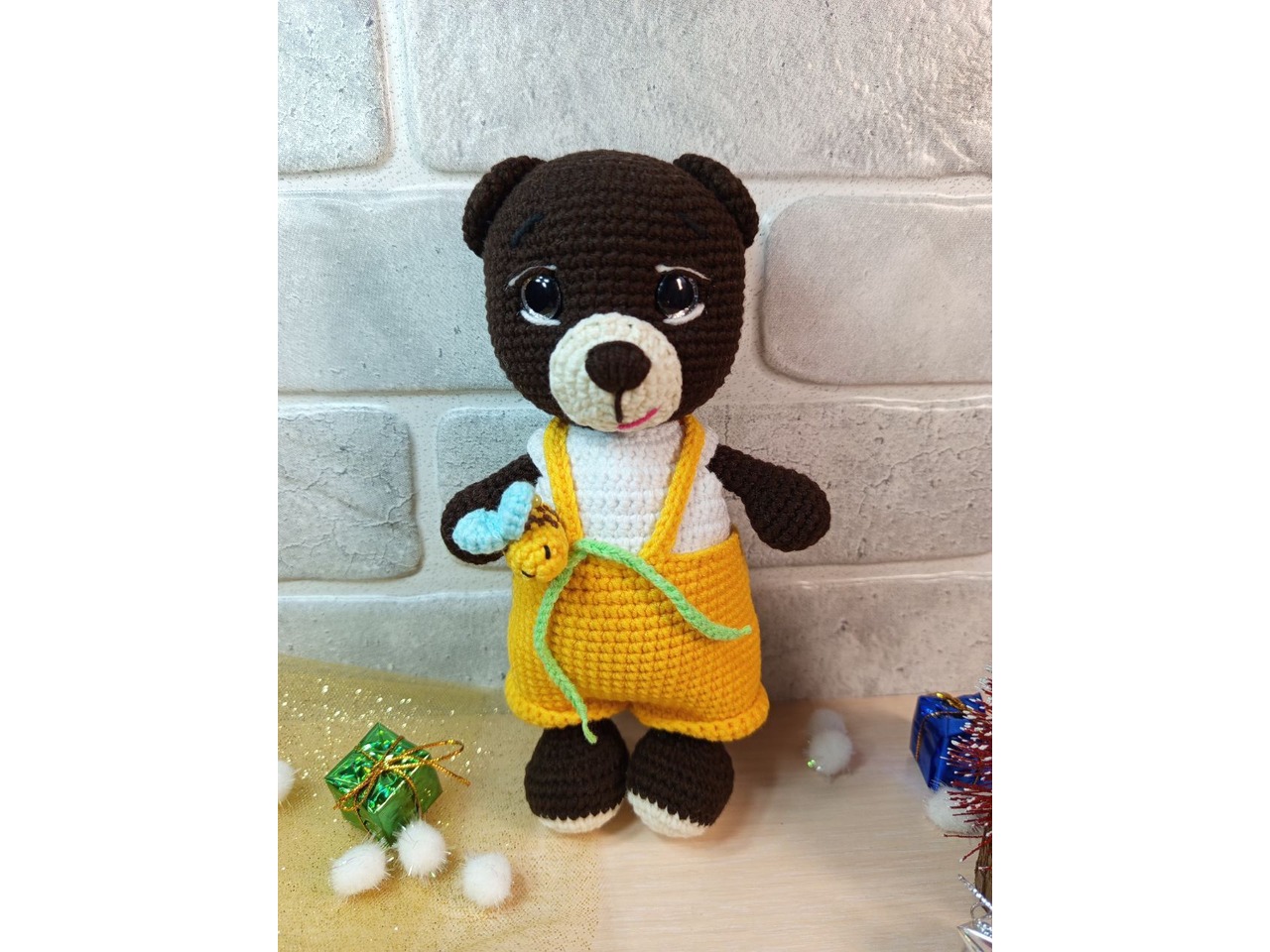 Ведмедик ручної роботи. Зріст 20 см. Зручний для дитячої долоньки. Очі на безпечному кріпленні. Бджілка знімається, кофтинка і штанці також можна зняти. Самостійно іграшка не стоїть. На фото вийшла більш темніша, ніж в реальності.Відправляю в подарунковому пакеті та поштовій картонній коробці.