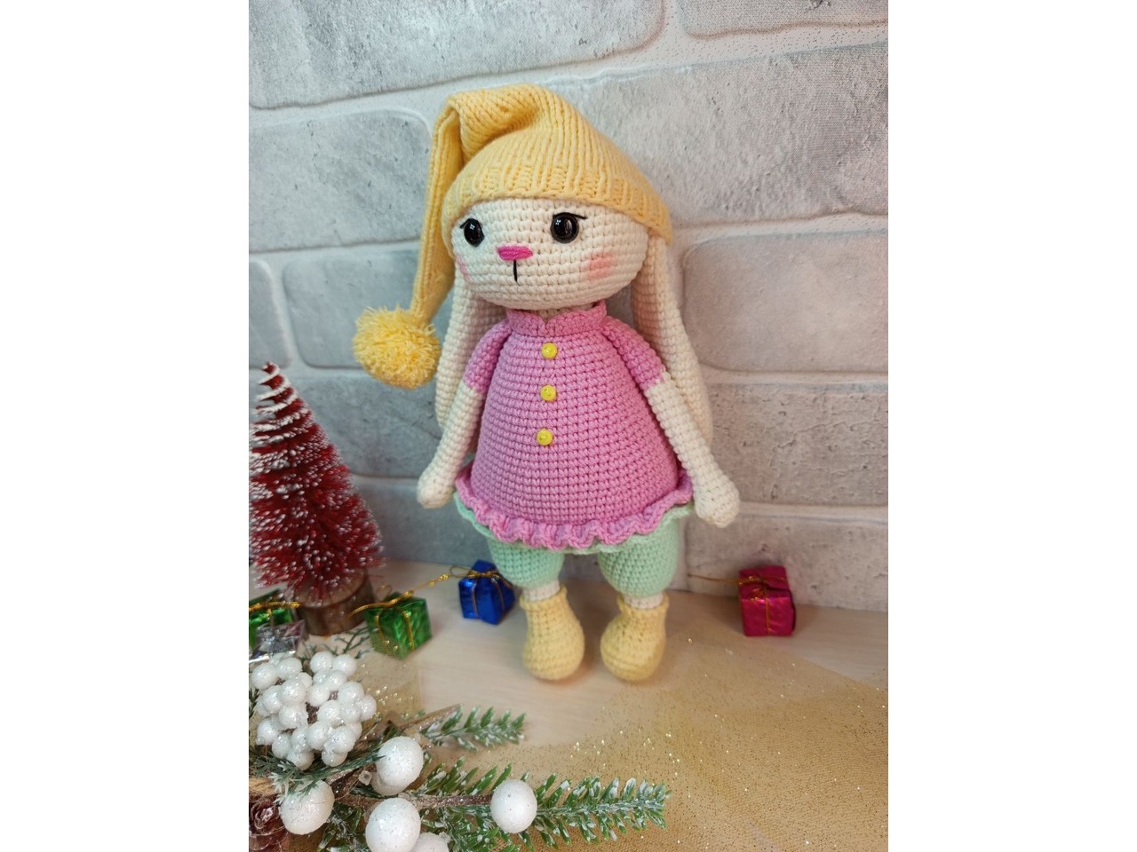 Зайчик ручної роботи. Зріст 23 см без шапочки, в шапочці - 25 см. Очі на безпечному кріпленні, матеріали - гіпоалергенні, наповнювач - холлофайбер. Шапочка знімається.Відправка в подарунковому пакеті та картонній коробці.
