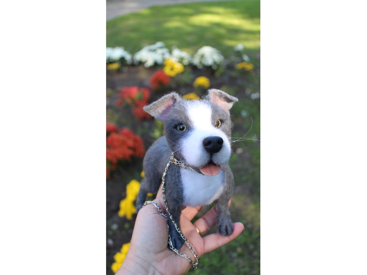 Стаффордширський тер'єр реалістична фігурка собачки іграшка валяна з шерсті. Висота 19 см, длина 24 см. На каркасі.Ніс та язичок ручної лепки та розпису, очі скляні ручного розпису. Шорсточка дуже приємна та блискуча. Іграшка інтерєрна. Чудовий подарунок та прикраса вашого інтерʼєру. Чекає на новий будиночок.
