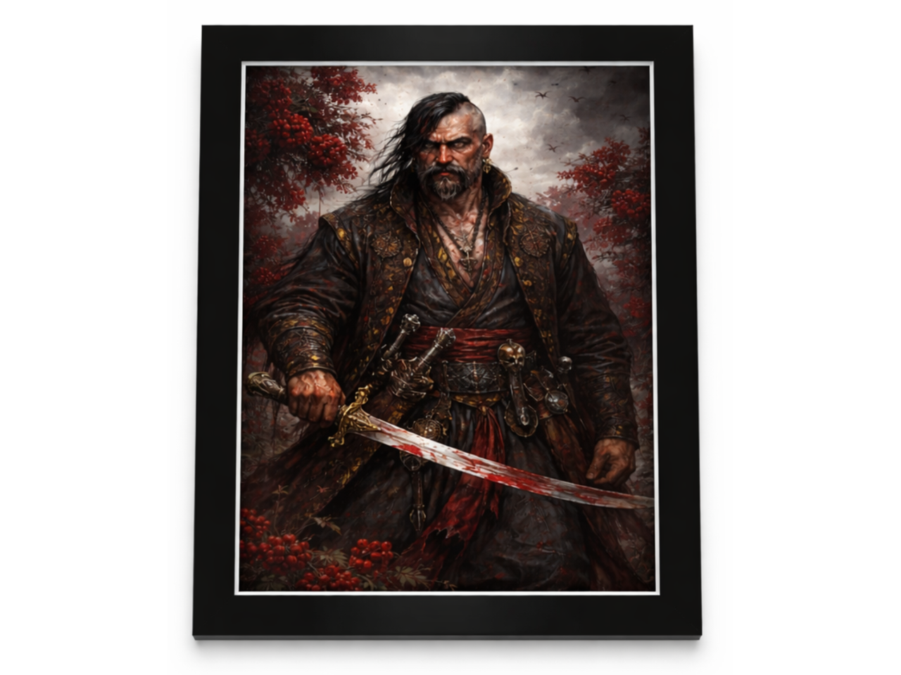 Мощный мистический образ украинского козака-характерника — воина и мага, о котором ходили легенды. Суровый взгляд, боевой клинок и красная калина вокруг создают атмосферу силы, тайны и древнего духа войны.Это не просто картина — это образ силы, свободы и украинского характера.