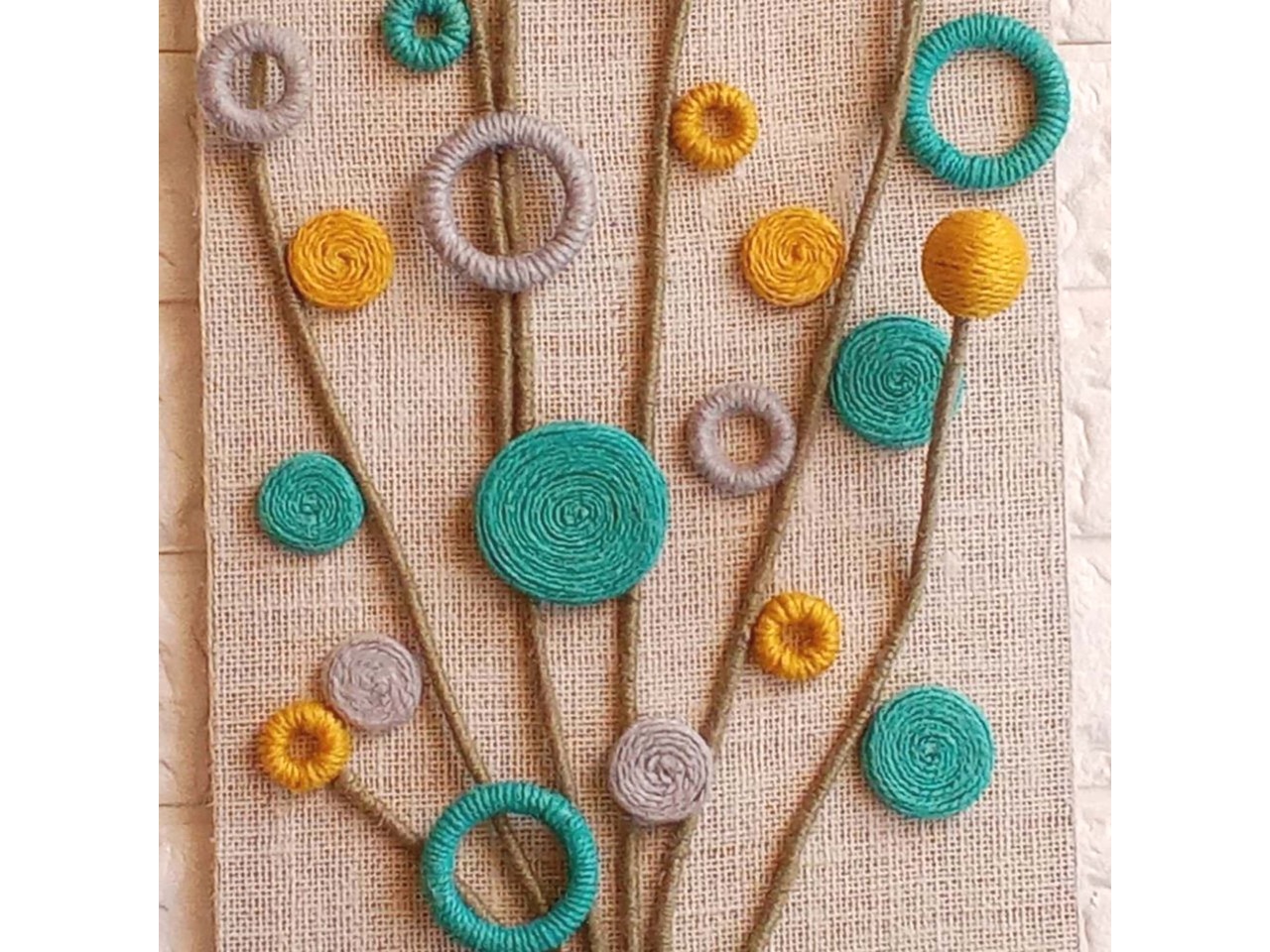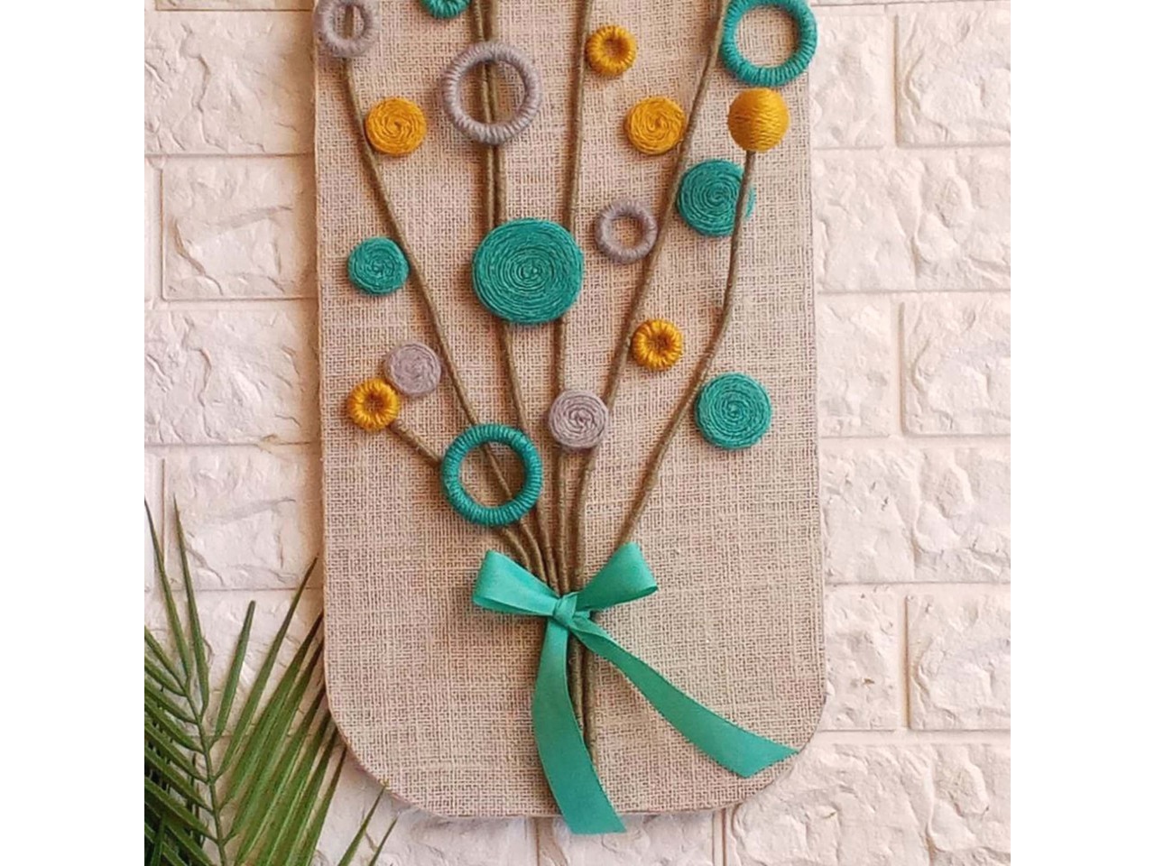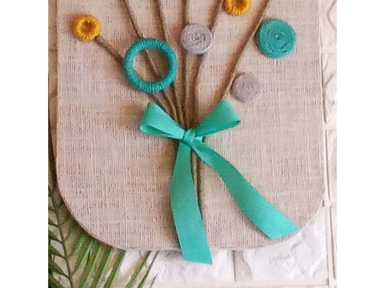 Квіти різних форм виконані зі джутового шпагату у відтінках голубого, гірчичного та сірого. Стебла – зі шпагату кольору хакі, перев’язані жаккардовою стрічкою голубого кольору.