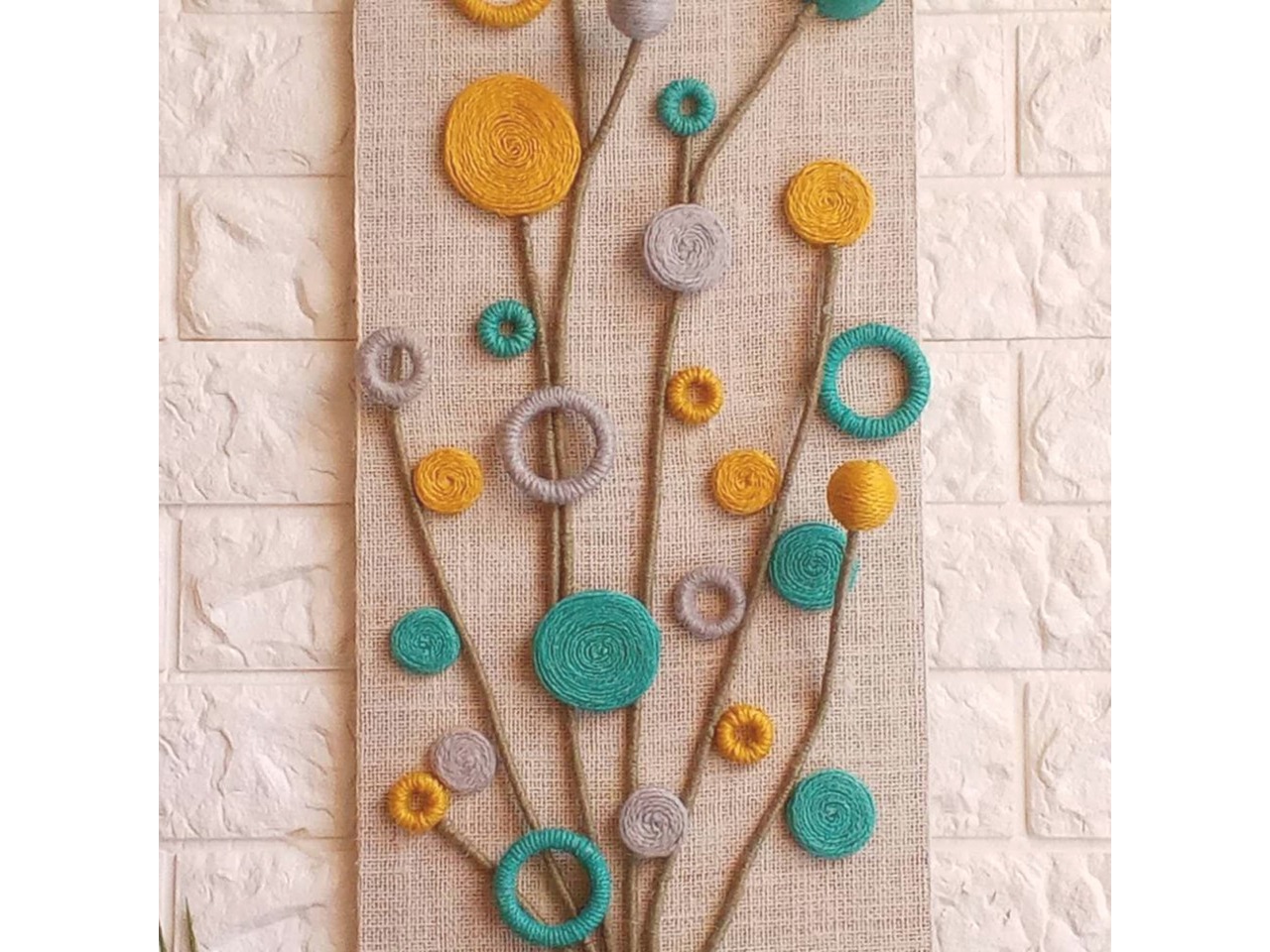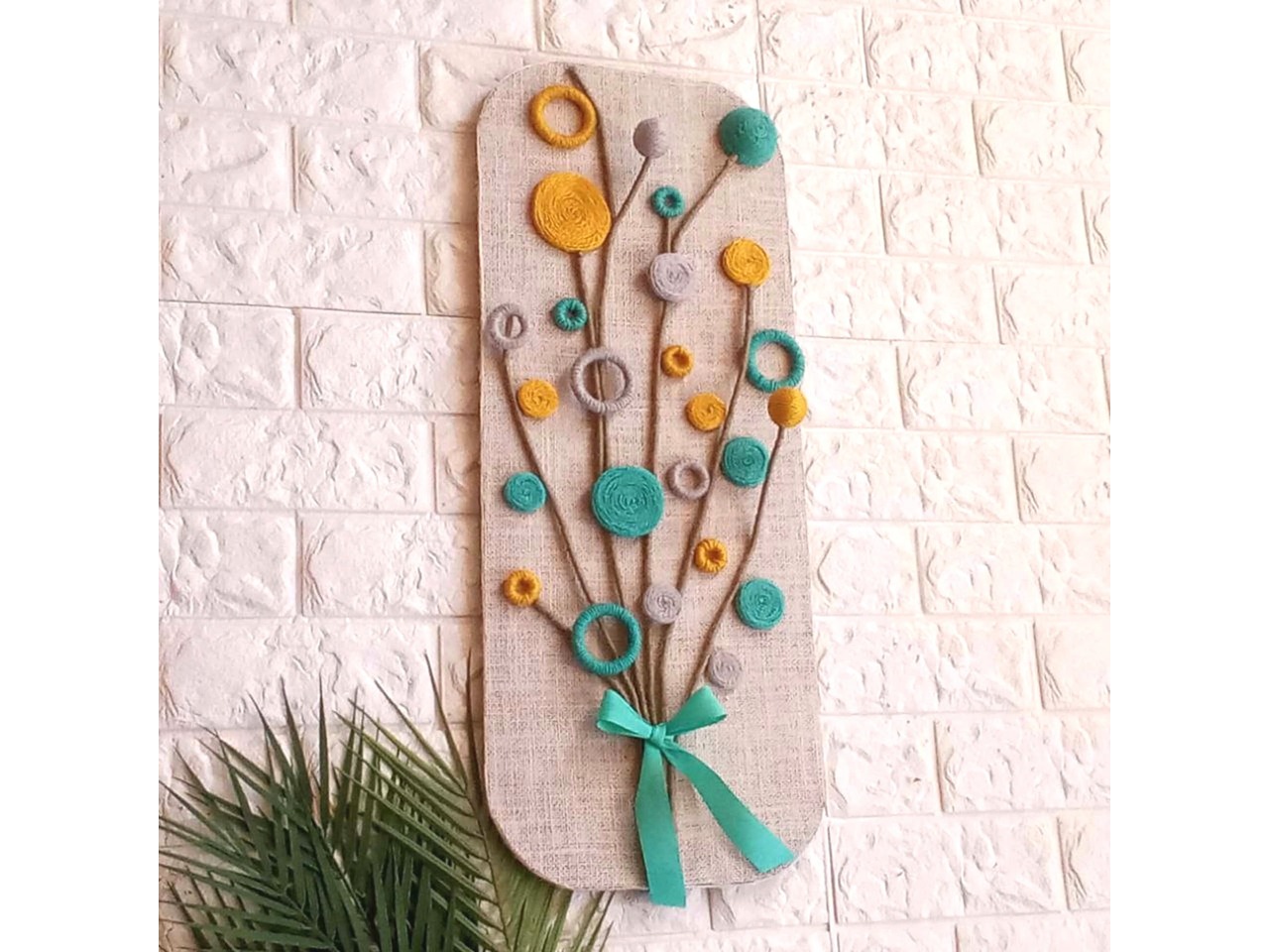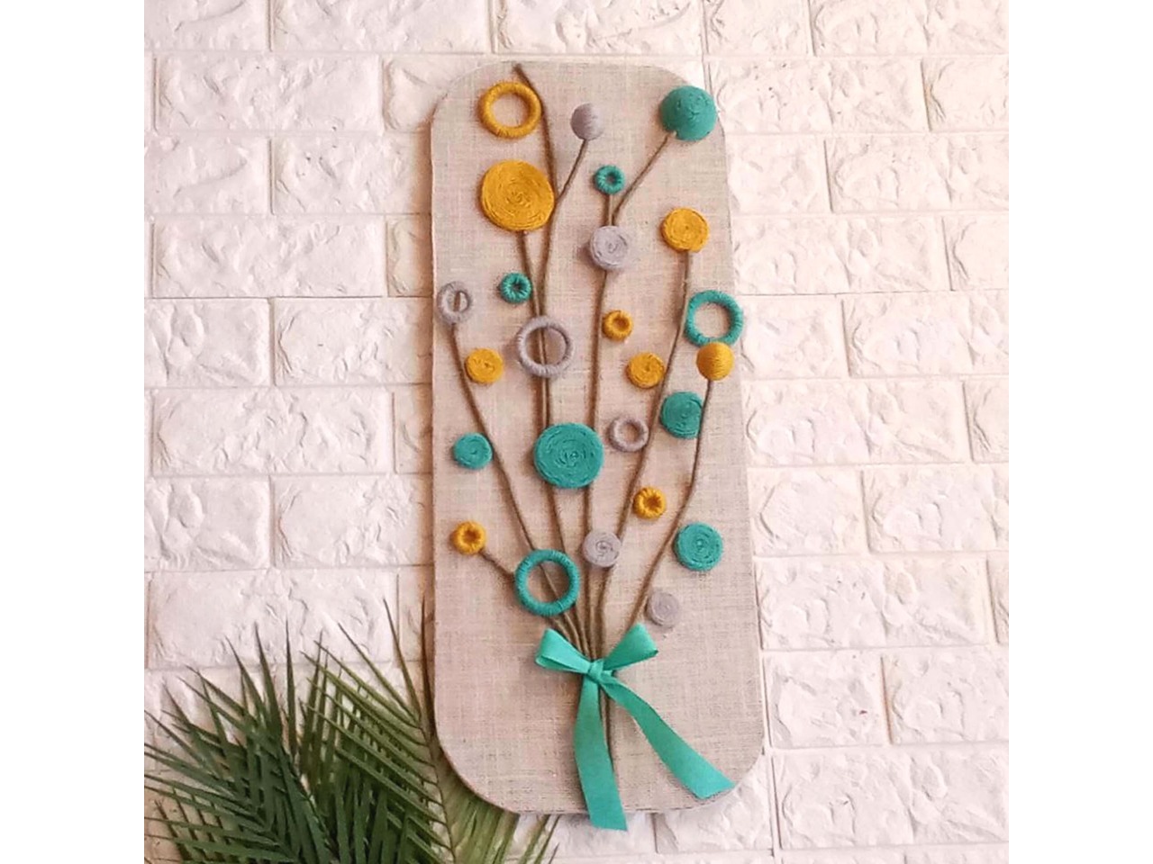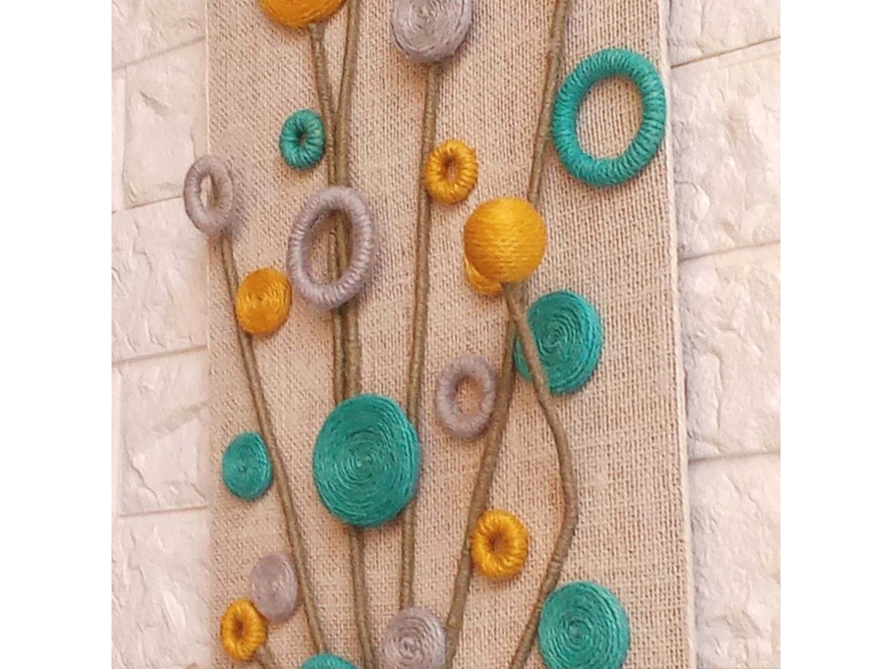 Квіти різних форм виконані зі джутового шпагату у відтінках голубого, гірчичного та сірого. Стебла – зі шпагату кольору хакі, перев’язані жаккардовою стрічкою голубого кольору.