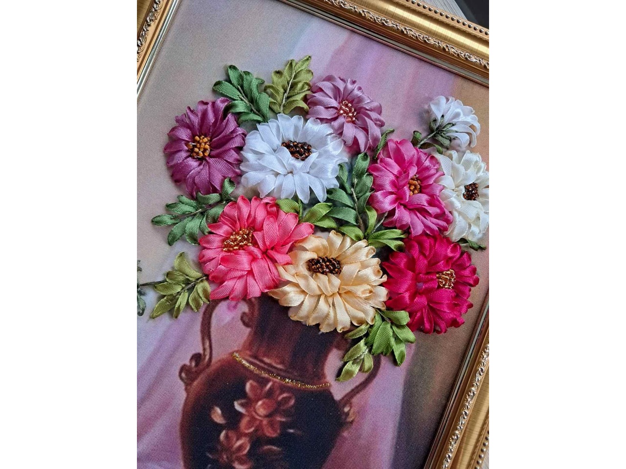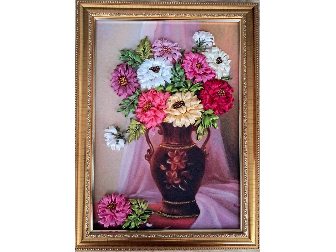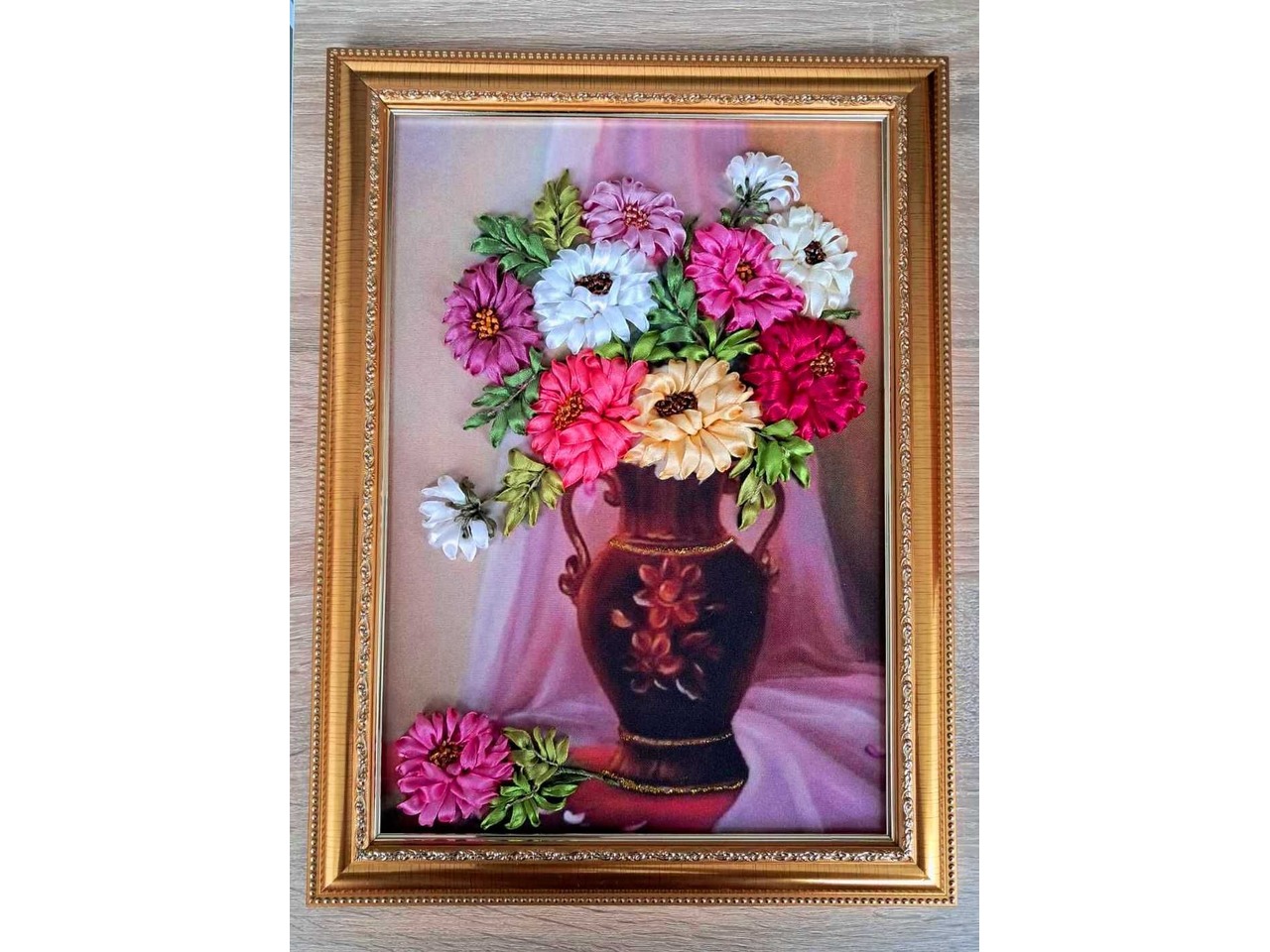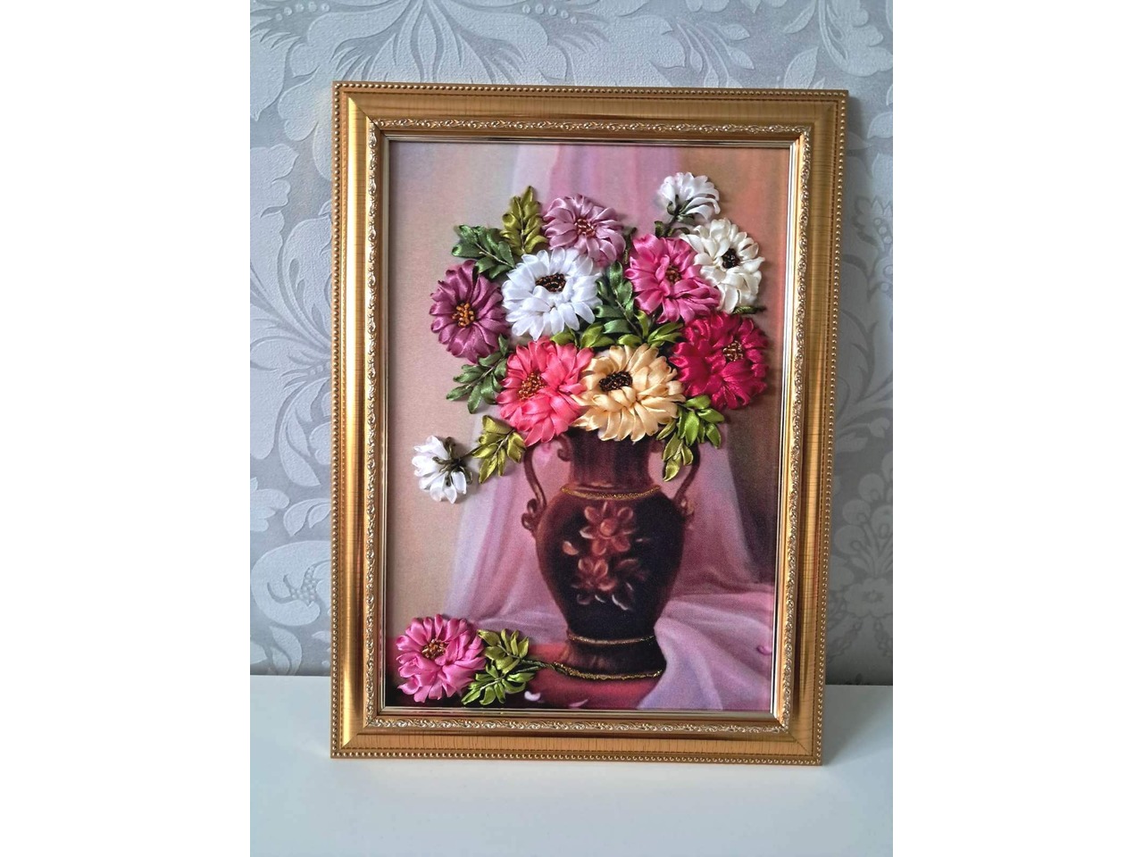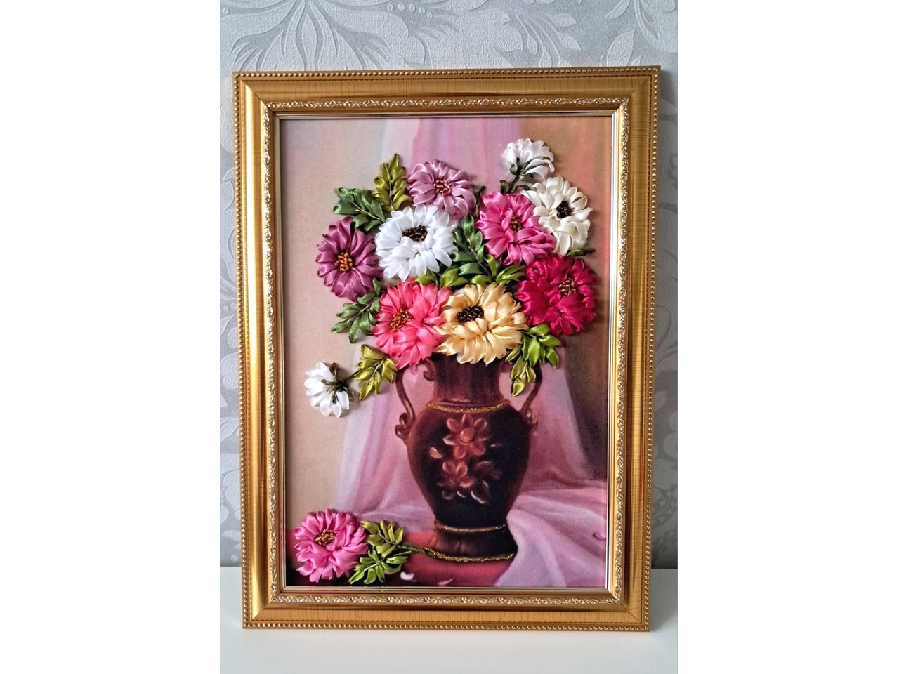 Картина вишита атласними стрічками на якісному принті. Для подарунку - з будь-якого приводу!!!! Вироби ручної работи - завжди актуально и оригінально!!!Розмір 21*30см