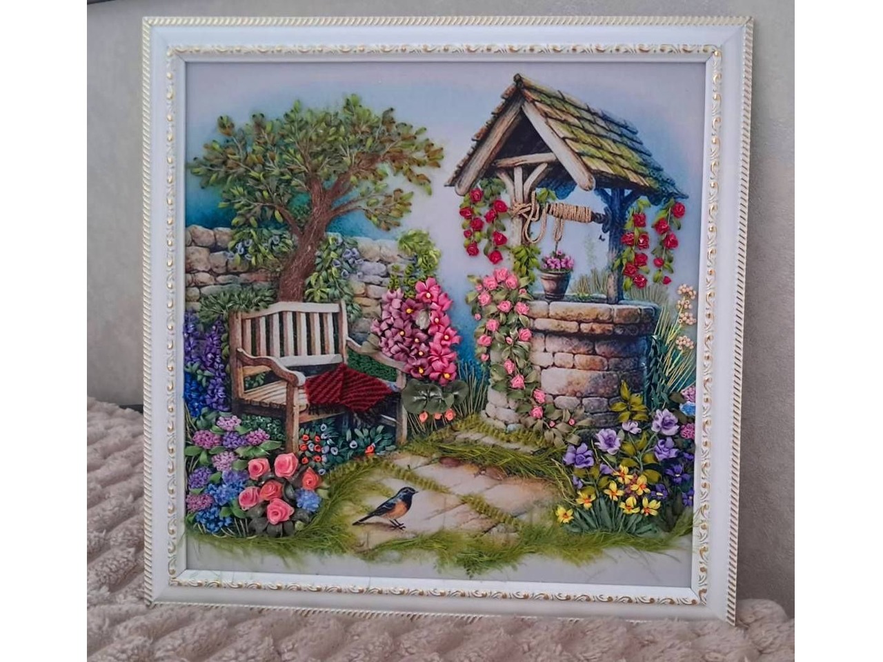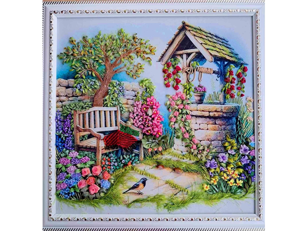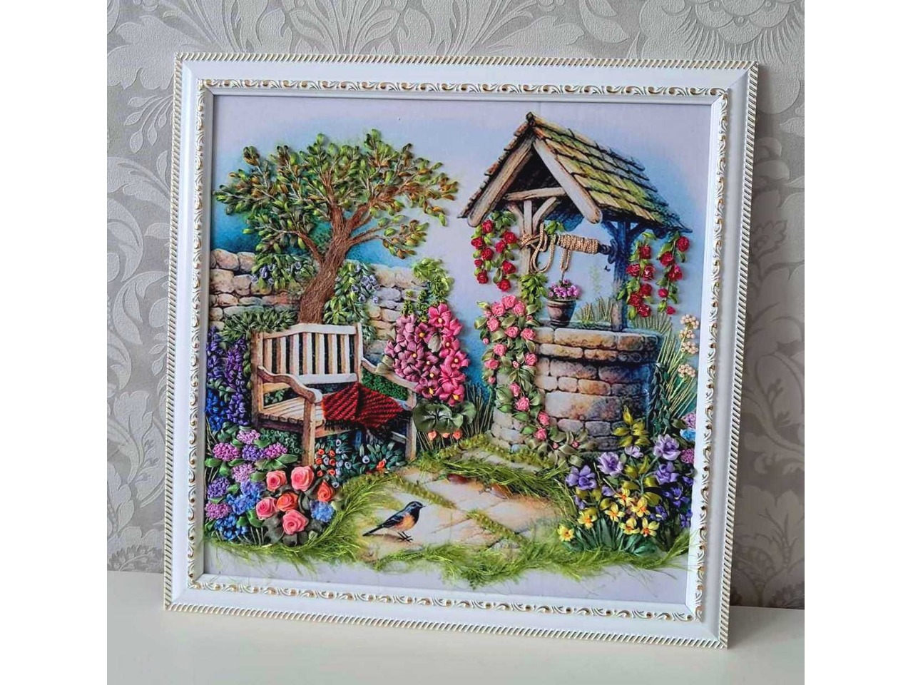 Картина виконана атласними стрічками, бісером і нитками на якісному принті. Вона може стати центральним елементом декору для прикраси інтер′ру вашої вітальні, дачі та створить затишну атмосферу для вашого відпочинку. А можливо така річ ручної роботи стане подарунком для ваших друзів на новосілля, день народження чи до будь-якого ювілею.