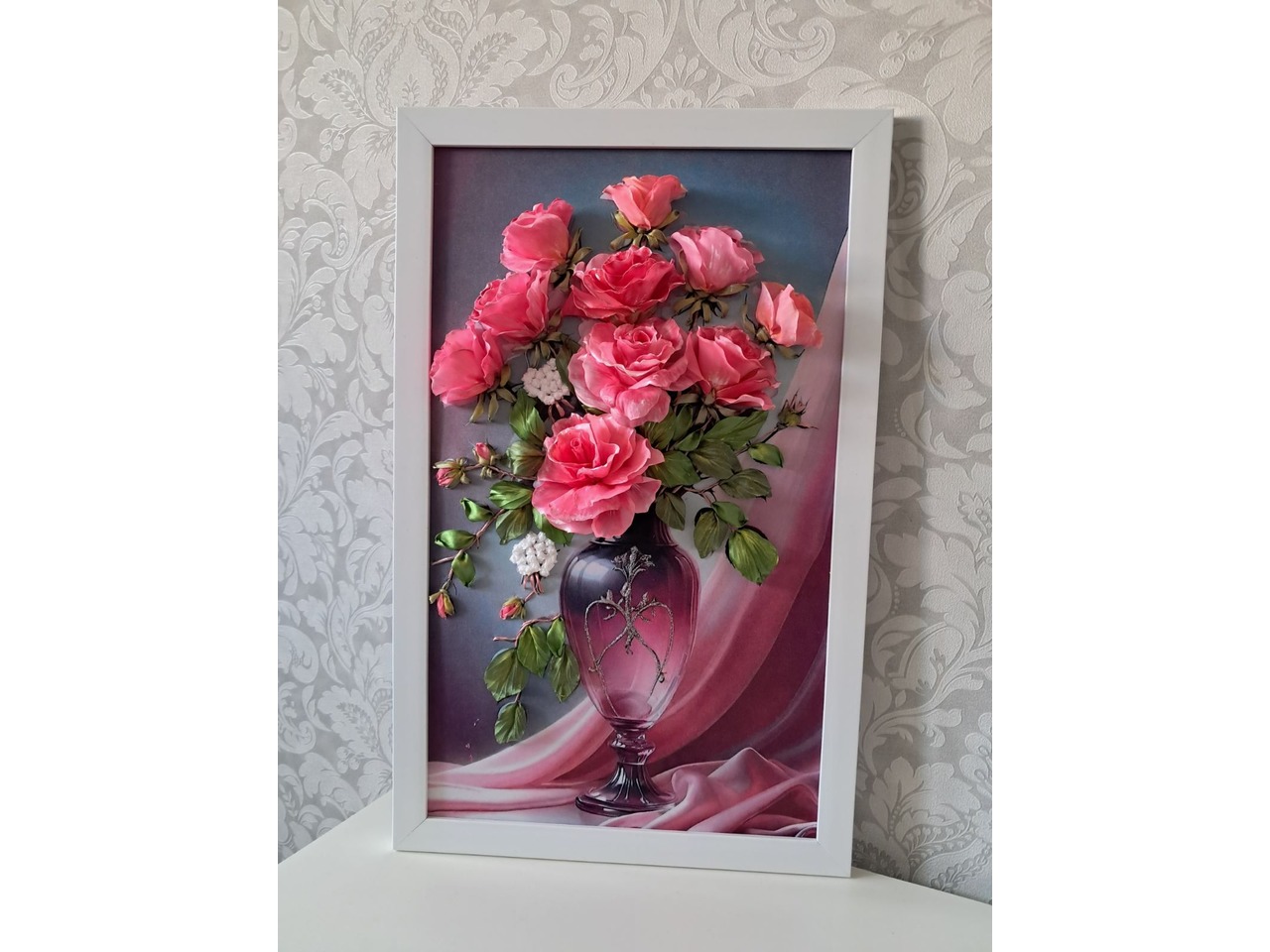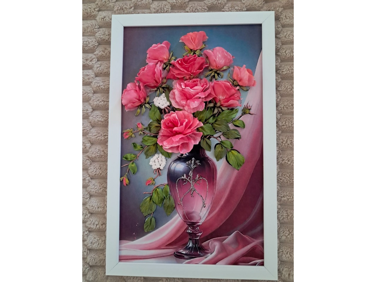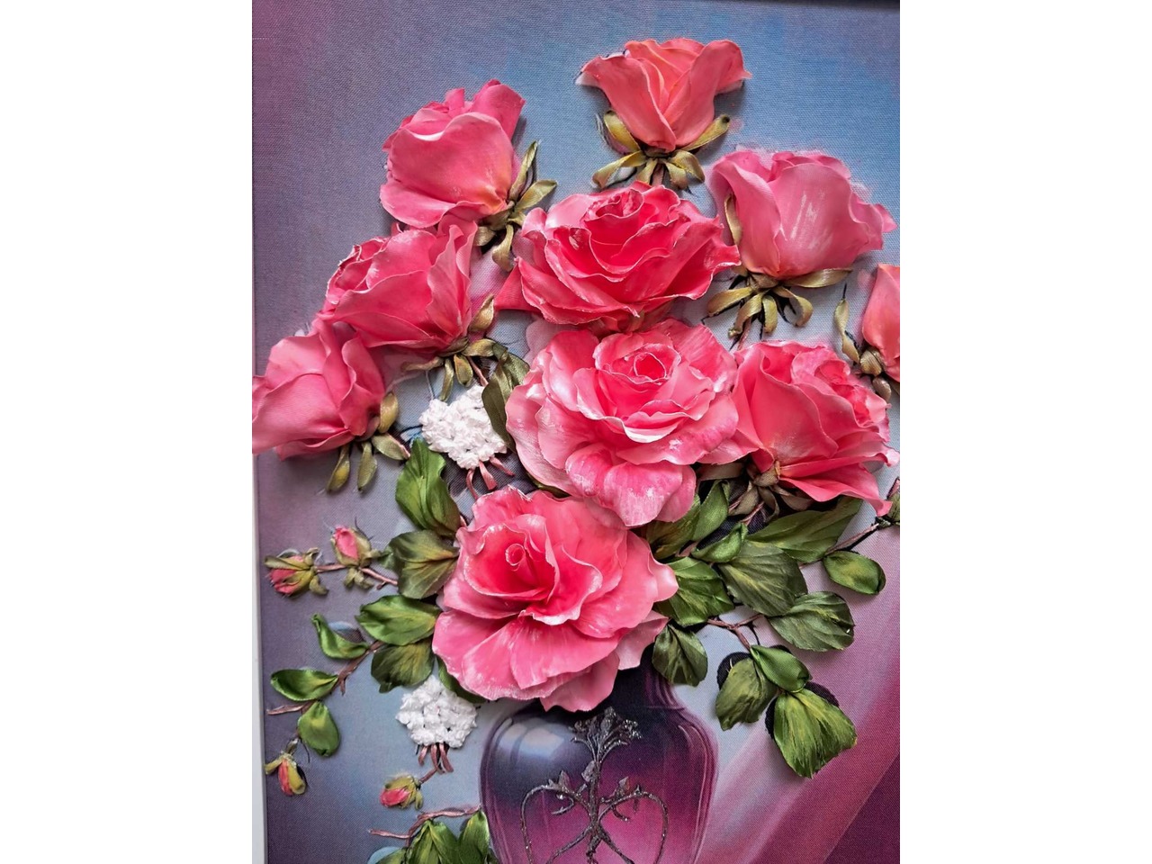 Картина створена атласними стрічками методом аплікації, тонування квітів в процесі роботи. Не знаєте, що подарувати на весілля, ювілей, день народження, виберіть картину ручної роботи, і ви не пошкодуєте. Оригінально, вишукано!!! І пам′ять про знаменну дату збережеться на довгий час.