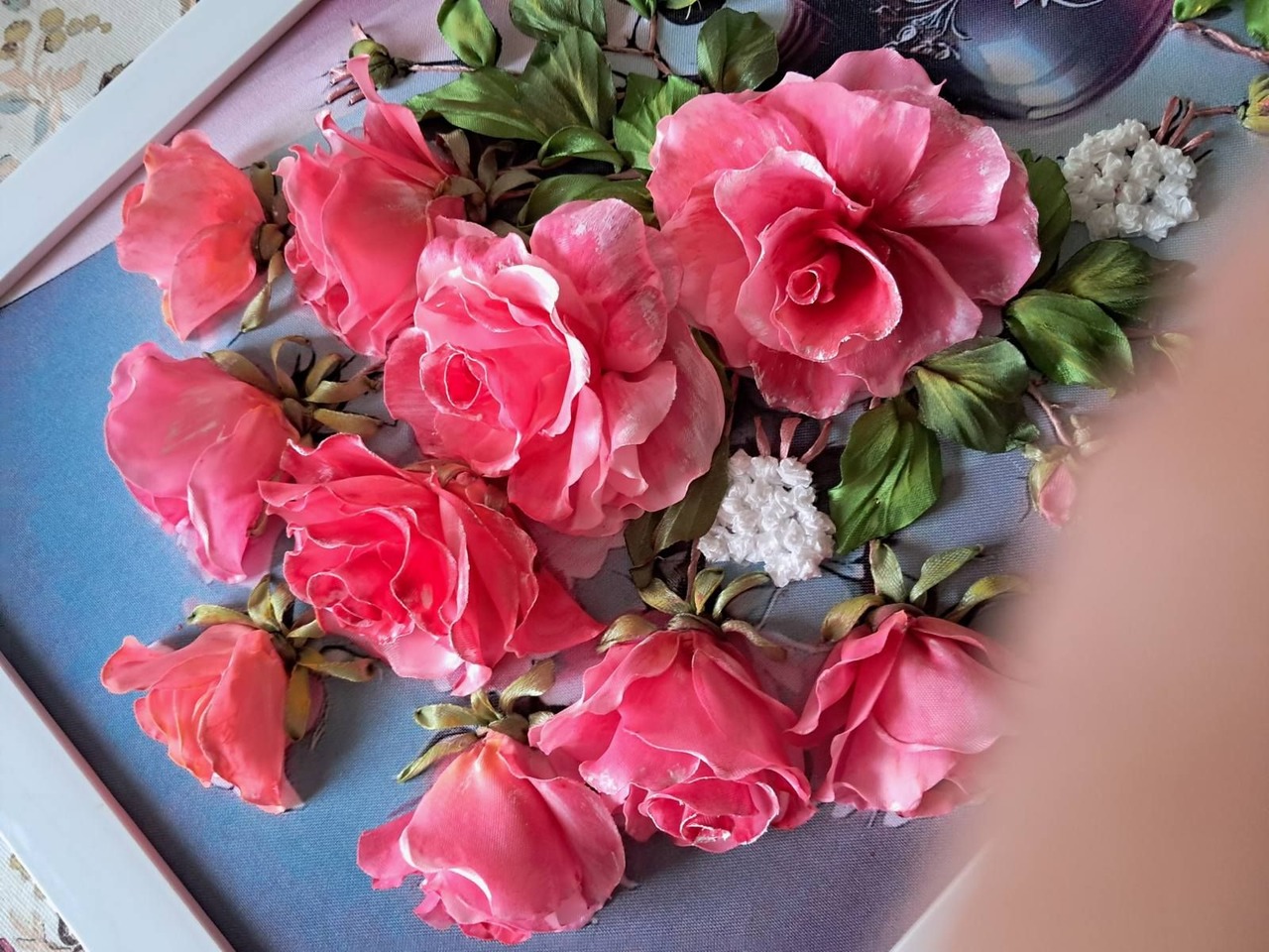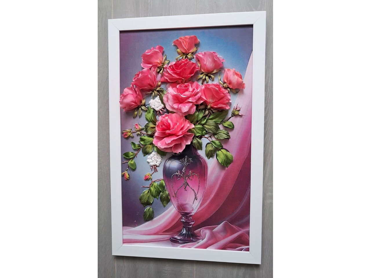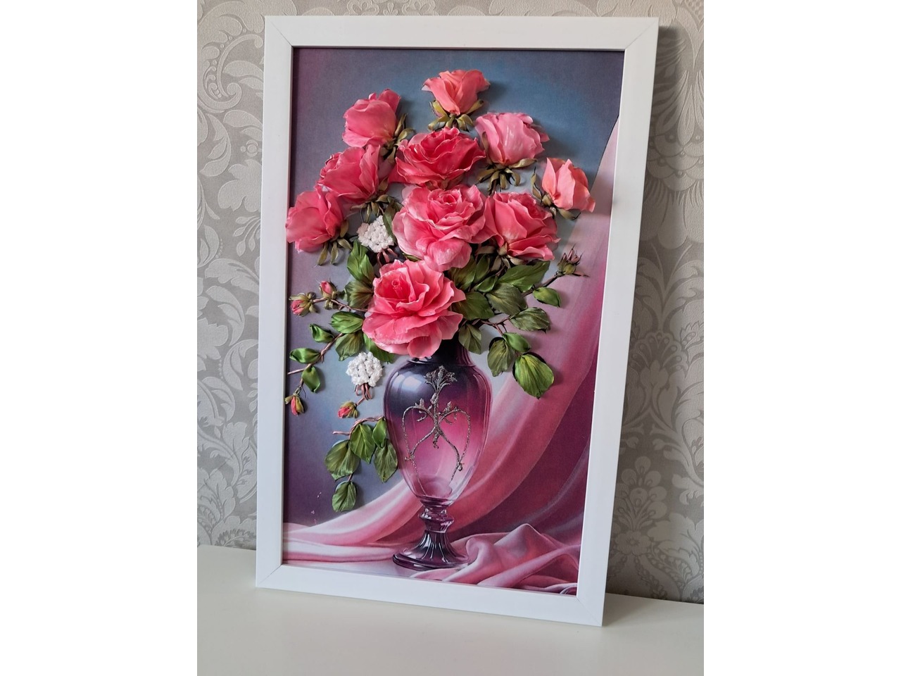 Картина створена атласними стрічками методом аплікації, тонування квітів в процесі роботи. Не знаєте, що подарувати на весілля, ювілей, день народження, виберіть картину ручної роботи, і ви не пошкодуєте. Оригінально, вишукано!!! І пам′ять про знаменну дату збережеться на довгий час.