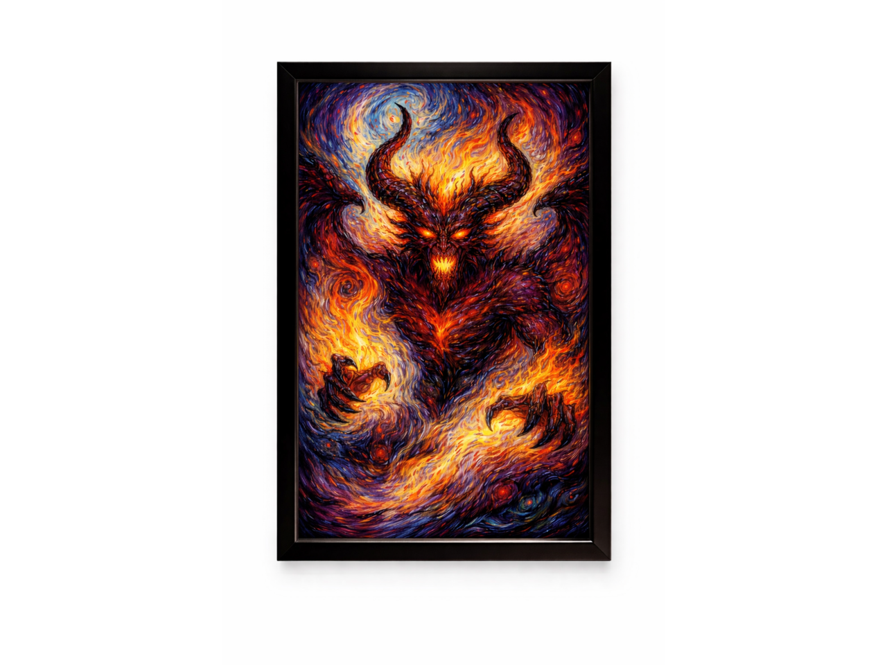 Яркая и мощная художественная работа в экспрессивном стиле, изображающая огненного демона, рождающегося из вихря пламени и космических энергий. Картина выполнена в динамичной живописной манере с насыщенными цветами и напоминает стиль экспрессивной масляной живописи.Огненные вихри, светящиеся глаза и рога демона создают сильный мистический образ, наполненный энергией хаоса и силы. Работа притягивает внимание и становится ярким акцентом в любом интерьере.