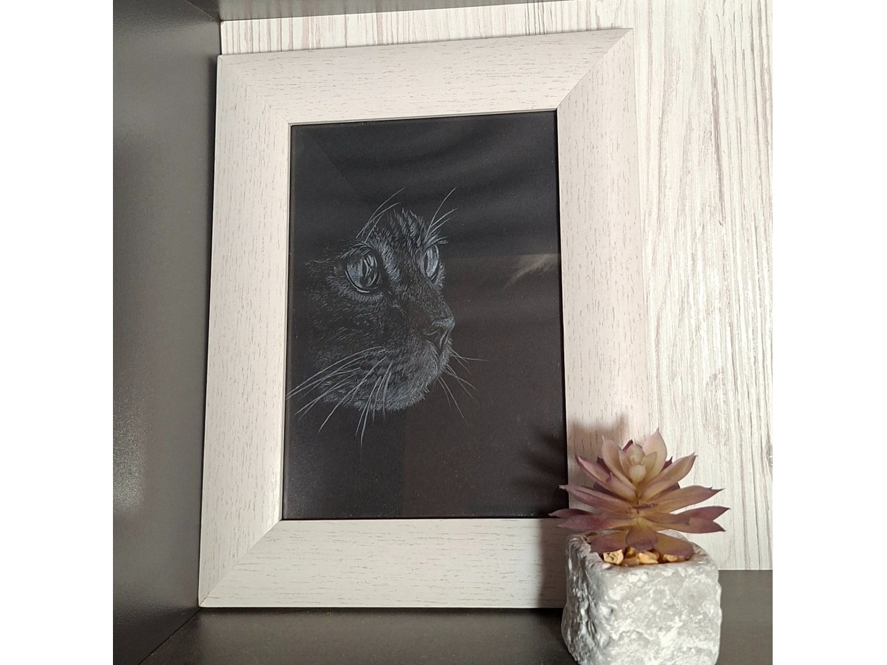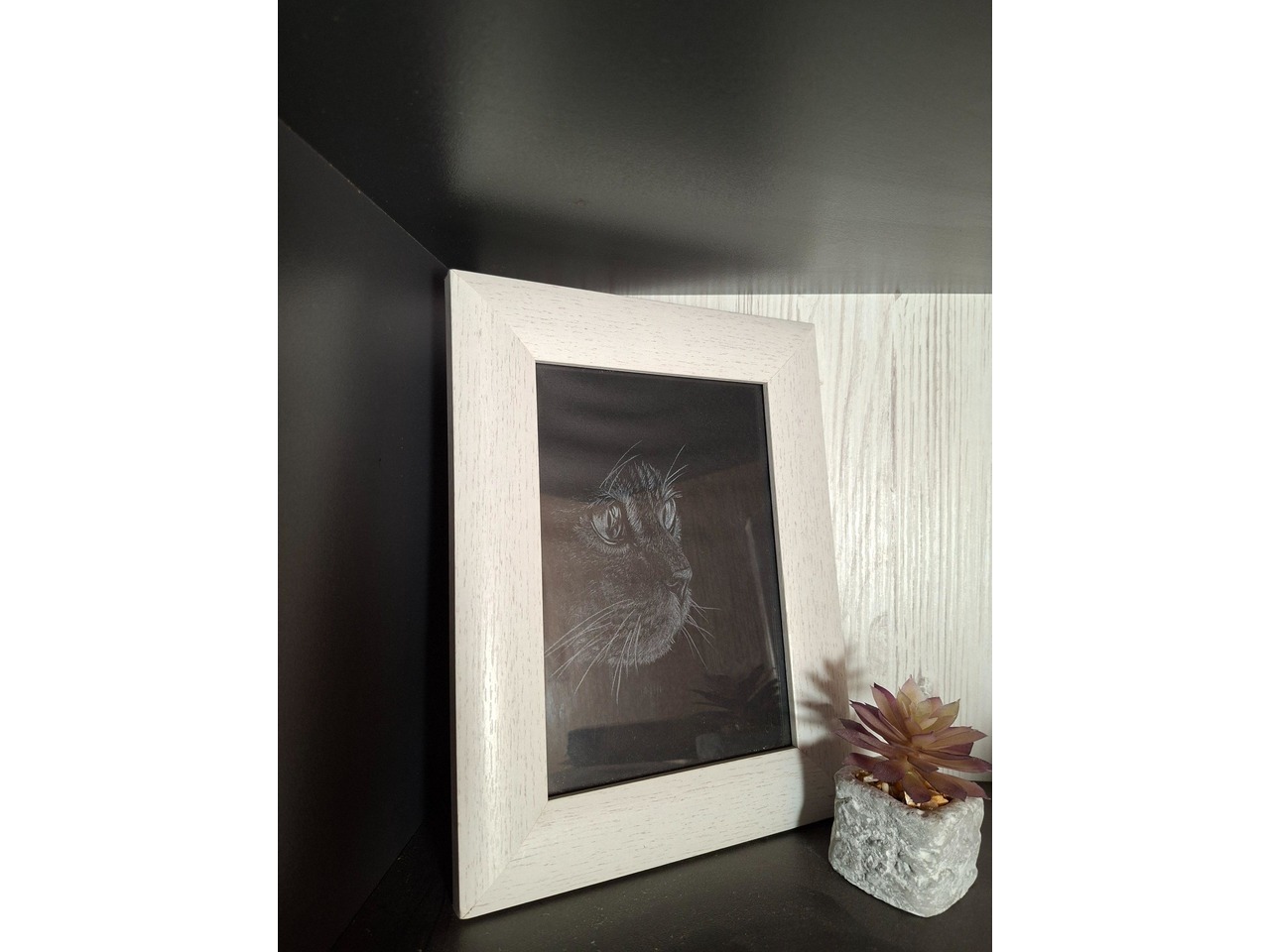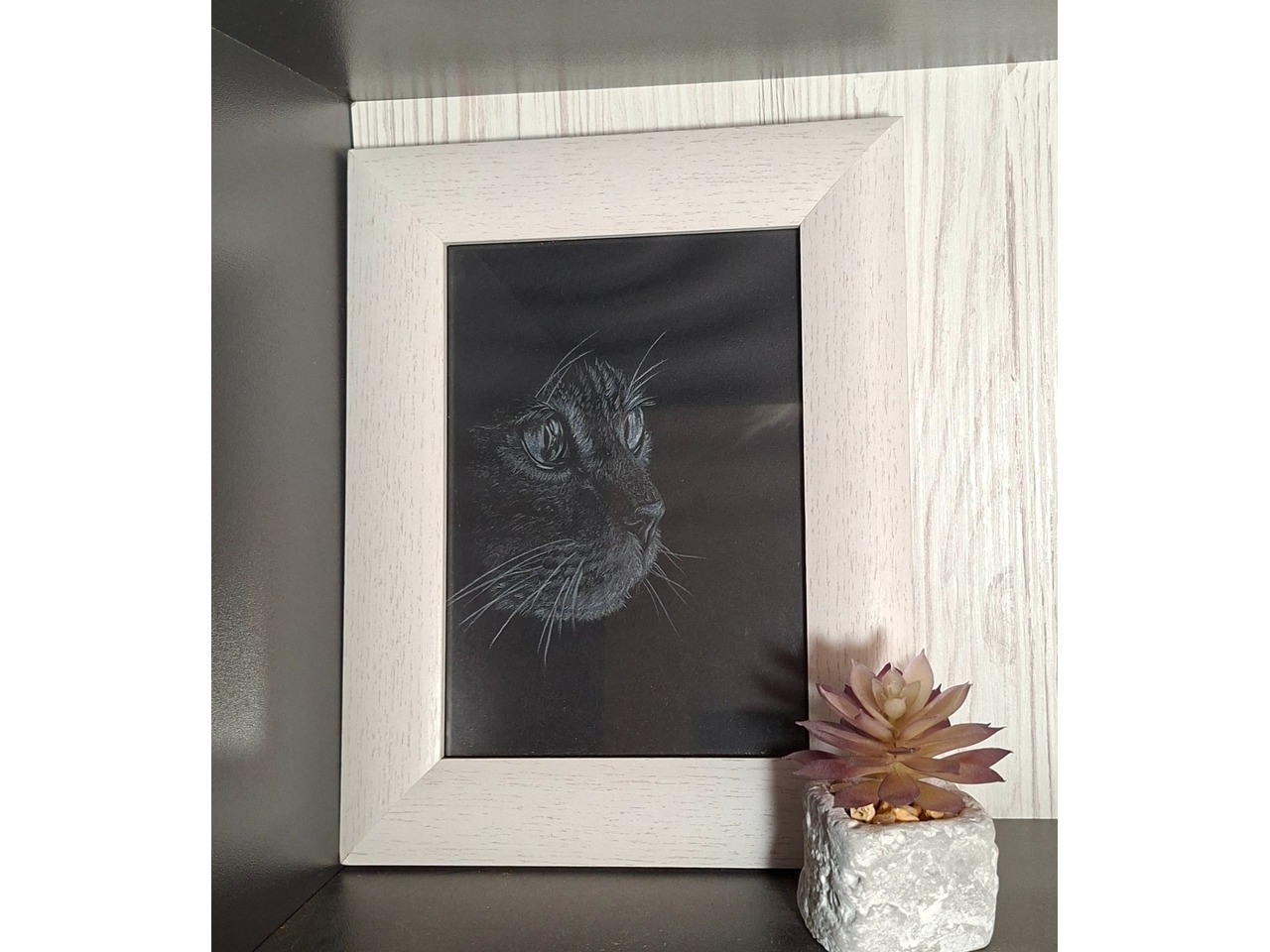 Картина авторська "Кішка" 13×18. Намальовано білим олівцем на чорному папері. Продається з рамою.