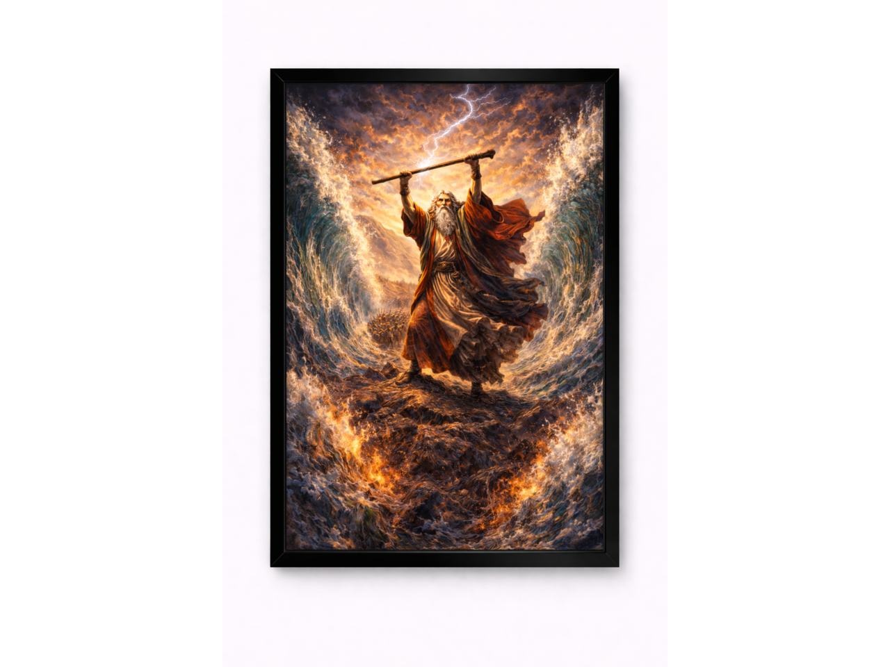 Эпическая художественная работа, вдохновлённая одним из самых известных библейских чудес — моментом, когда пророк Моисей раздвигает воды Красного моря, открывая путь своему народу. На картине изображён драматичный момент: Моисей поднимает посох к небу, а огромные стены воды расходятся по обе стороны, создавая путь через бушующее море.Молнии в небе, бурные волны и сияние света придают сцене мощную атмосферу божественной силы и великого чуда. Насыщенные цвета и детализированная живописная манера делают изображение похожим на эпическую историческую картину.