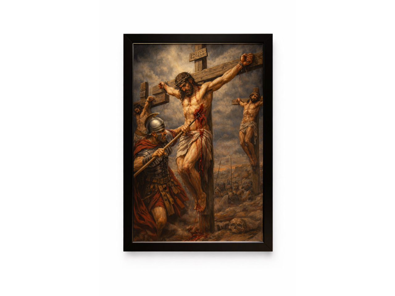 Сильная и драматичная художественная работа, изображающая один из самых известных библейских сюжетов — распятие Иисуса Христа. Картина передаёт глубину страдания, жертвы и духовной силы. Тёплая палитра и живописная манера создают атмосферу старинной классической живописи.Это изображение наполнено символизмом и эмоциональной мощью, поэтому станет выразительным элементом интерьера и предметом размышления.