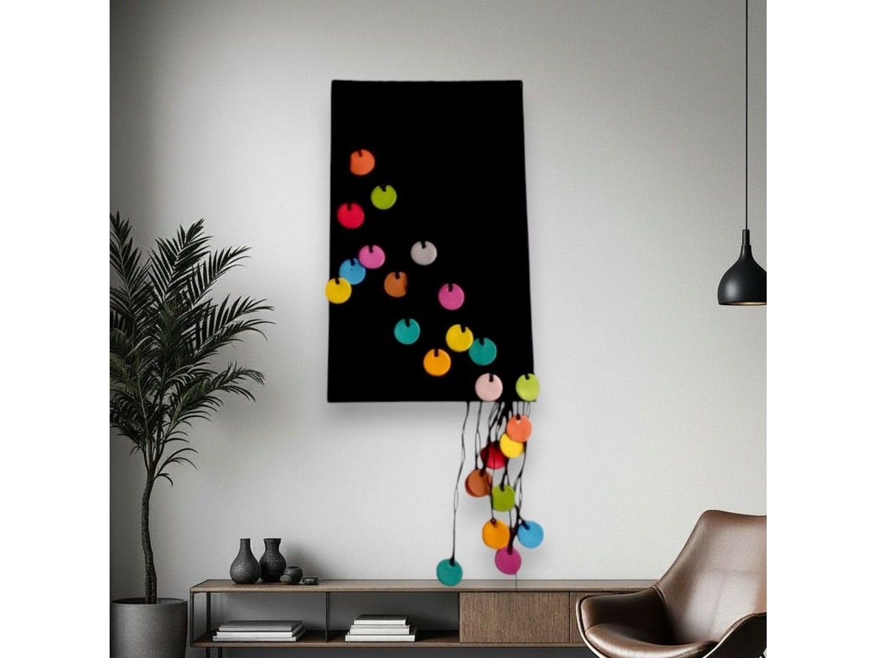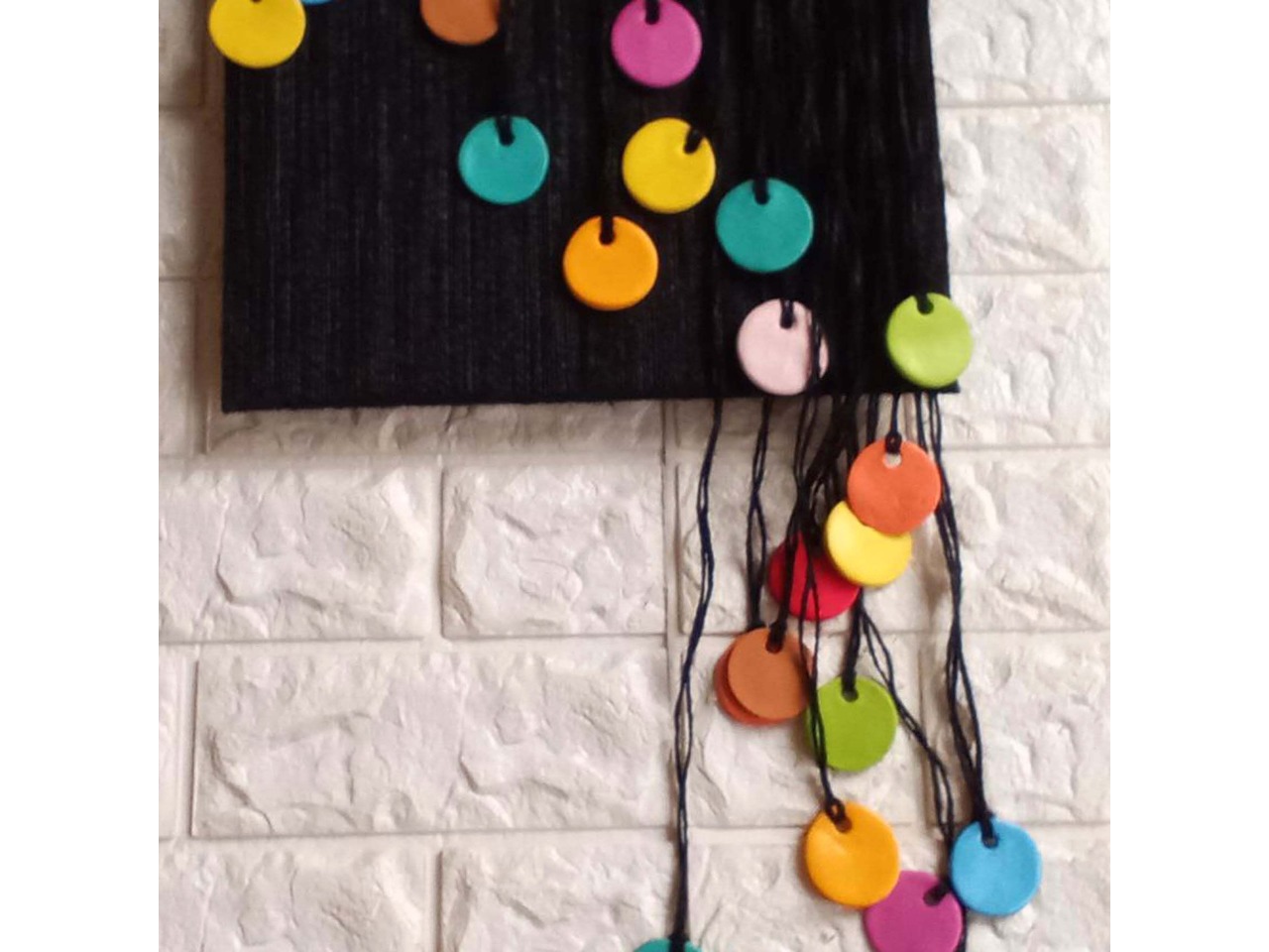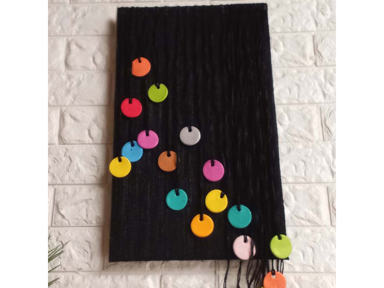 • Декор: керамічні «гудзики» різних кольорів, підвішені на чорні джутові нитки. Вони вільно рухаються, створюючи живу та динамічну композицію.