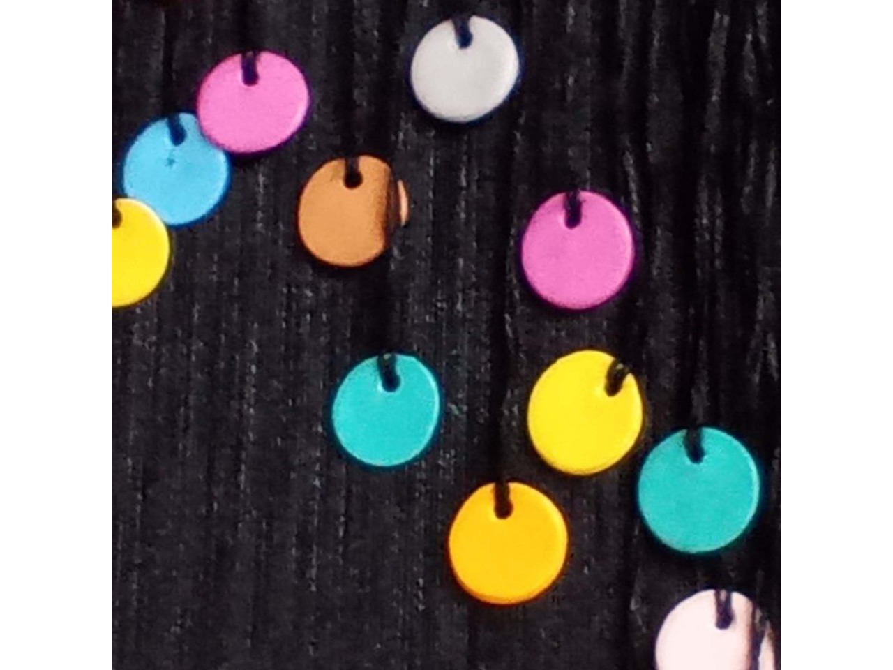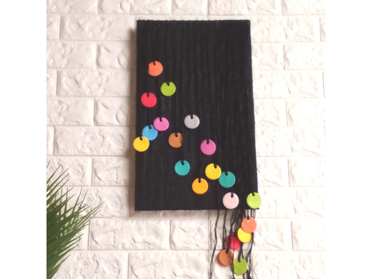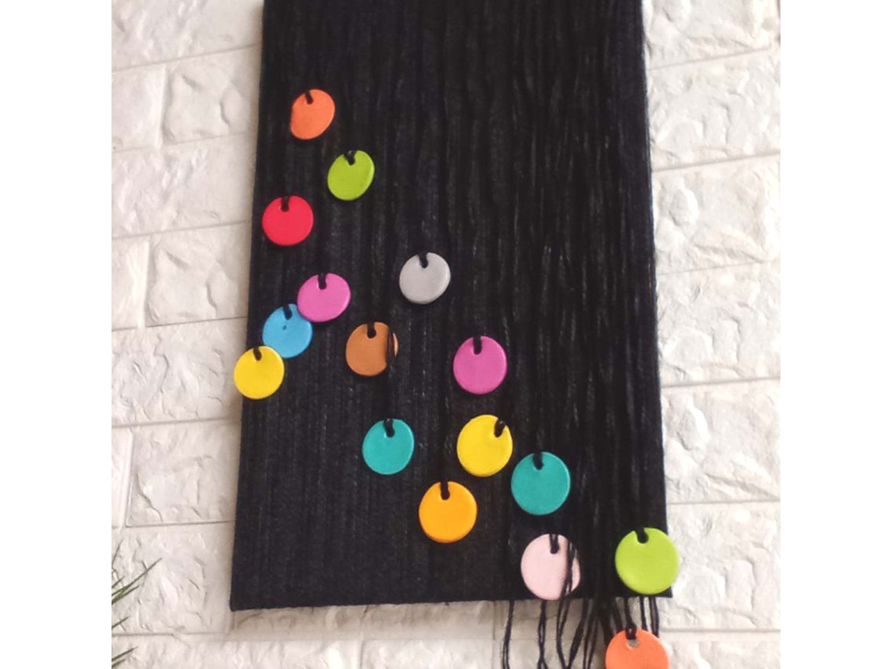 • Декор: керамічні «гудзики» різних кольорів, підвішені на чорні джутові нитки. Вони вільно рухаються, створюючи живу та динамічну композицію.