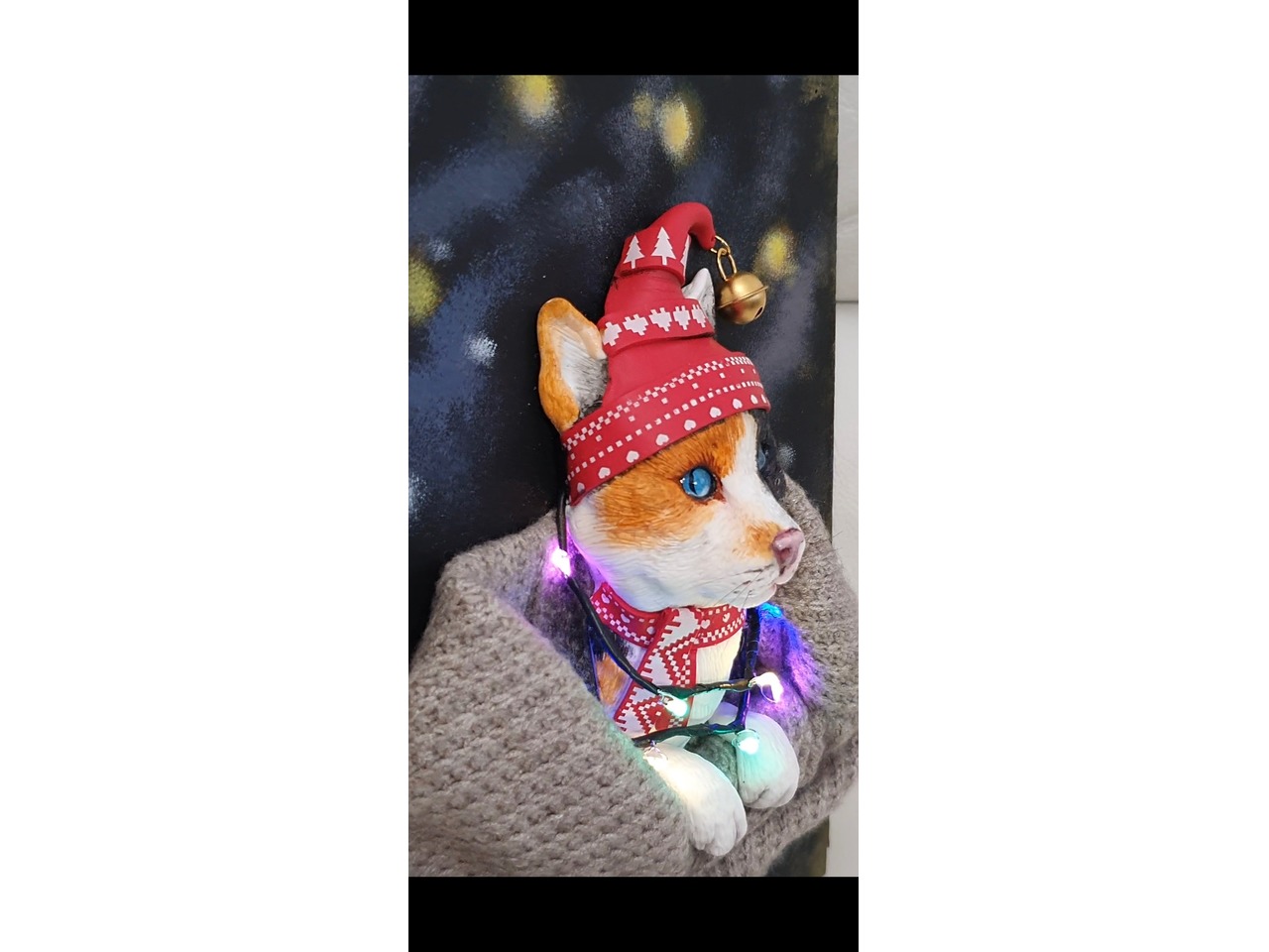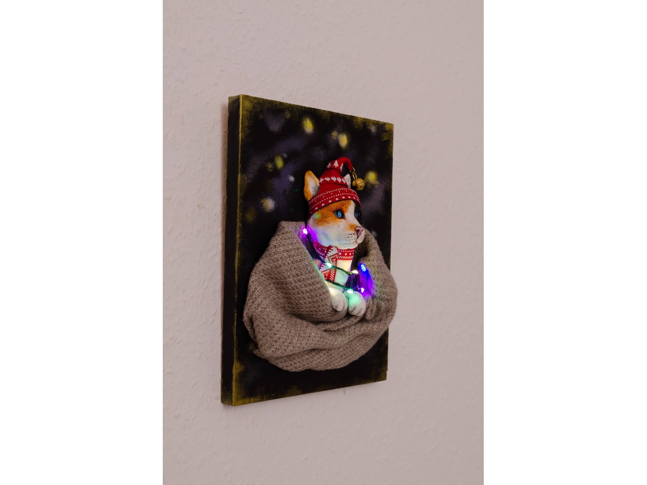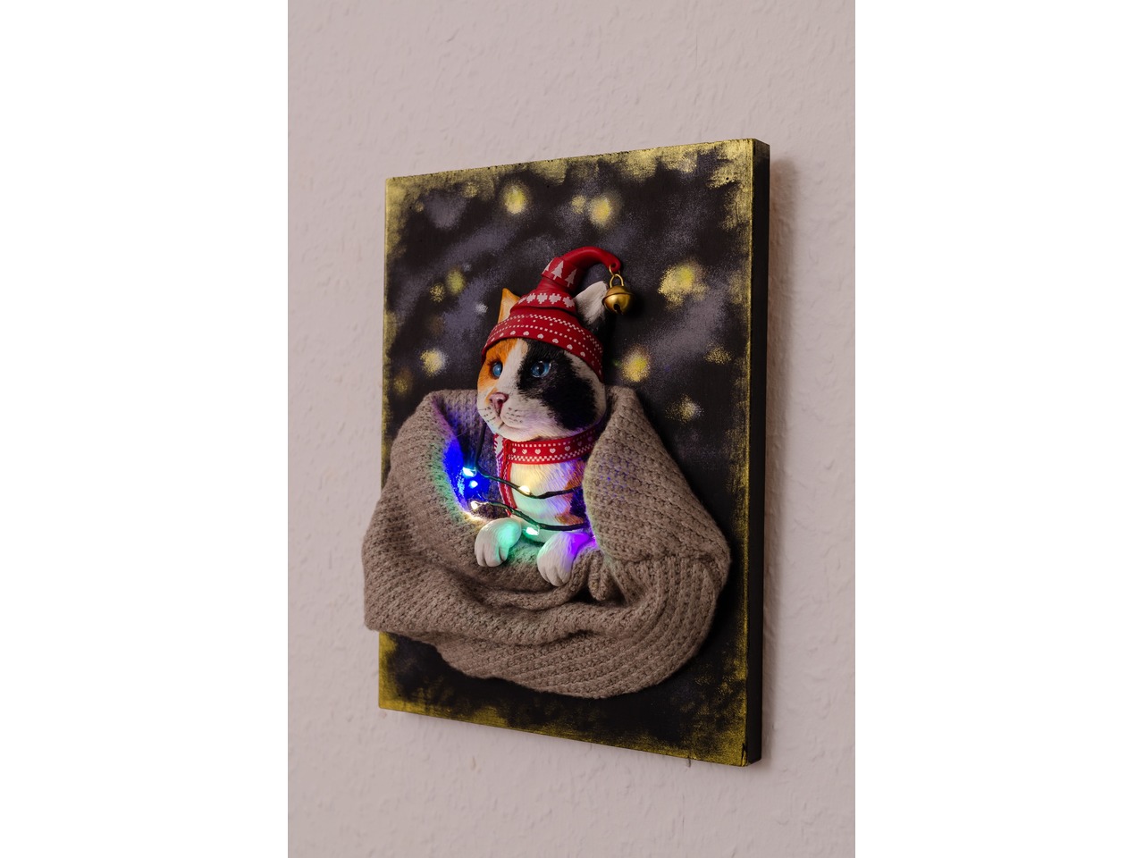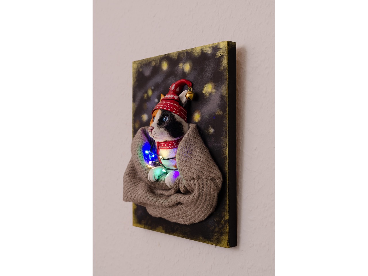 3Д панно в Рождественской тематике с котом . Полностью ручная работа из полимерной глины и ткани, живопись - акрил. Панно 20/24 см, имеет подсветку на батарейках.