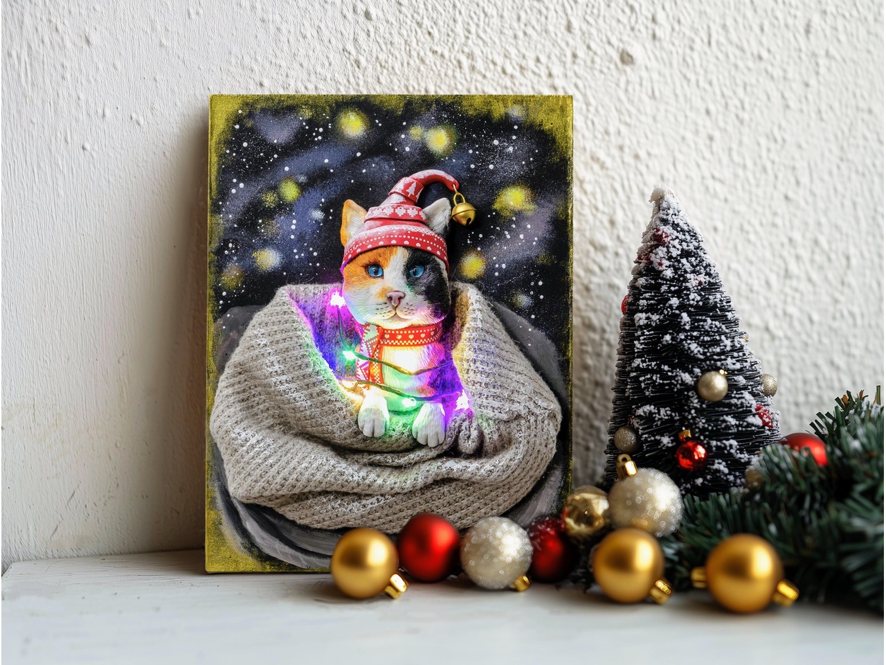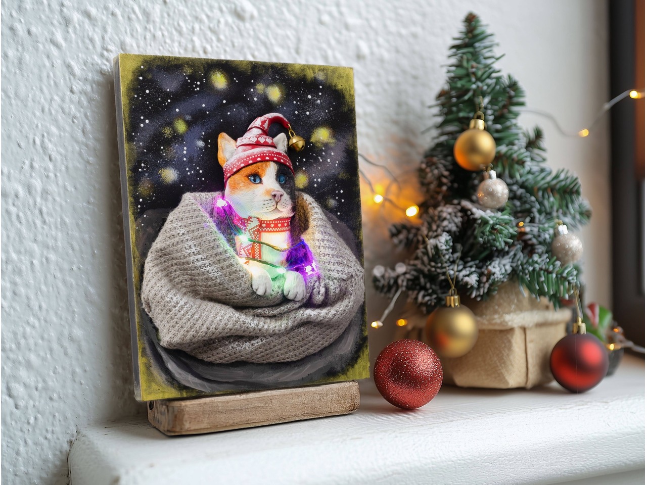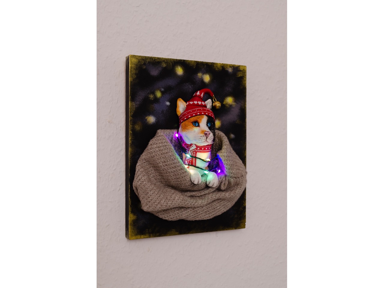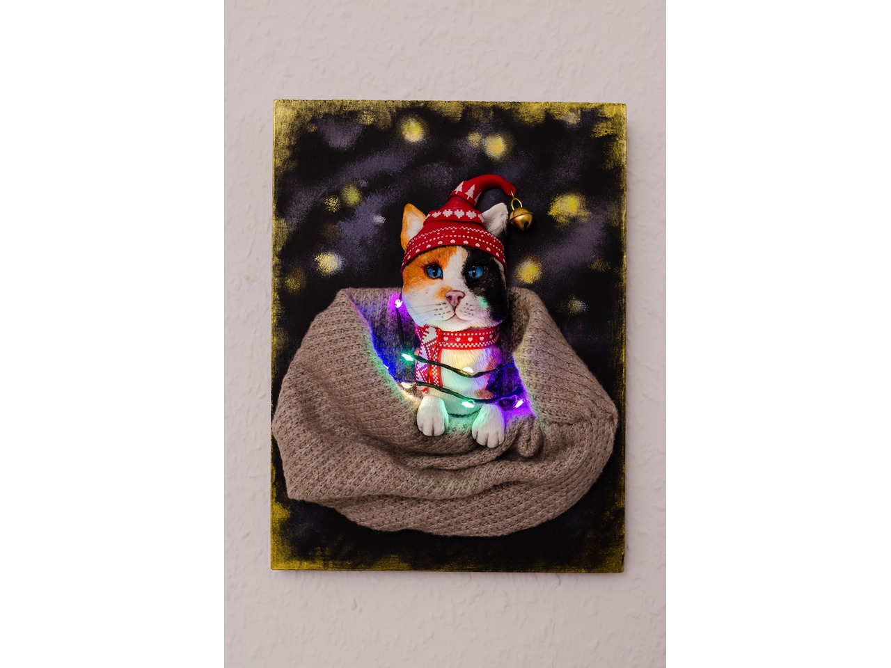 3Д панно в Рождественской тематике с котом . Полностью ручная работа из полимерной глины и ткани, живопись - акрил. Панно 20/24 см, имеет подсветку на батарейках.