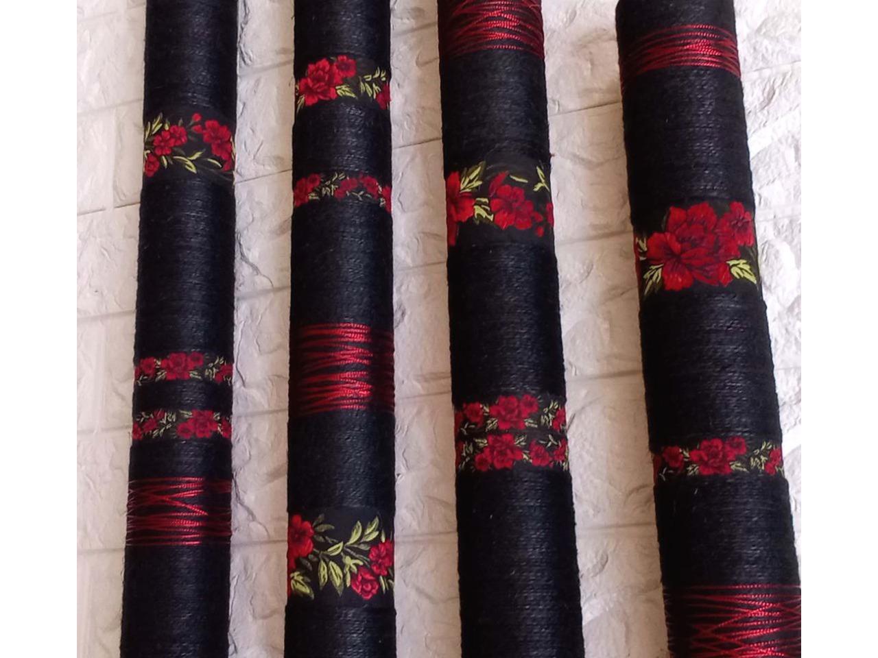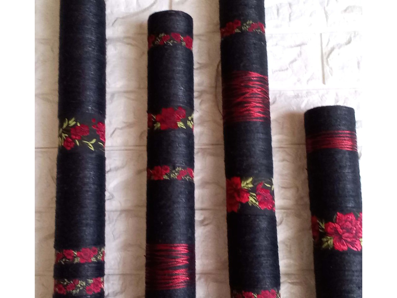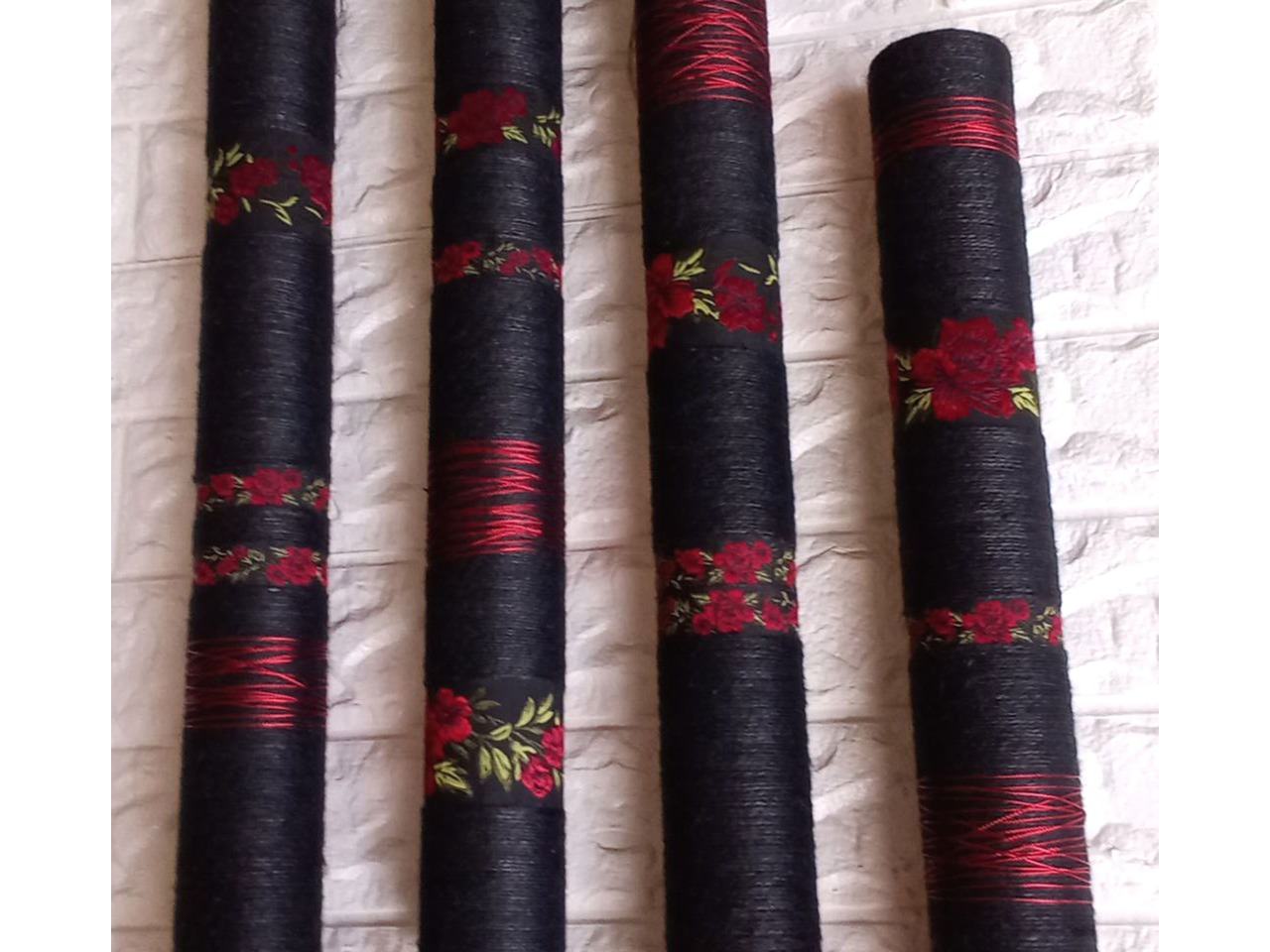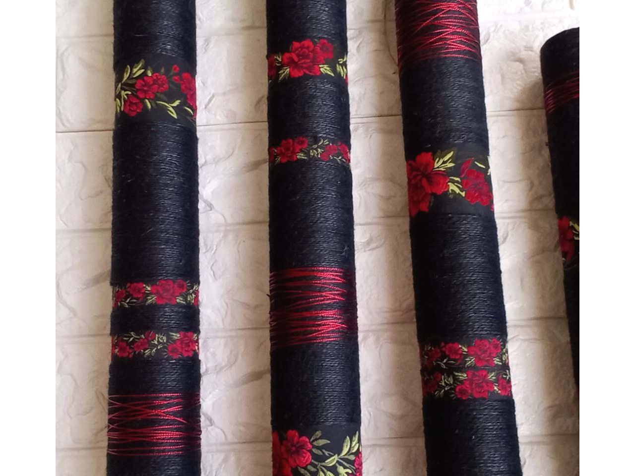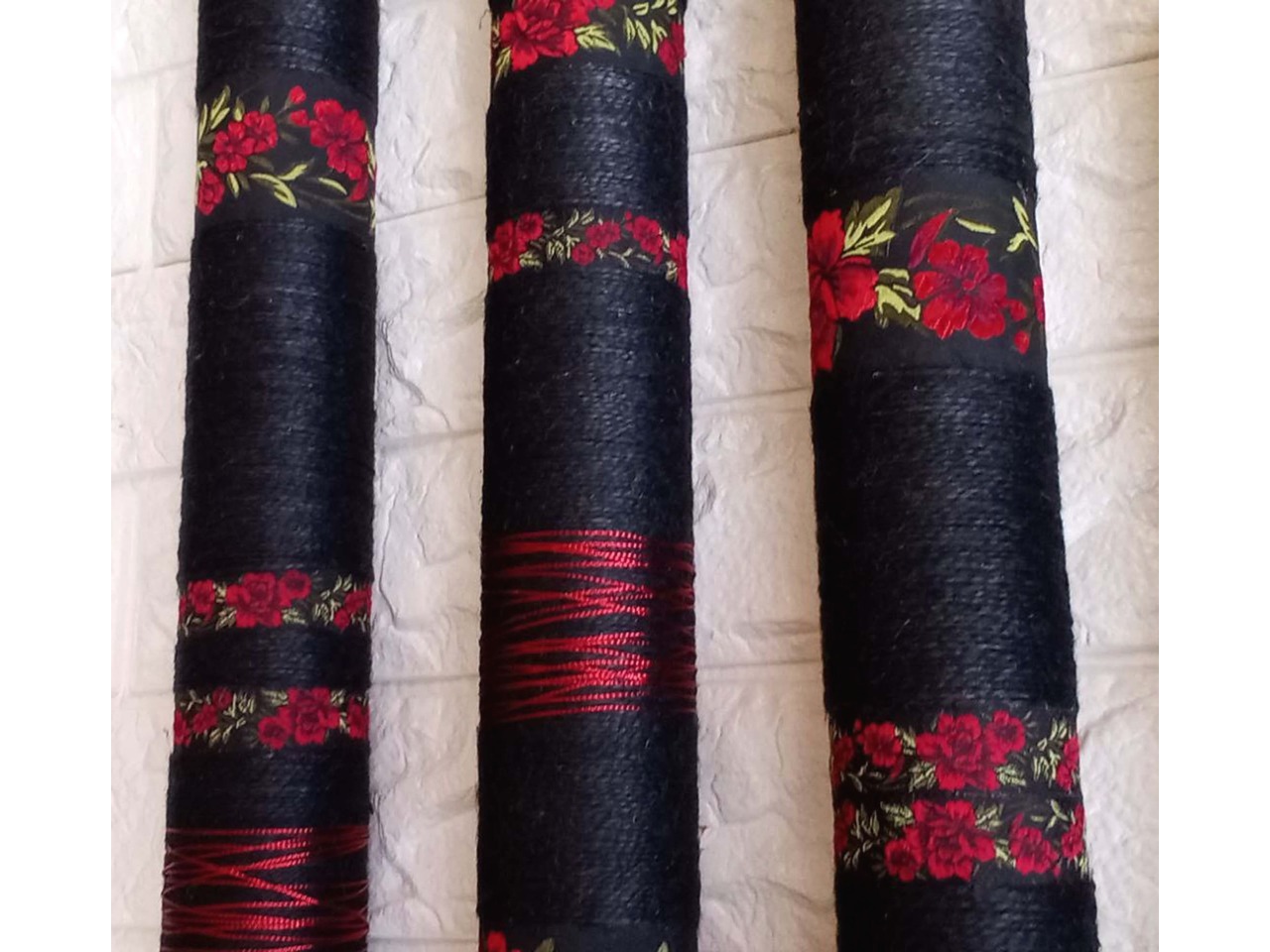 Кожен елемент оздоблений чорним джутовим шпагатом, жакардовою стрічкою з українським орнаментом та металізованою ниткою.