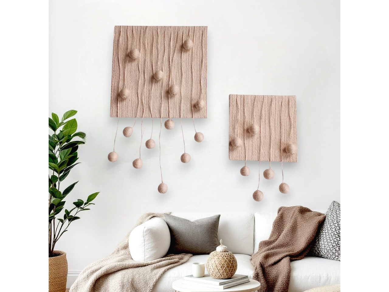 Стильний диптих «Кульки» у техніці fiber art стане оригінальною прикрасою вашого інтер’єру в стилі бохо чи мінімалізм.Картини виглядають ніжно та повітряно, створюючи акцент на природних матеріалах та ручній роботі.