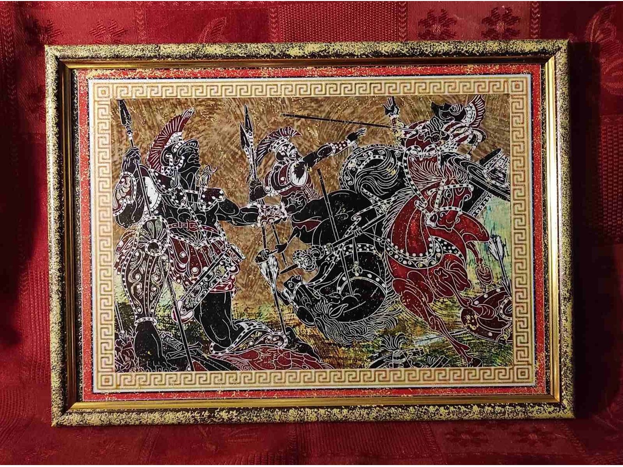 На данном панно изображена сцена сражения древнегреческих воинов Ахиллес,Троянская война, что характерно для росписи.Размер 31,5х22,8 см.