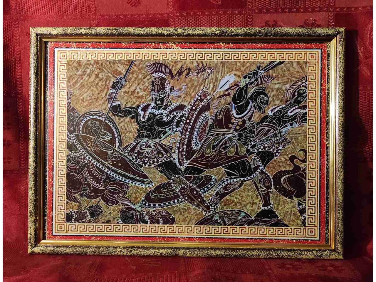 На данном панно изображена сцена сражения древнегреческих воинов-Ахиллес,Троянская война, что характерно для росписи.