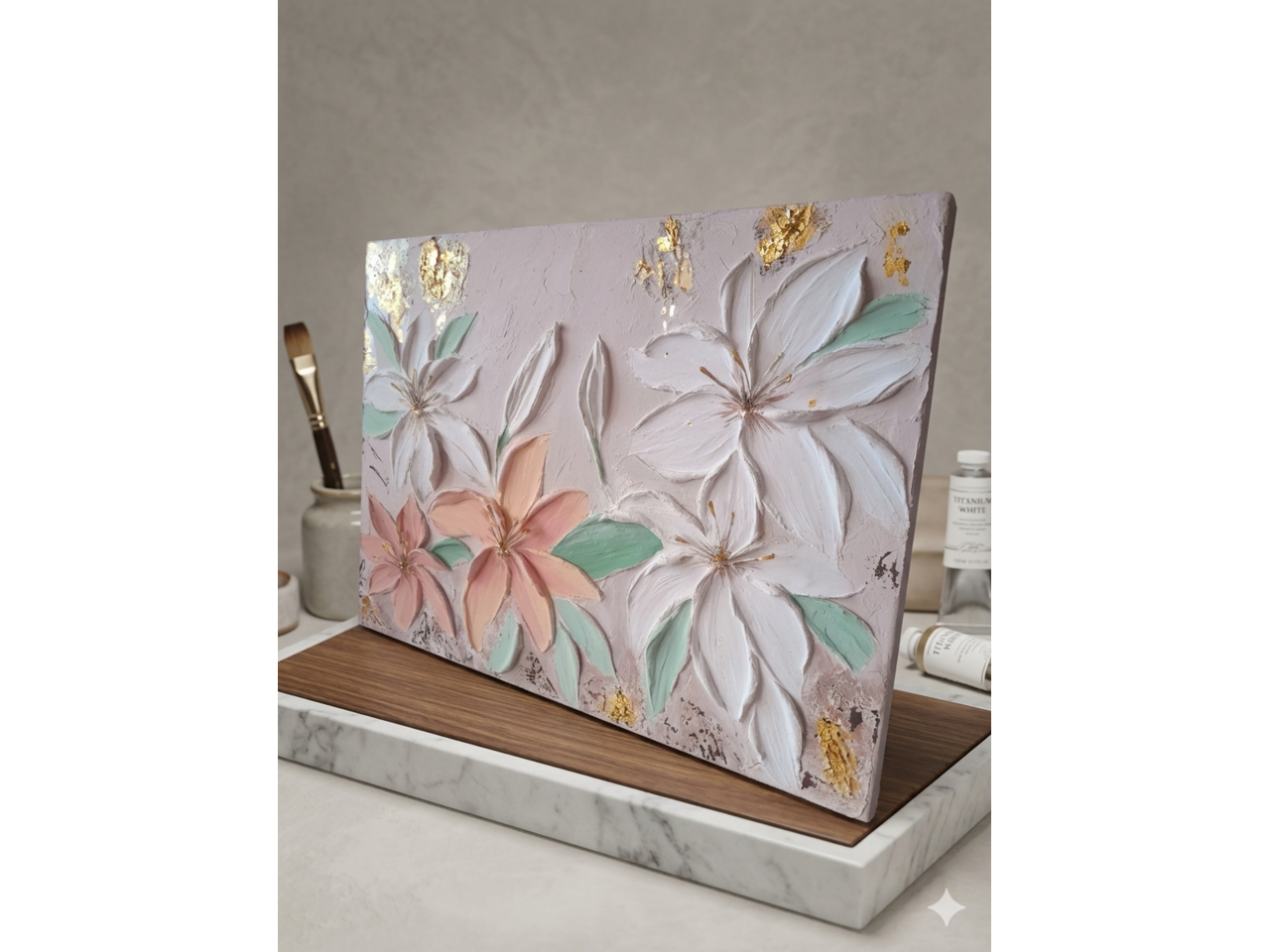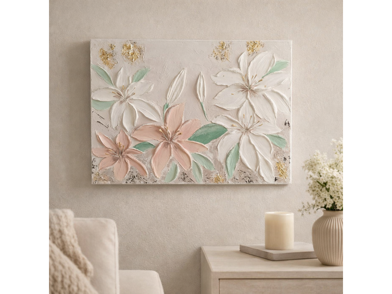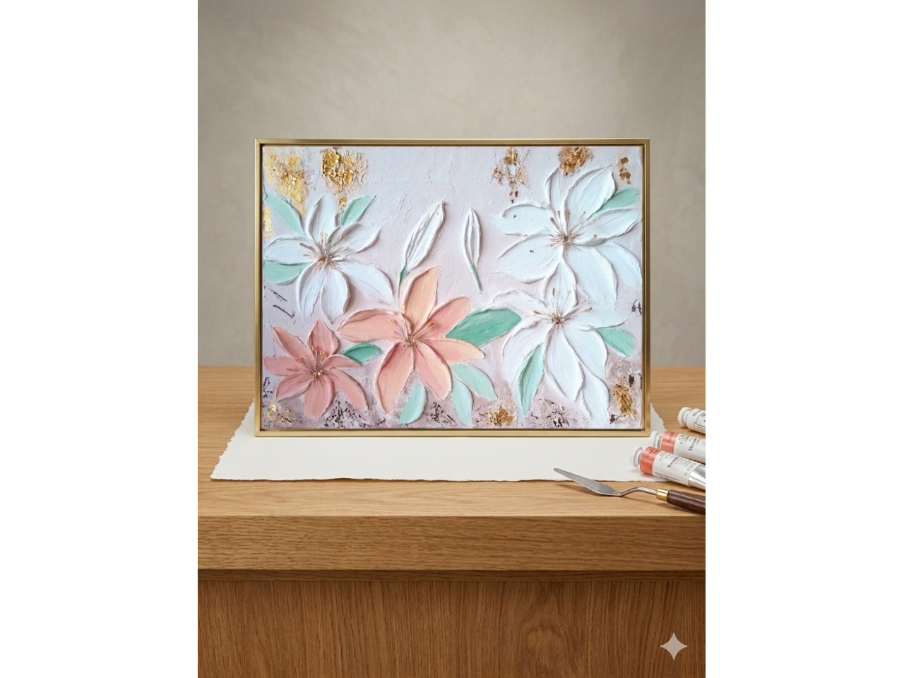 Ніжна об’ємна текстурна картина у техніці об'ємного живопису, що передає відчуття легкості, тиші та внутрішнього спокою. Квіткова композиція виконана в пастельних відтінках — м’який персик, білий та м’ятний — гармонійно поєднується із золотими акцентами, додаючи роботі вишуканості.Рельєфна текстура створює ефект “живих” пелюсток, які ніби виходять за межі полотна, додаючи глибини та сучасного характеру.