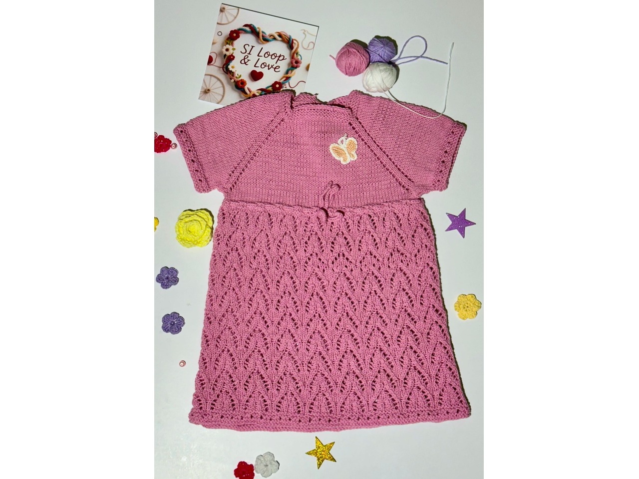 Нежное летнее платье, связанное вручную из качественной пряжи (55% хлопок, 45% акрил), идеально подойдёт для жарких дней. Мягкое, лёгкое и приятное к телу, оно обеспечит комфорт вашей малышке как в повседневной носке, так и на особых мероприятиях.Особое внимание привлекает декоративная аппликация в виде бабочки — яркий и милый акцент, который придаёт платью игривость и делает его по-настоящему девчачьим. Аппликация крепко пришита, безопасна и выполнена в ручной технике.