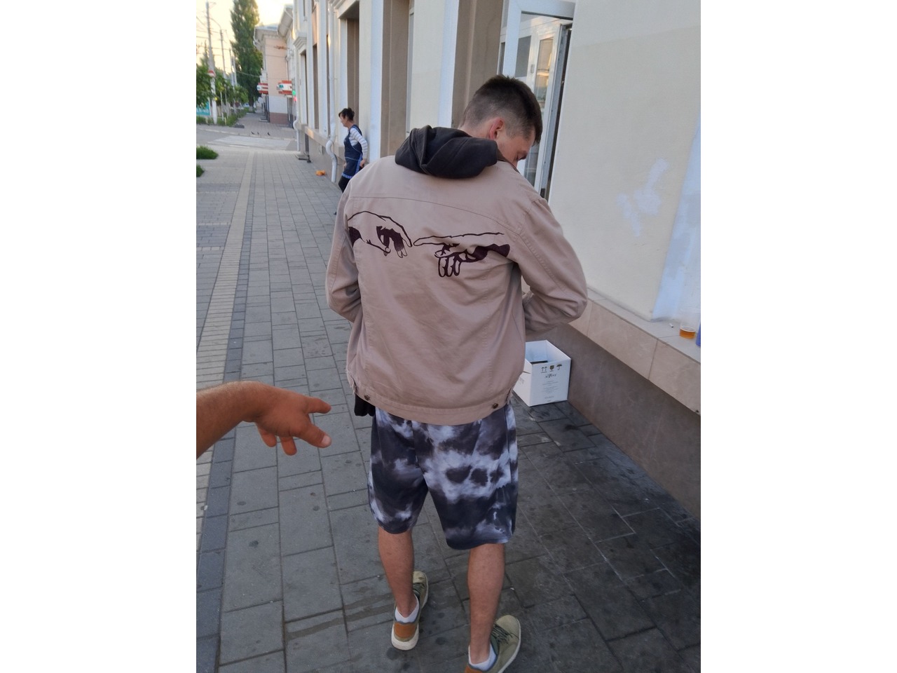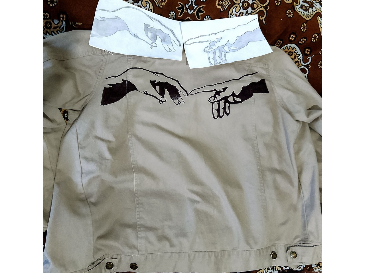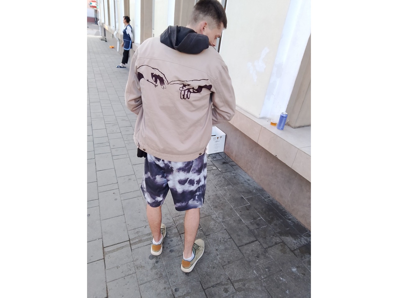 Лёгкая бежевая куртка с акцентом на спине: авторская ручная роспись двух рук из знаменитой фрески «Сотворение Адама». Работа выполнена текстильными маркерами и тщательно закреплена, чтобы выдерживать носку и стирки.Куртка подчёркивает уверенный, интеллектуальный стиль и создаёт образ мужчины, который выбирает не массовку, а вещи со смыслом. Лёгкий материал комфортен в межсезонье, а нейтральный беж делает куртку универсальной — сочетается и с классикой, и с уличным стилем.