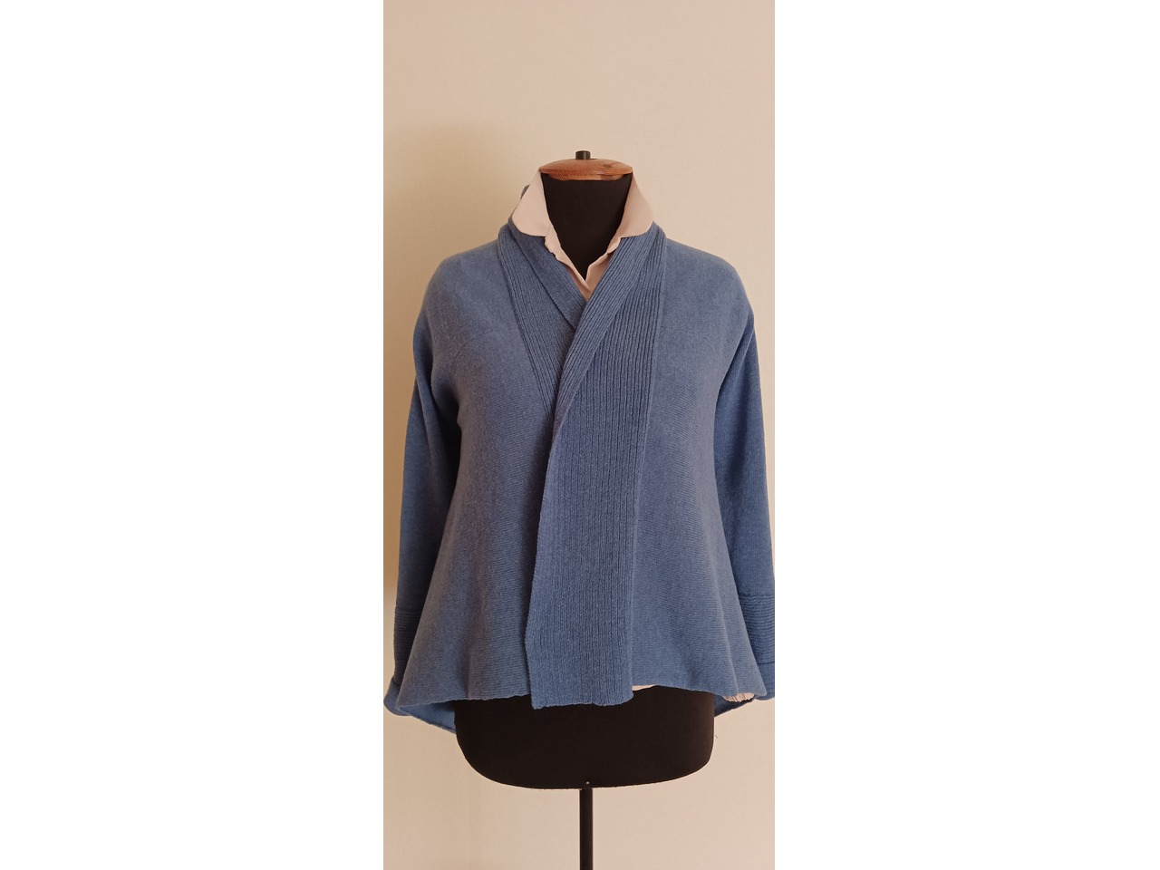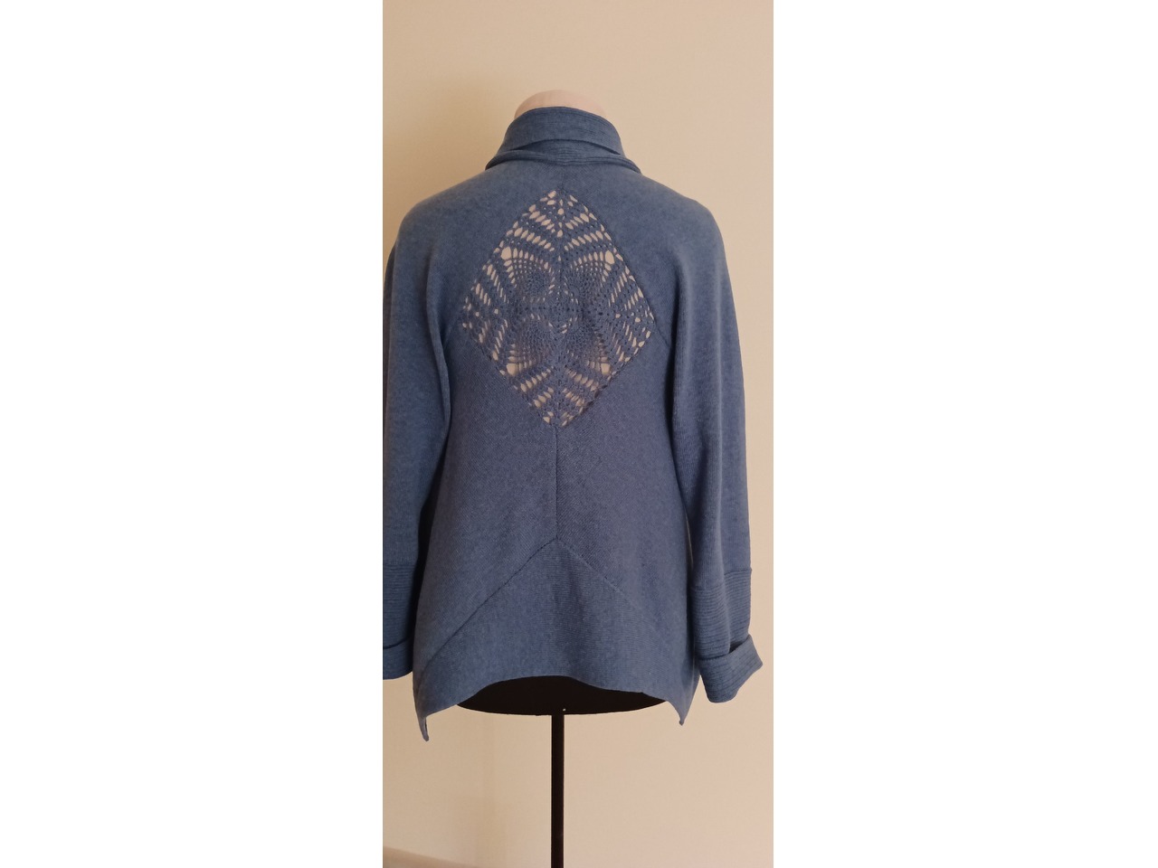 Тонкий, но теплий, бо створений з мериносової вовни з невеликою кількостю акрилу, для носкості. У верхній частині спинкі ажурна фантазійна квітка, комір м'яко огортає шию, як шарф. Знизу рукавів є частина, якою можна скоротити або подовжити їх. Низ кардигану спереду- коротше, з заду- довше, з куточками. Носити ,рекомендую , на світлу, одно кольорову блузу з маленьким комиром. Для жіночої стати зрістом від 164 до 170 см. та об'емом грудей від 104 до 110 см. Для цієї весни!