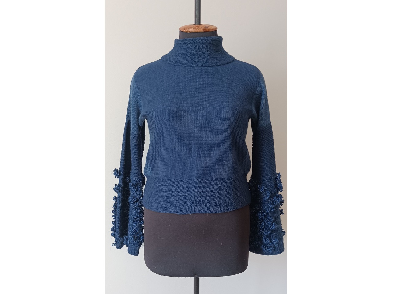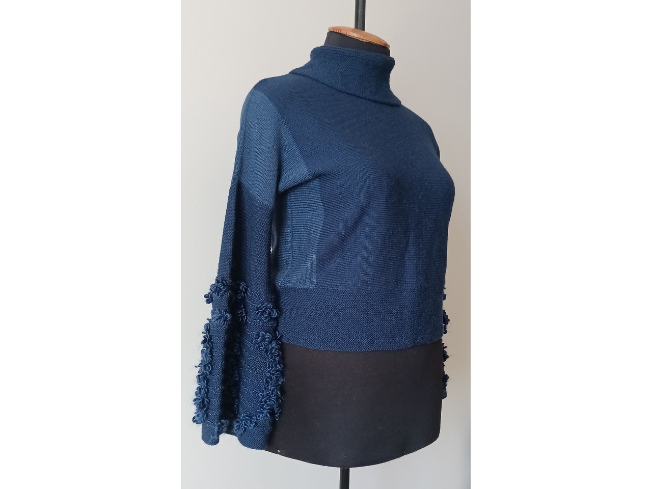 Дуже зручний, теплий, м'який, з дизайнерським рішенням рукавів. Комір добре зберігає форму . Широка планка по низу светра припадає на рівень стегон. Колір- синій, бокові вставки- синій світліший. Добре підійде до широкої спідниці або класичних штанів.