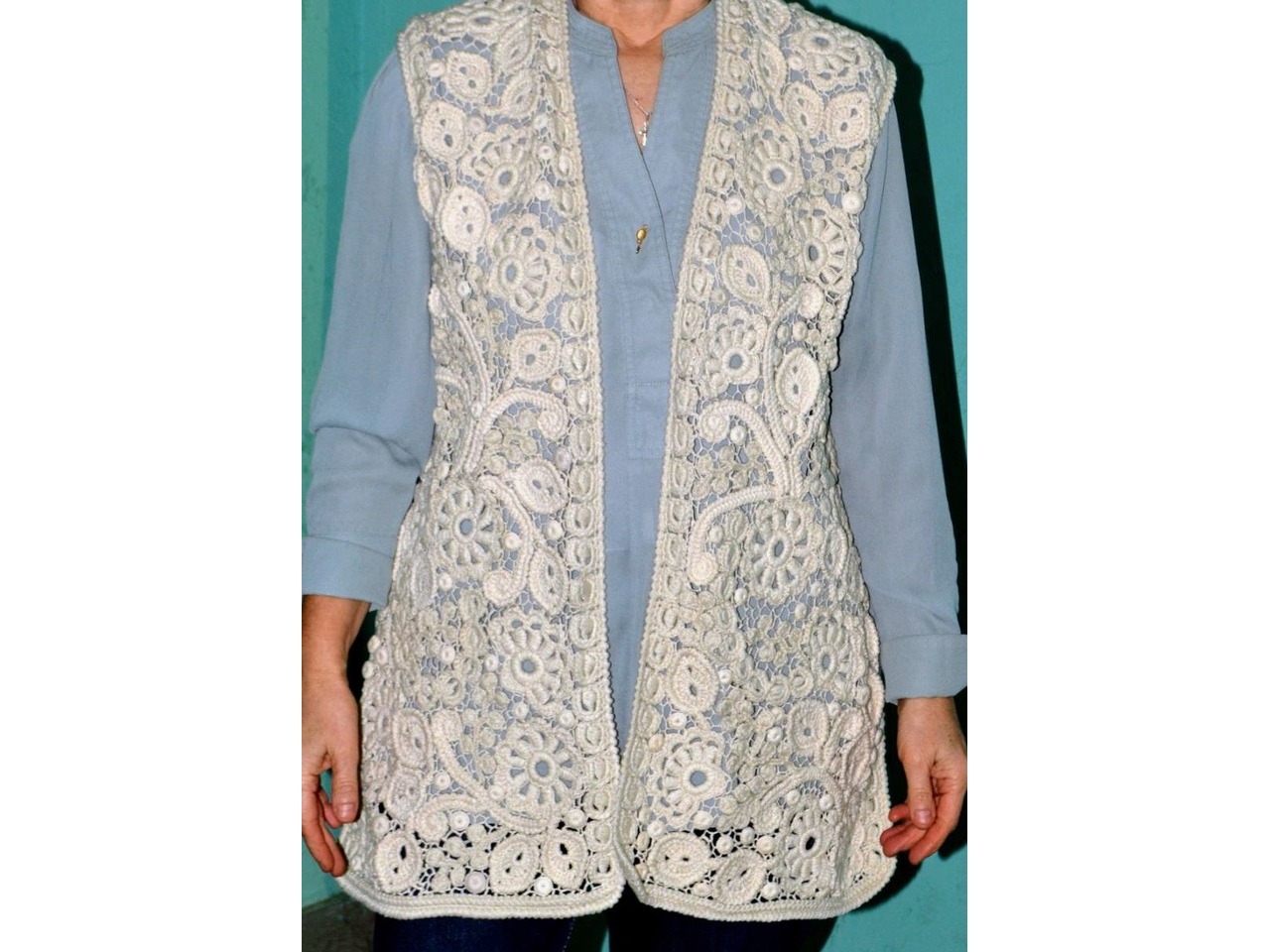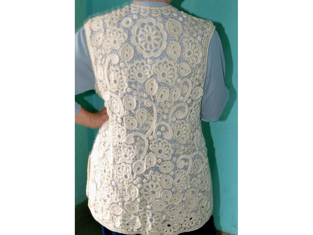 Авторська робота. Жилет зв'зан в техніці Ірландське мереживо з пряжі напіввовни.Підходить для офісу, прогулянок містом, зустрічей з друзями та свята.Цей жилет стане універсальною основою для вашого осінньо-зимового гардеробу