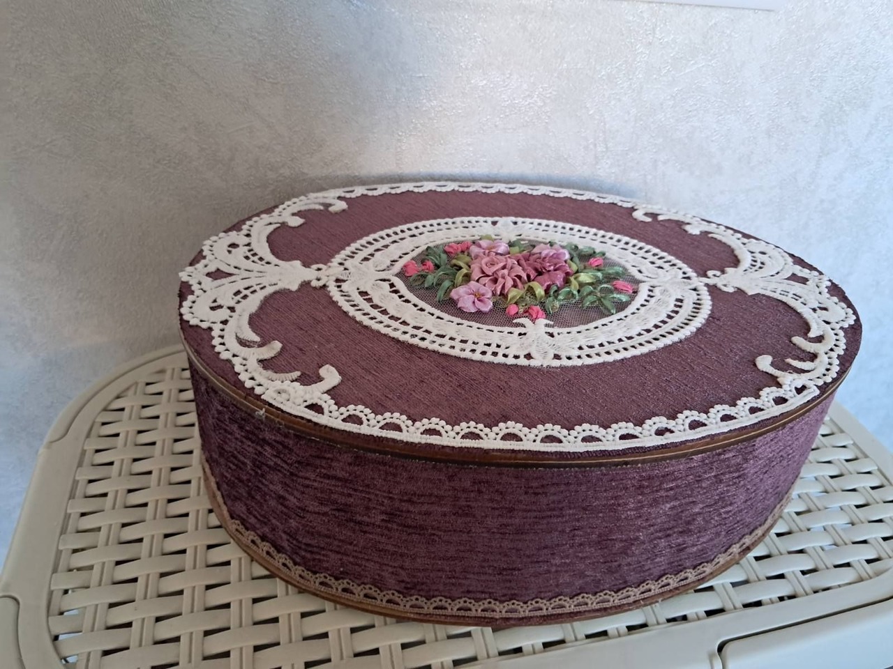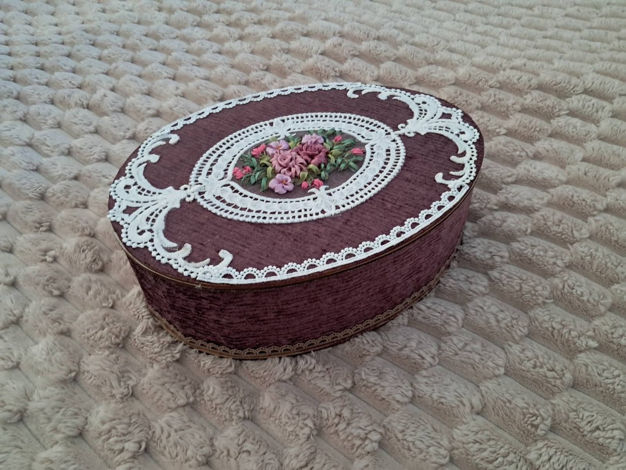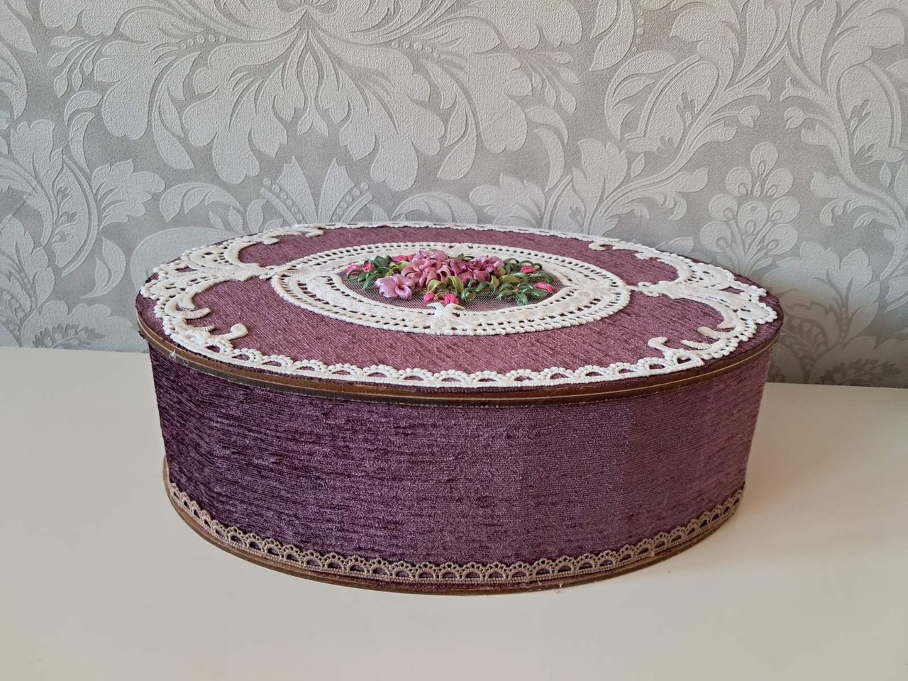 Скринька дерев′яна,декорована тканиною бордового кольору, оздоблена мереживом і вишивкою стрічками.Така річ ручної роботи - чудовий подарунок для жінок, які захоплюються рукоділлям. Розмір 25*20см.