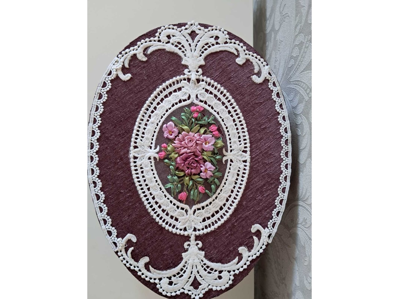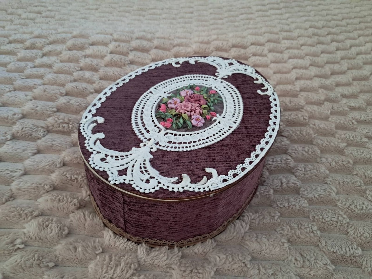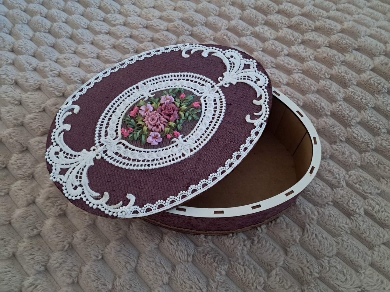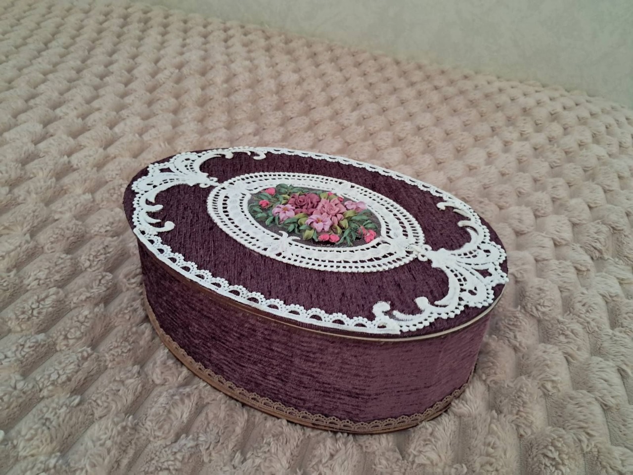 Скринька дерев′яна,декорована тканиною бордового кольору, оздоблена мереживом і вишивкою стрічками.Така річ ручної роботи - чудовий подарунок для жінок, які захоплюються рукоділлям. Розмір 25*20см.