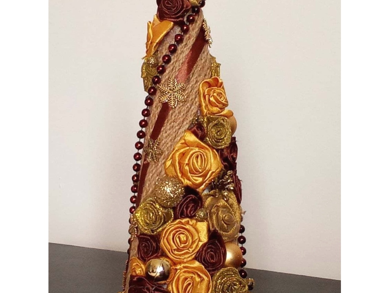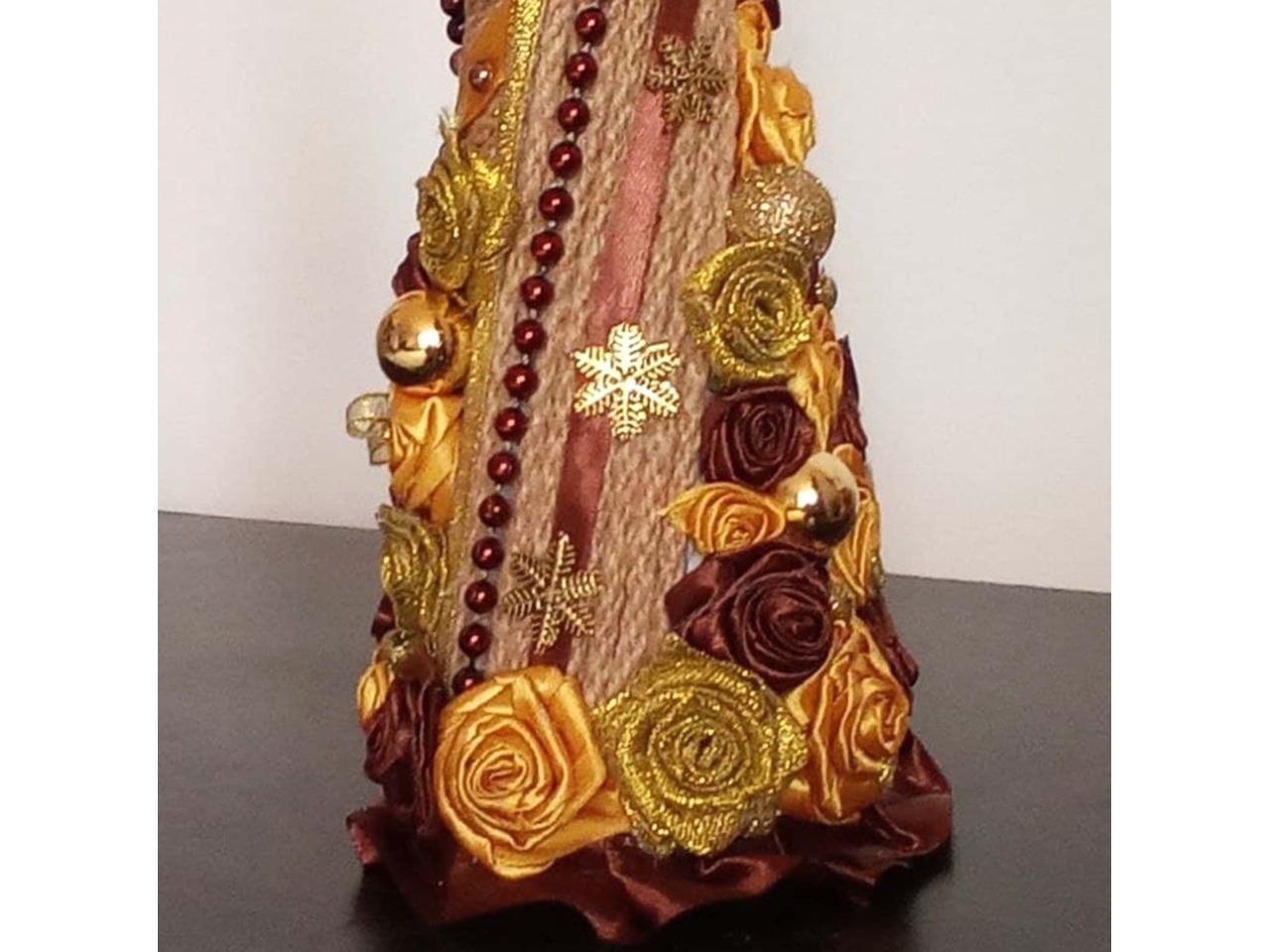 • оздоблення: троянди з атласної стрічки та органзи у жовтих, золотистих і коричневих відтінках